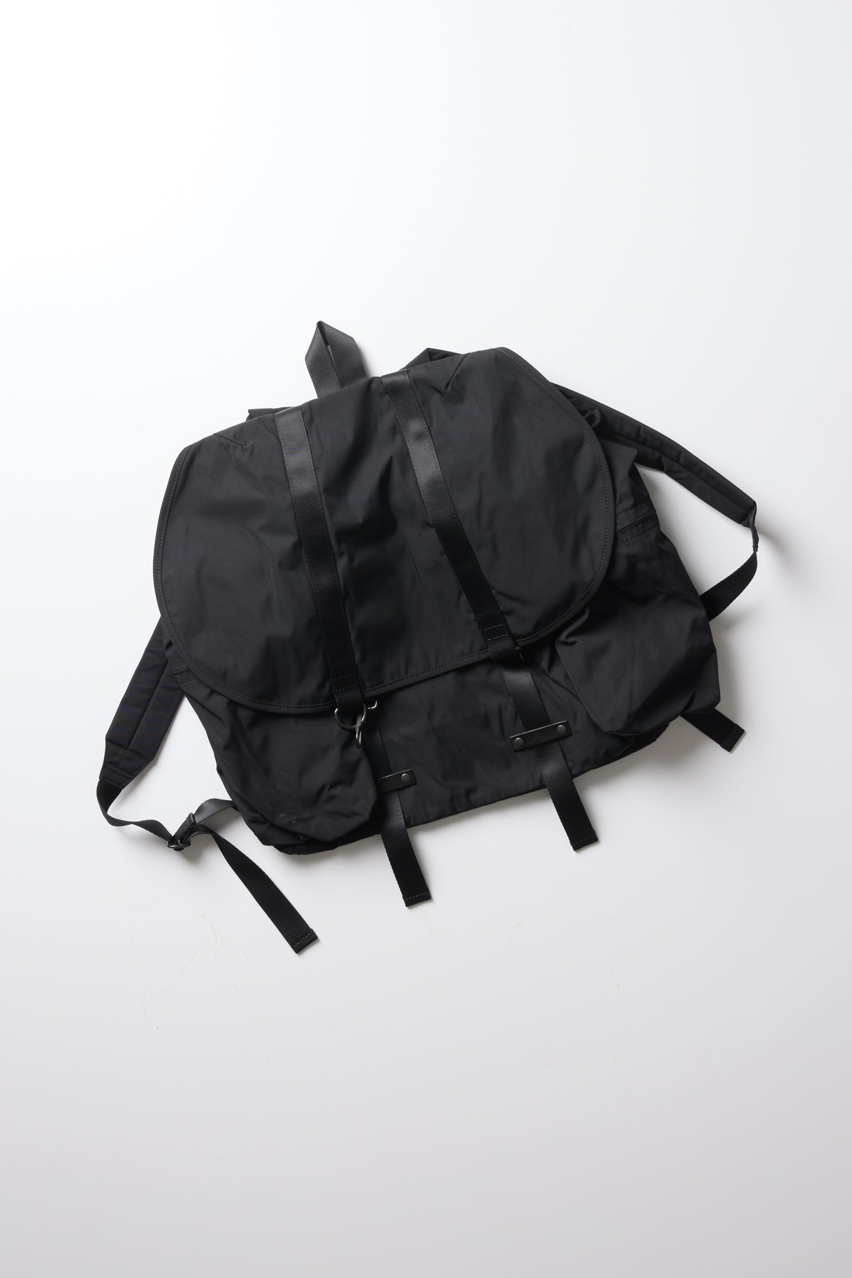 XL Gabardine Backpack by AMIACALVA. A practical, lightweight backpack made from smooth, durable, and water-resistant gabardine. Signature backpack with adjustable cushioned shoulder straps, two exterior pockets, two side pockets, a drawstring closure, three internal pockets and has several zippered secret pouches. Made in Japan. SIZE ー W : 50cm / H : 44cm / D:16cm