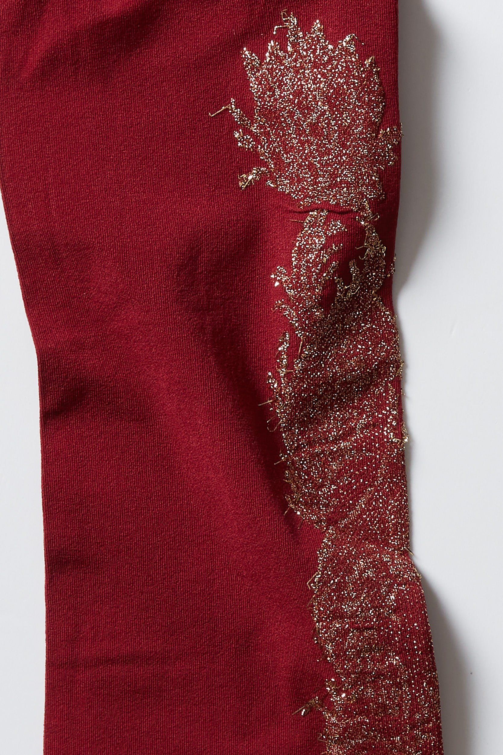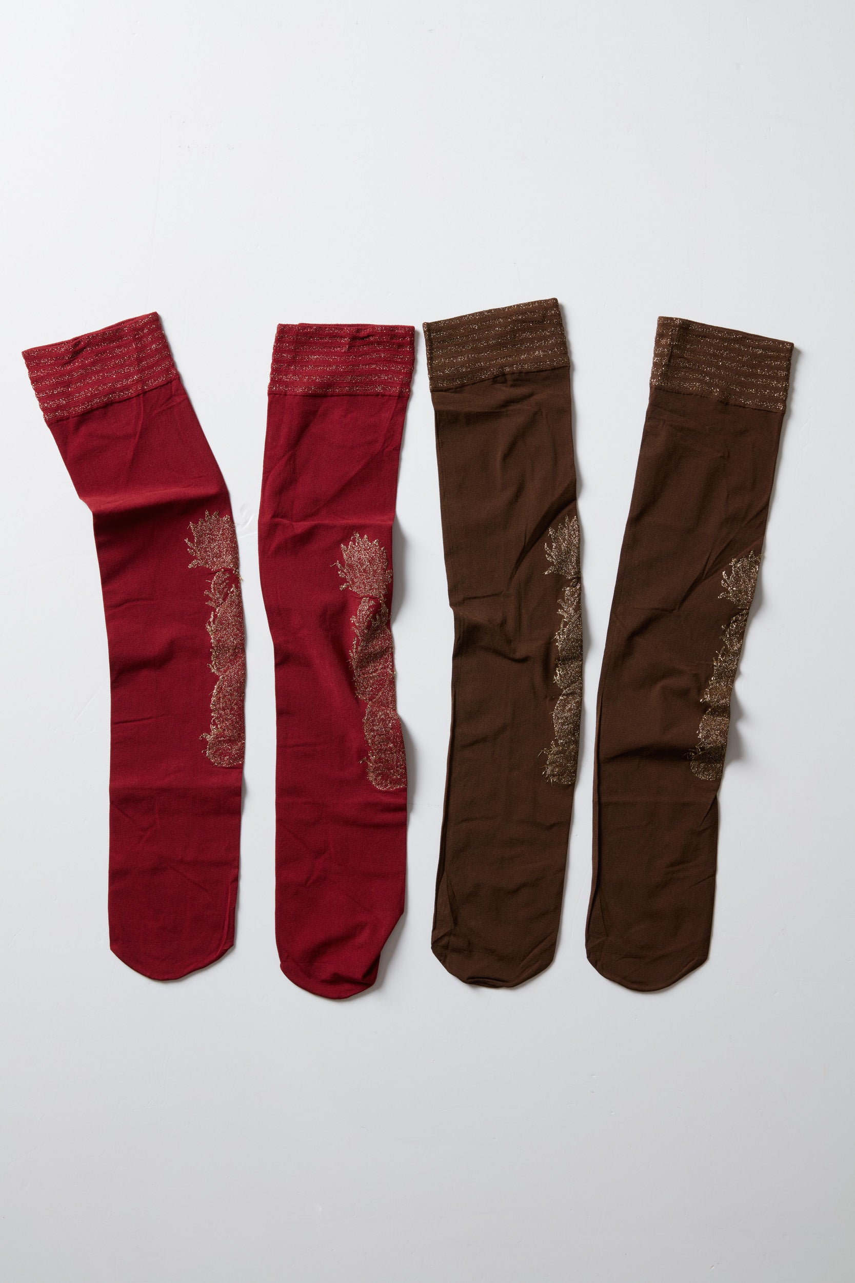 Gold Detail socks from the house of Chinse designer Uma Wang. Thin and elastic calf-high socks with a golden metallic embroidery and a striped opening.