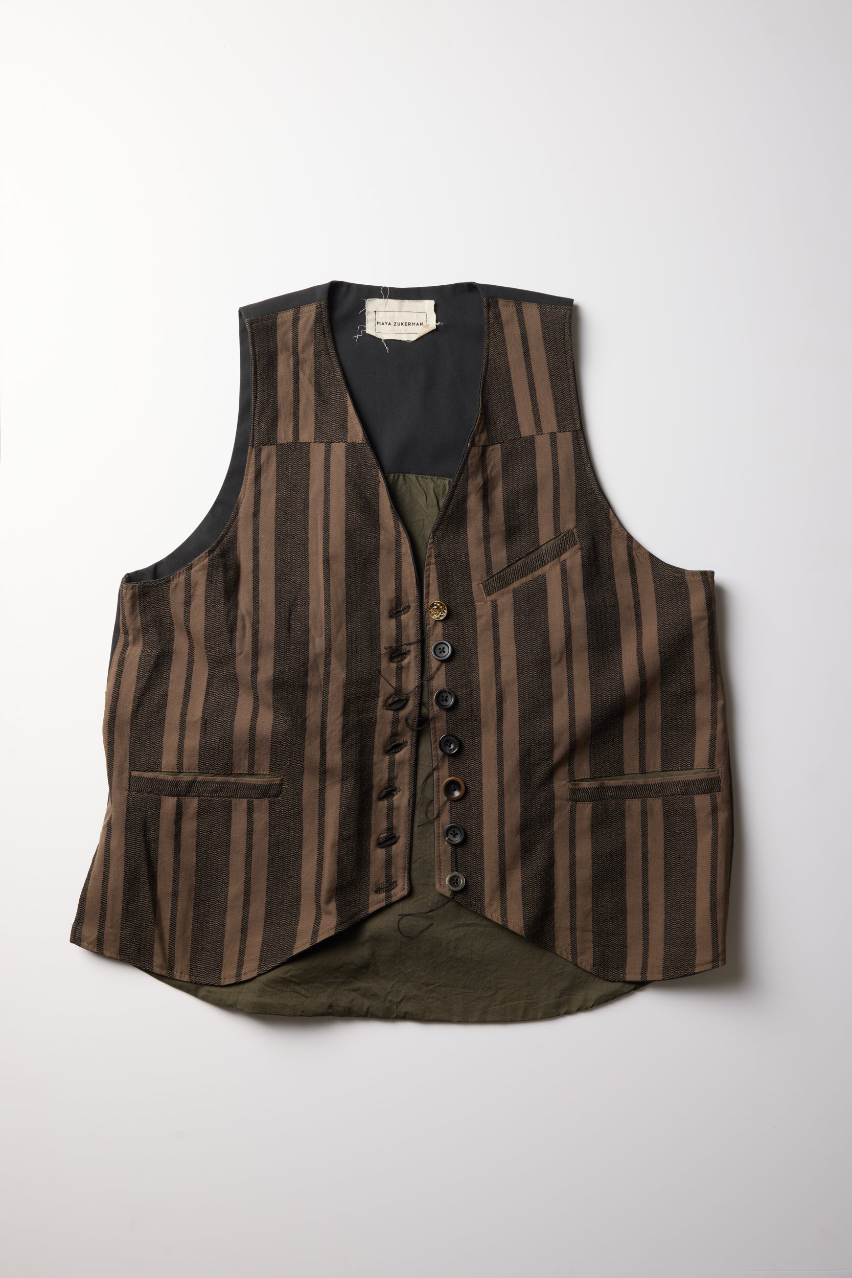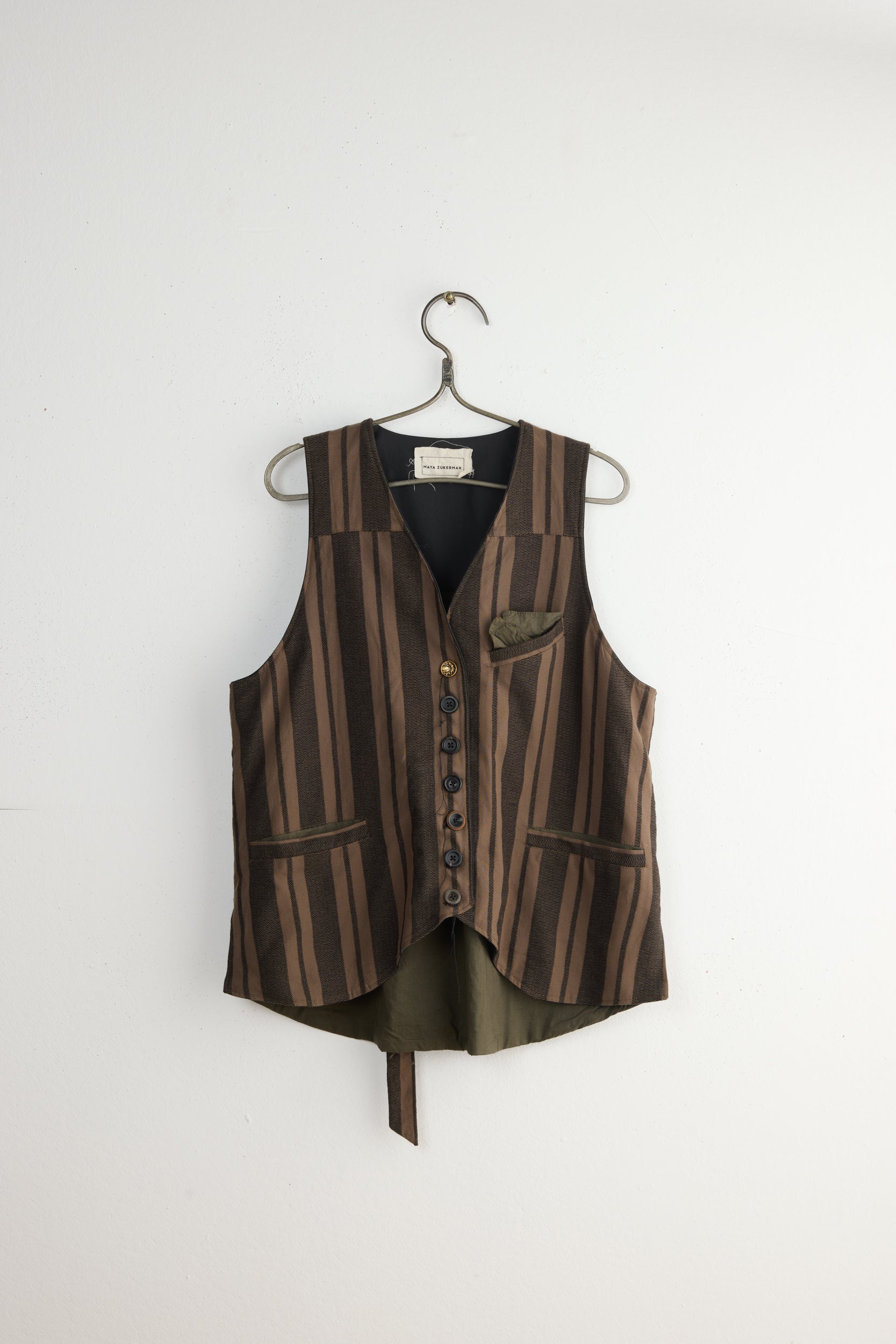 Heathcliff waistcoat by Maya Zukerman. A one of a kind vest made from up-cycled wool with striped pattern. Relaxed, slightly long silhouette with mismatched vintage buttons, hand stitched lopsided button holes and visible thread details. It has three welt pockets, rounded lining and ribbon fastening at the back. Very limited stock, each piece is slightly different and unique.