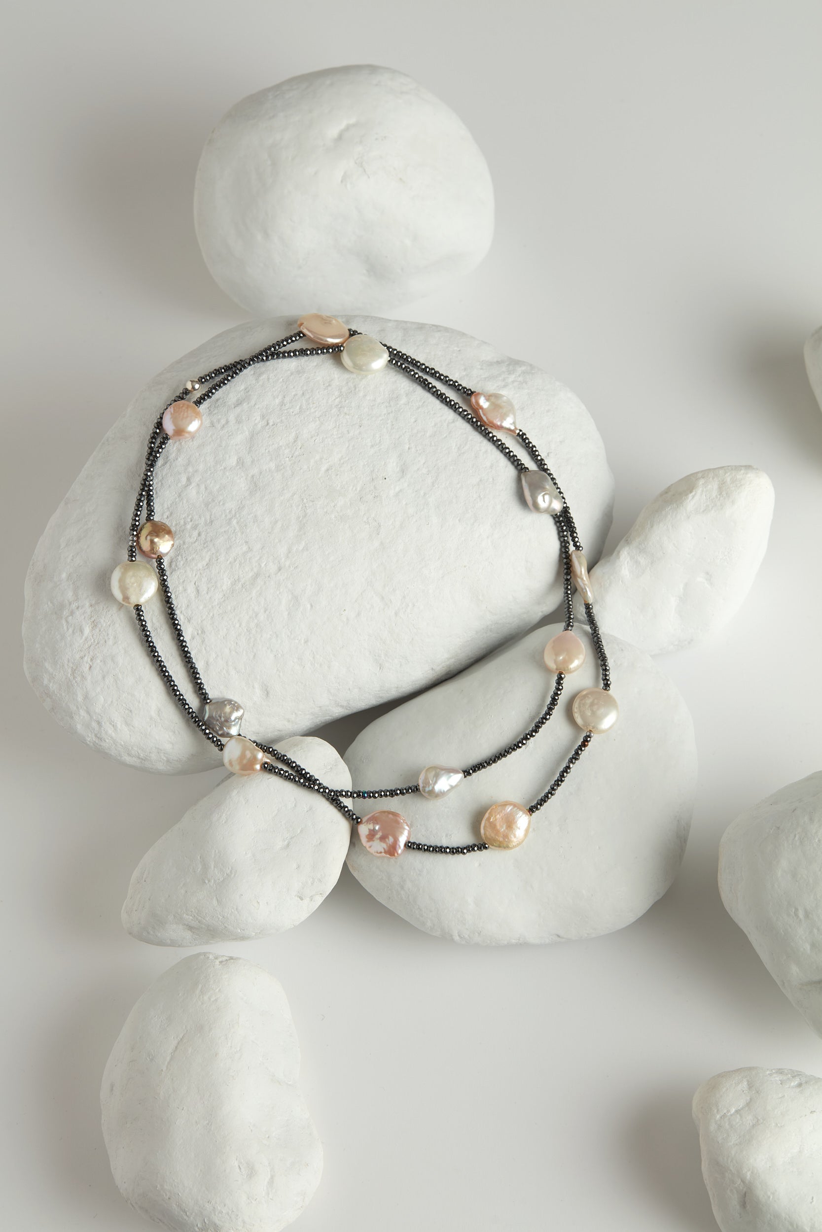Freshwater baroque AA+ pearls, Hematite, waxed thread, Made in Tel-Aviv.