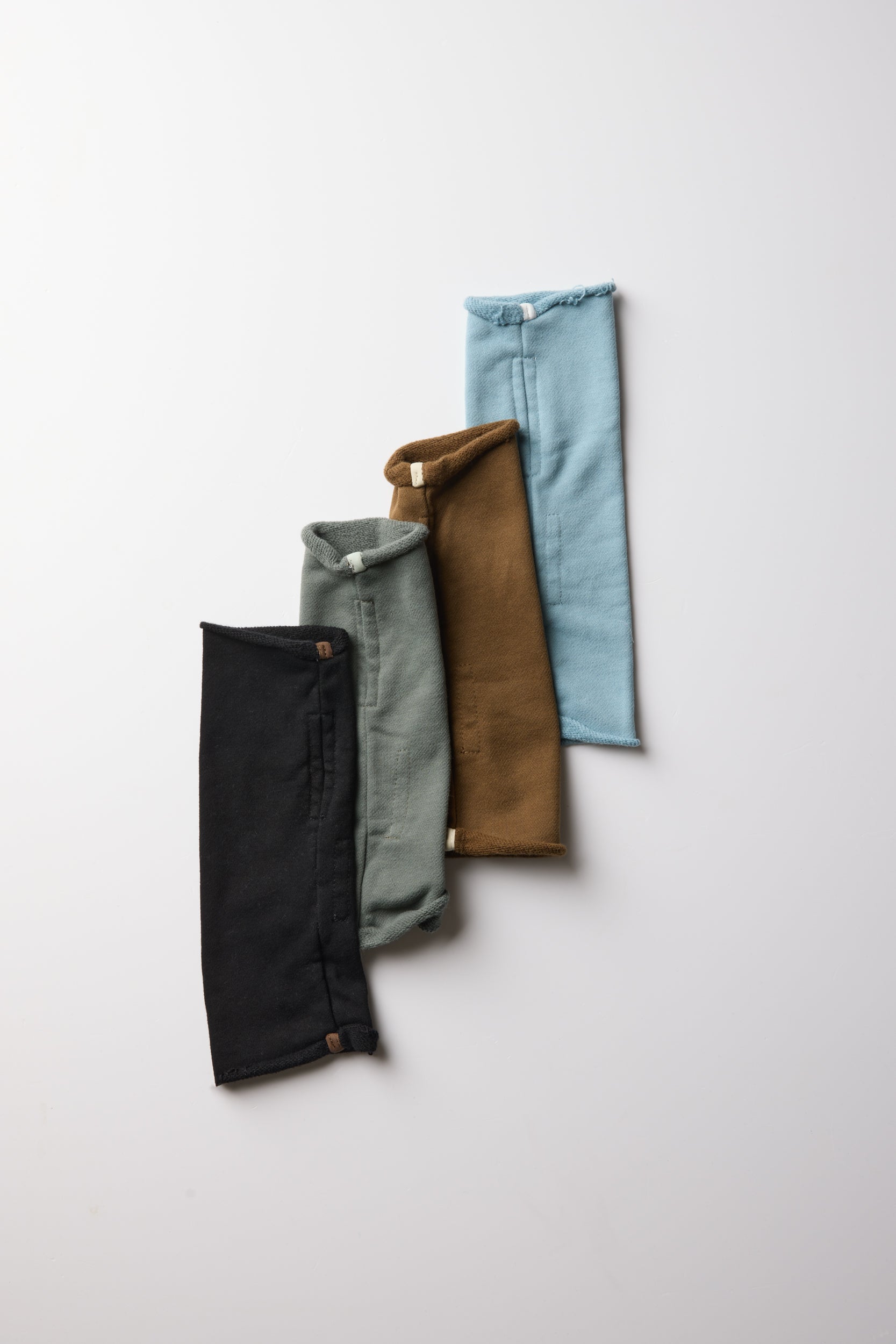 Laurel gloves by Maya Zukerman. Soft fingerless gloves made from 100% Japanese cotton footer. Unlined with a Thumb hole, a rolled trim and colorful ribbon finish. We love wearing it with the matching Hardy hat and Lina pullover.