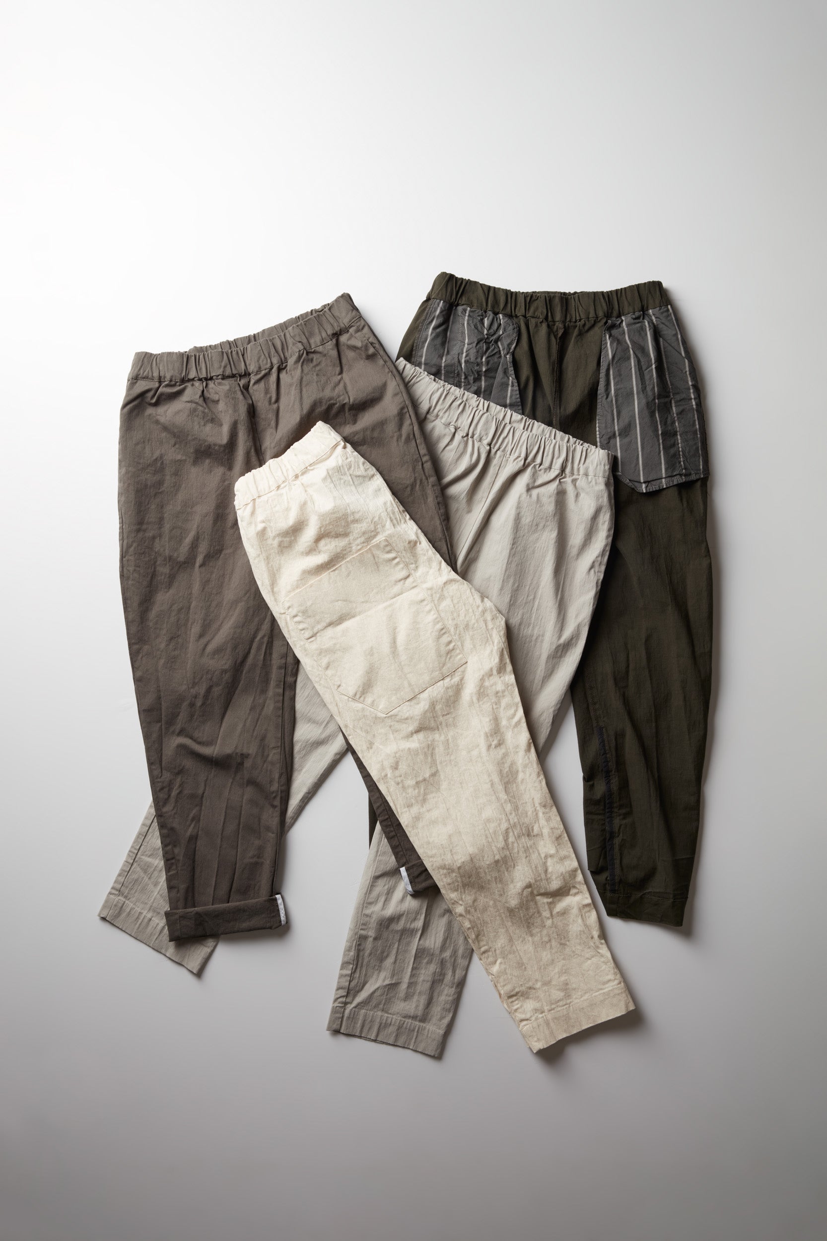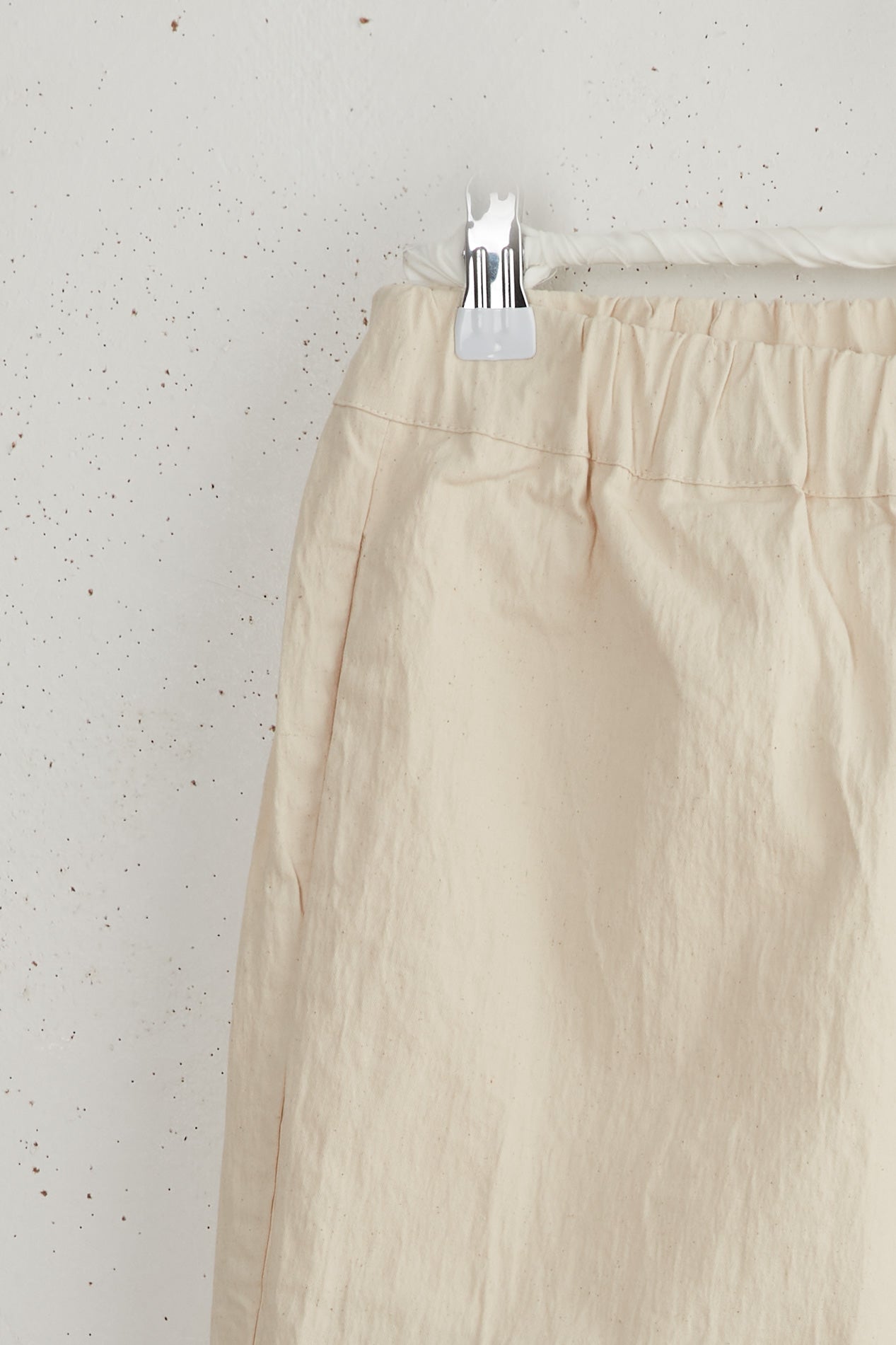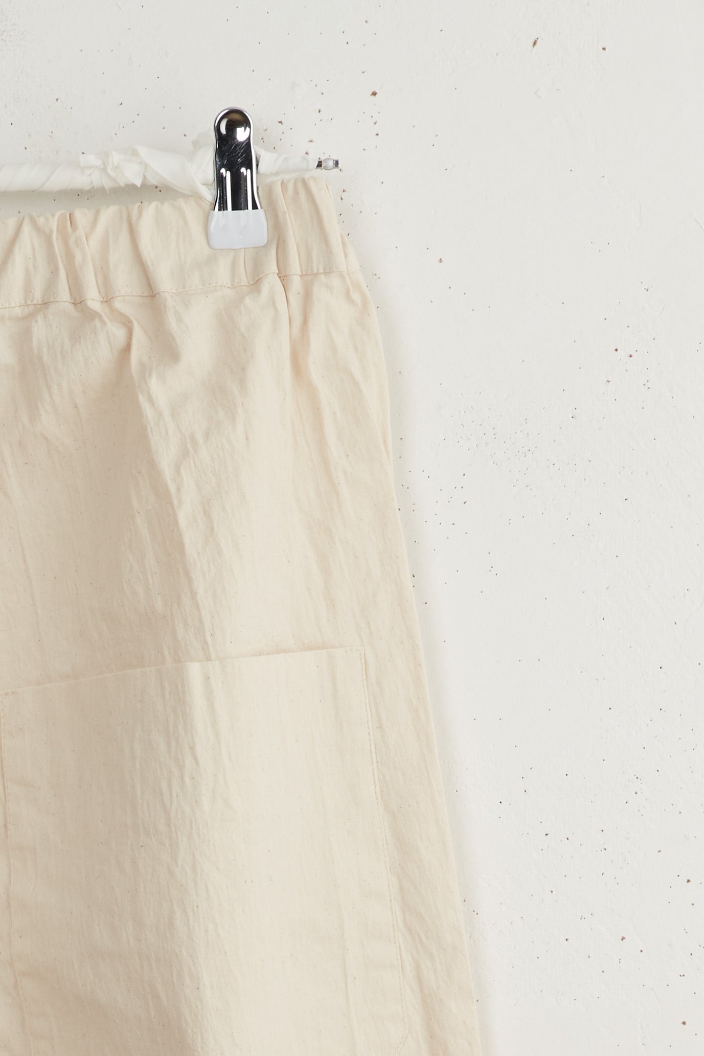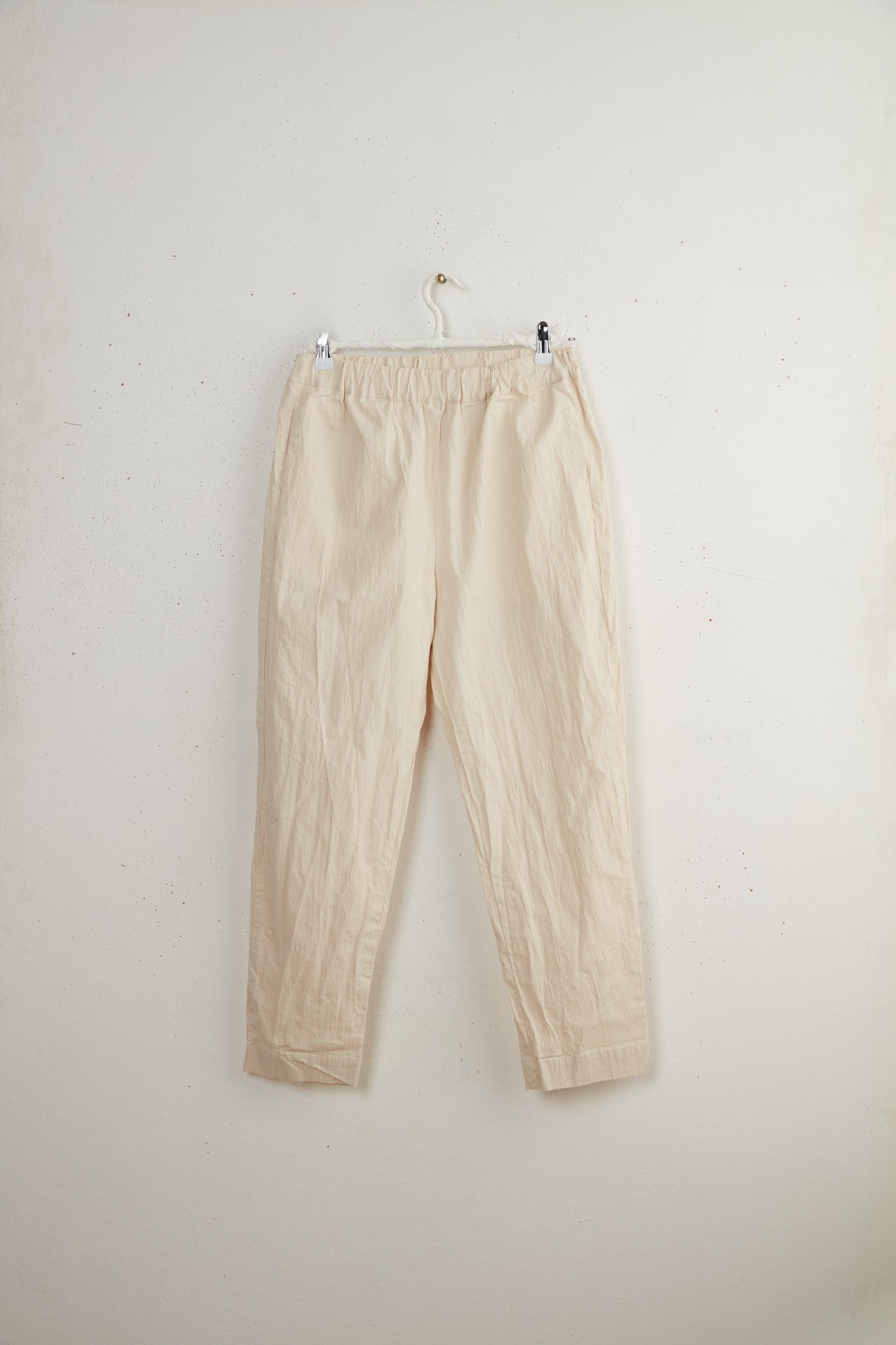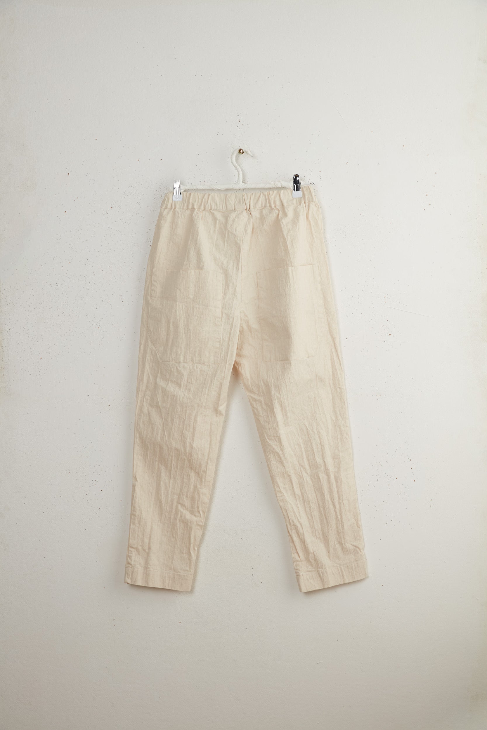 Leo pants by Maya Zukerman are slim legged mid-high rise pants. Made of light-weight cotton drill, Featuring the signature Maya Zukerman square pockets in addition to hidden side pockets. Fitted with an elastic waistband and a colorful inner finish that can be seen if the hem is folded.