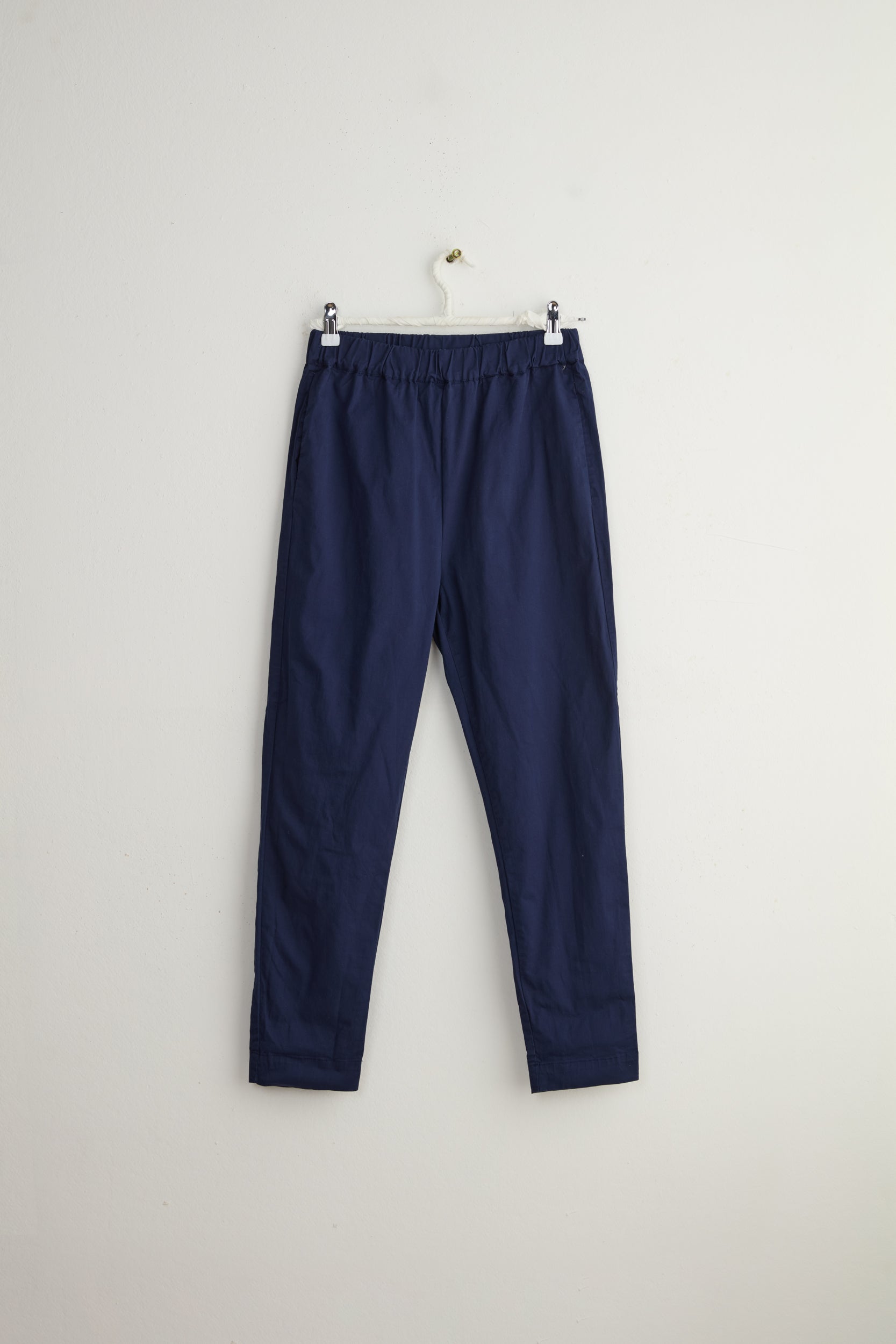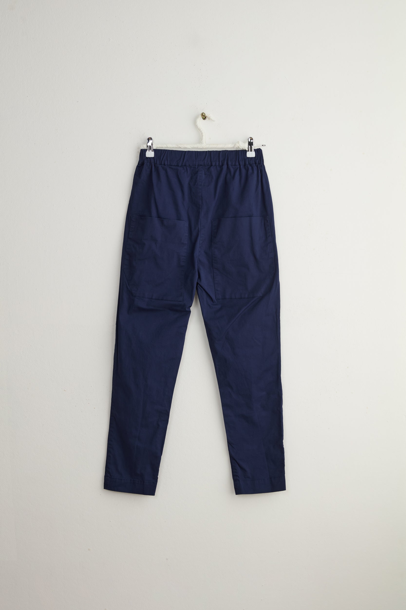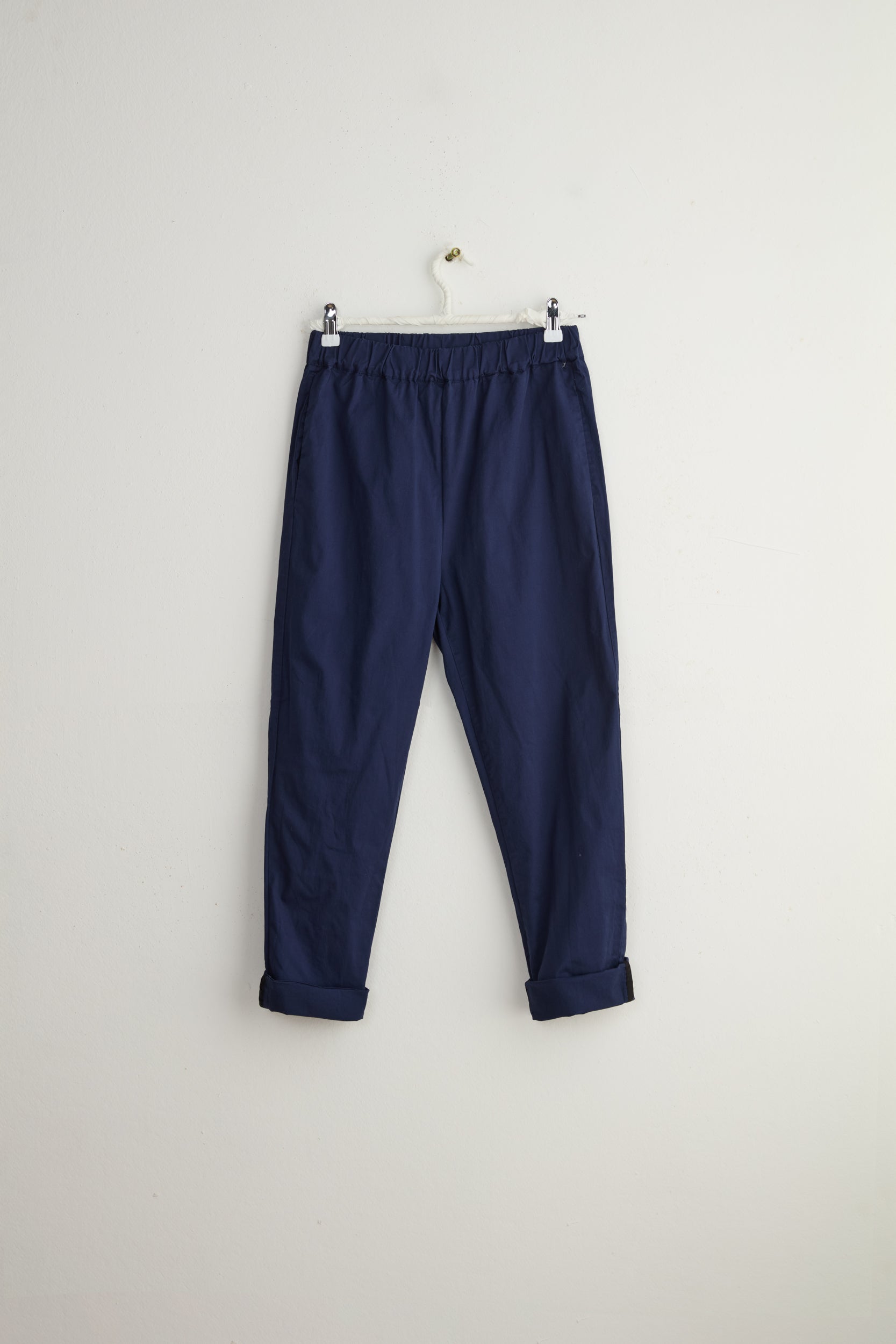Leo pants by Maya Zukerman are slim legged mid-high rise pants. Made of light-weight cotton drill, Featuring the signature Maya Zukerman square pockets in addition to hidden side pockets. Fitted with an elastic waistband and a colorful inner finish that can be seen if the hem is folded.