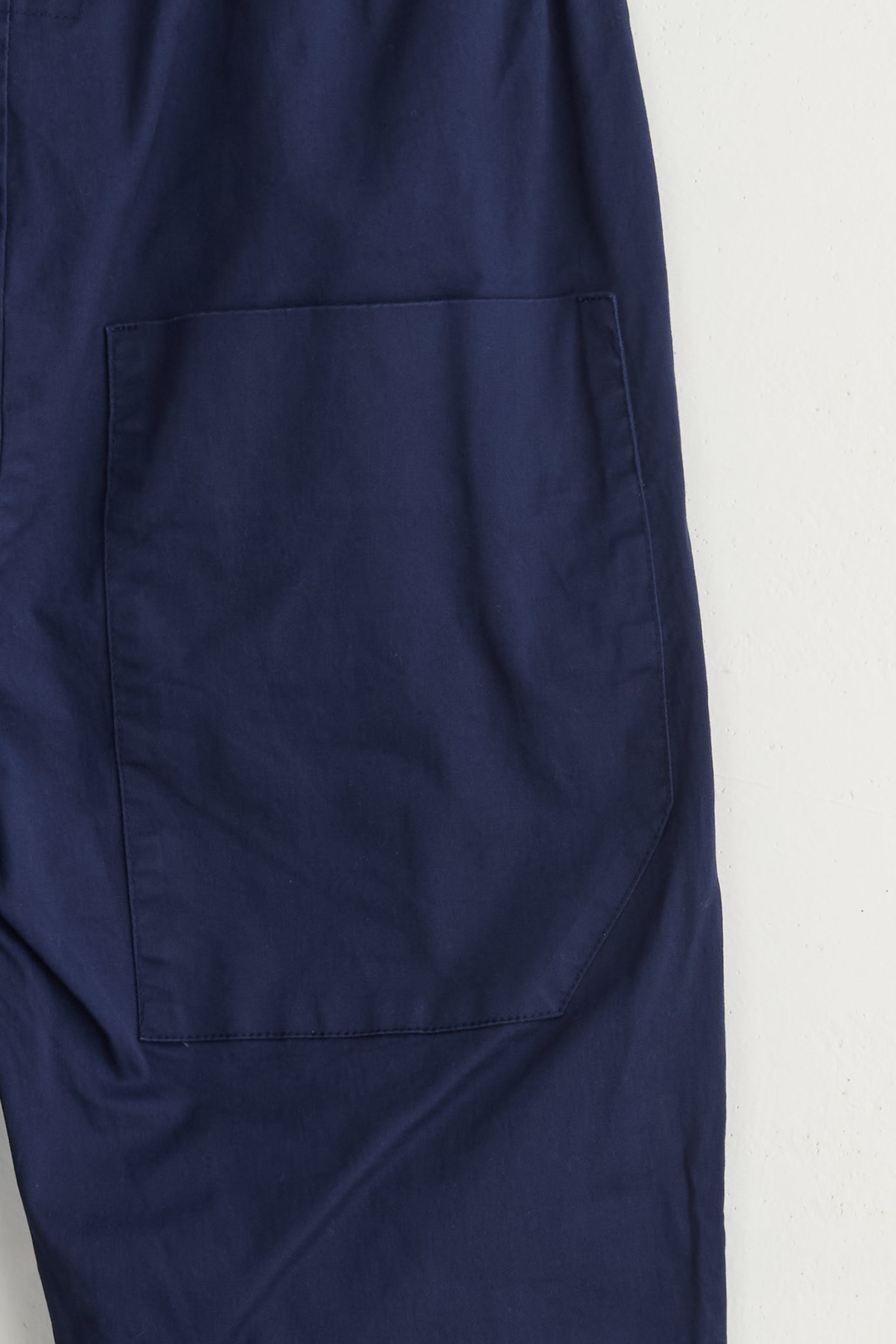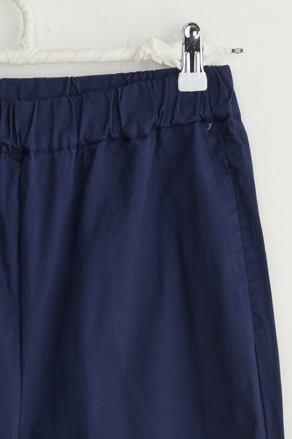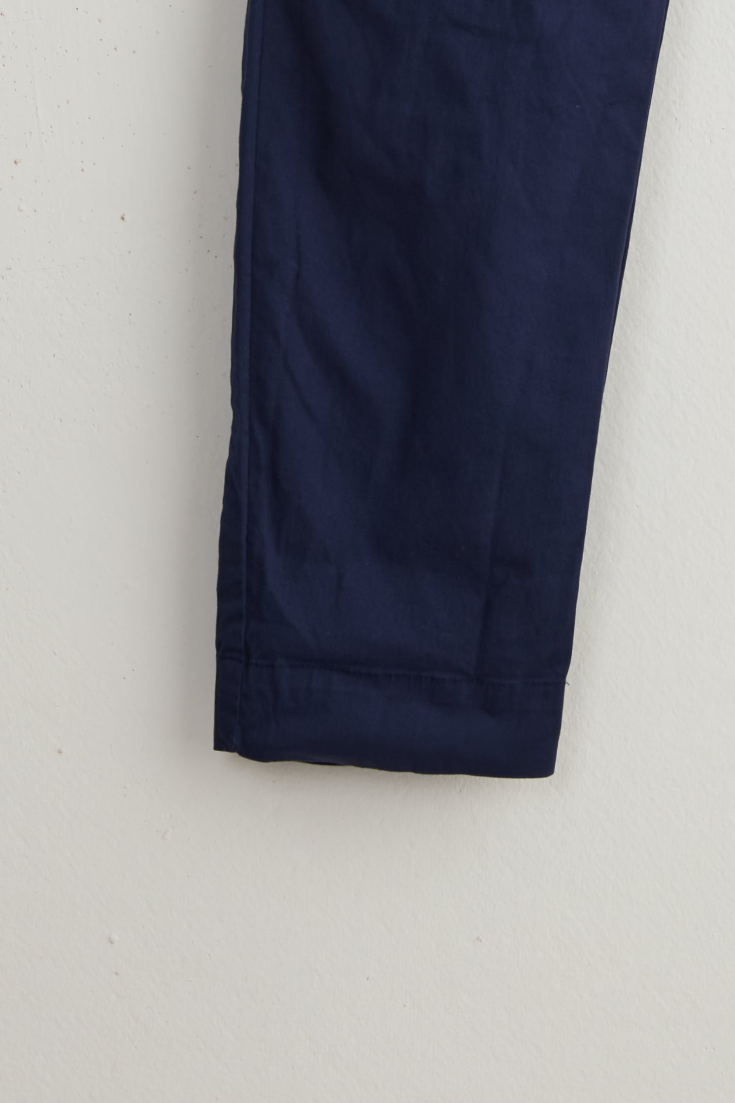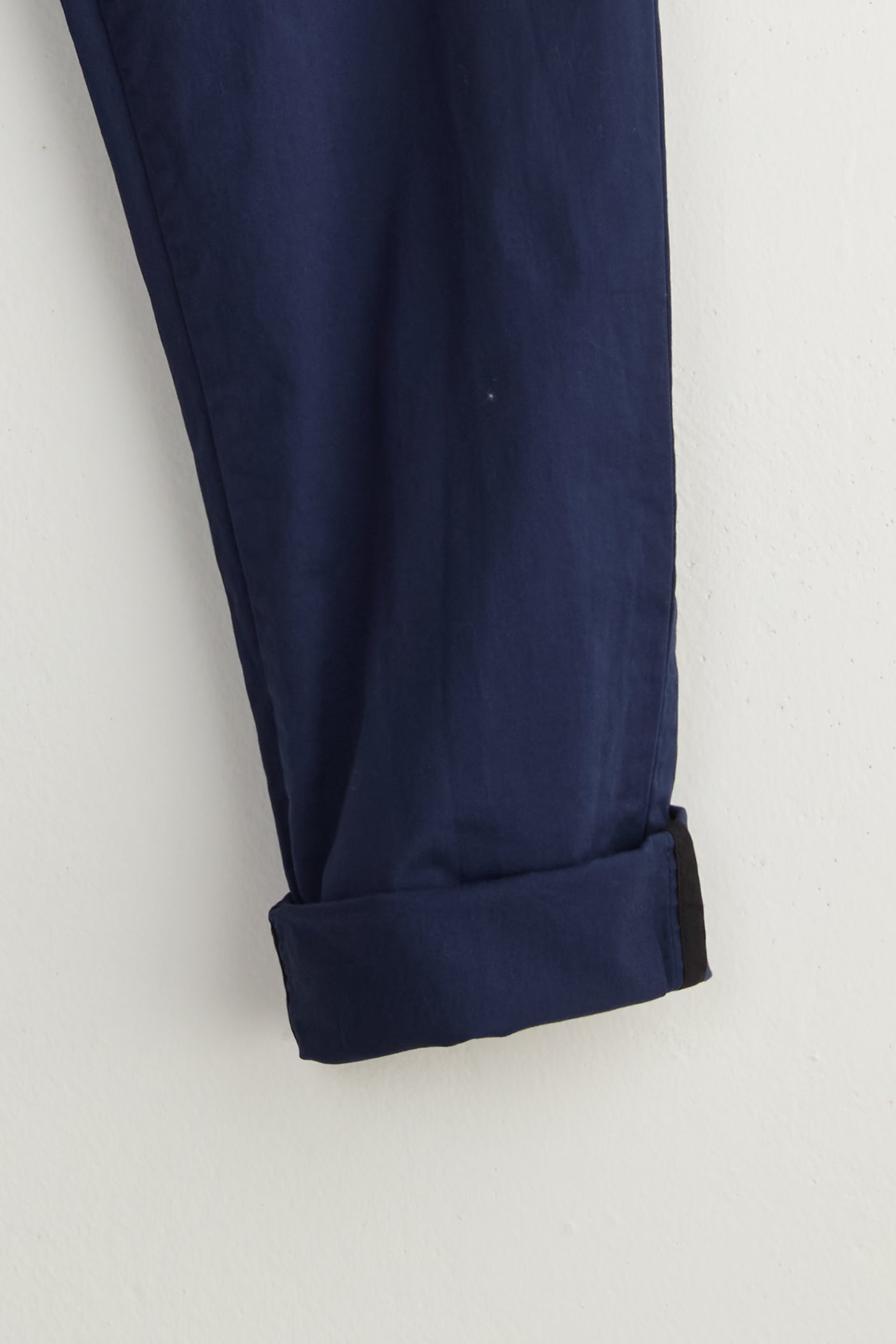 Leo pants by Maya Zukerman are slim legged mid-high rise pants. Made of light-weight cotton drill, Featuring the signature Maya Zukerman square pockets in addition to hidden side pockets. Fitted with an elastic waistband and a colorful inner finish that can be seen if the hem is folded.