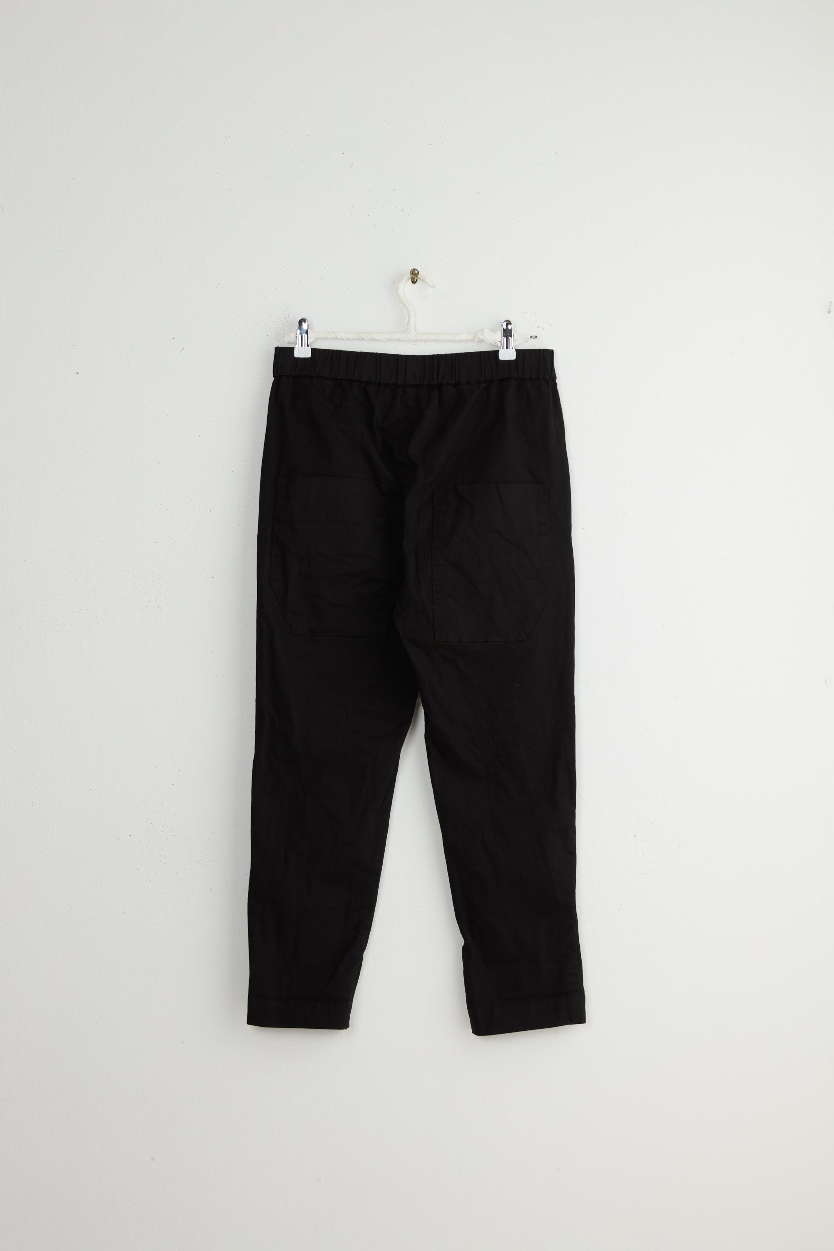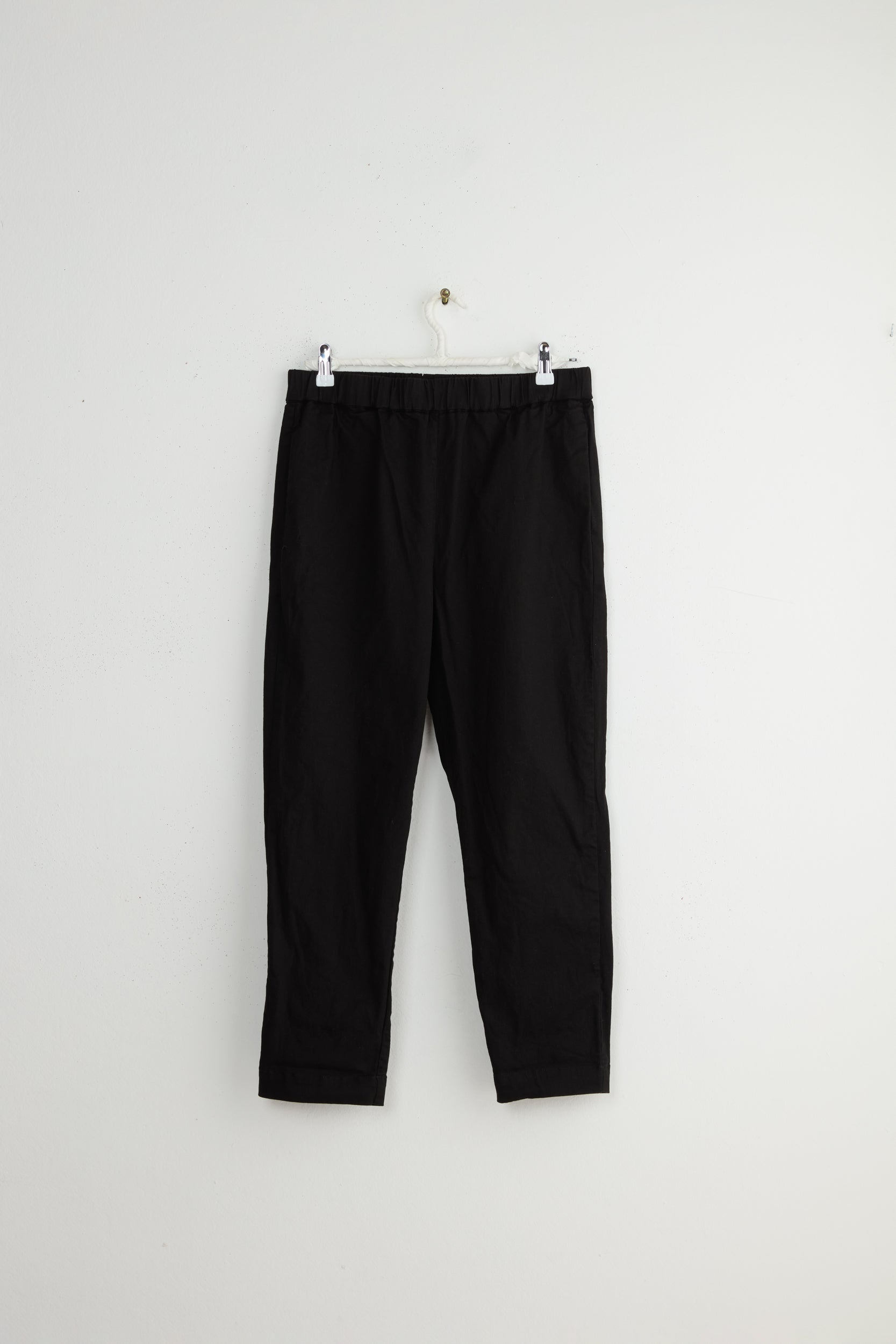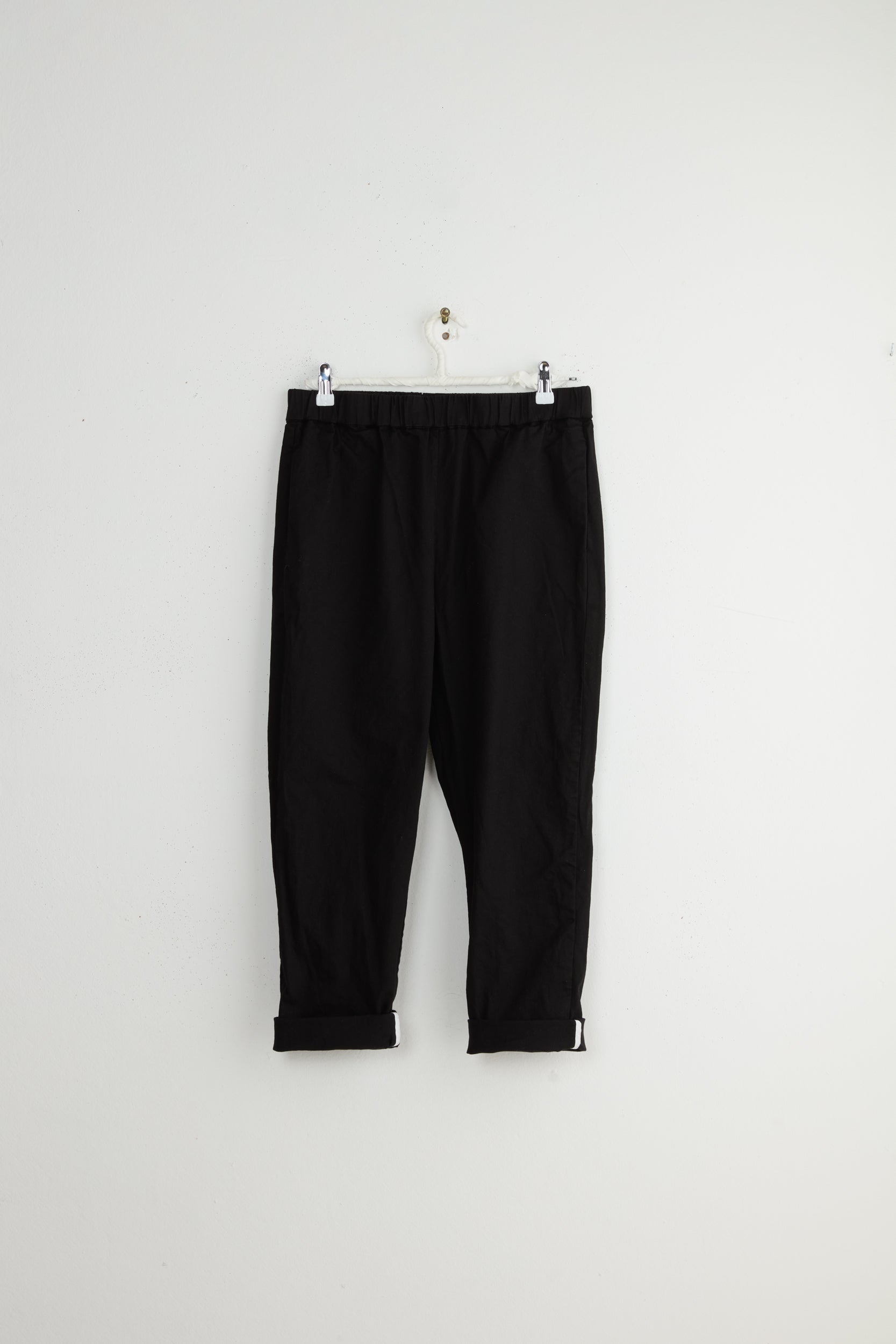 Leo pants by Maya Zukerman. Slim legged mid-high rise pants. Made of a mid-weight cotton drill, Featuring the signature Maya Zukerman square pockets in addition to hidden side pockets. Fitted with an elastic waistband and a colorful inner finish that can be seen if the hem is folded.