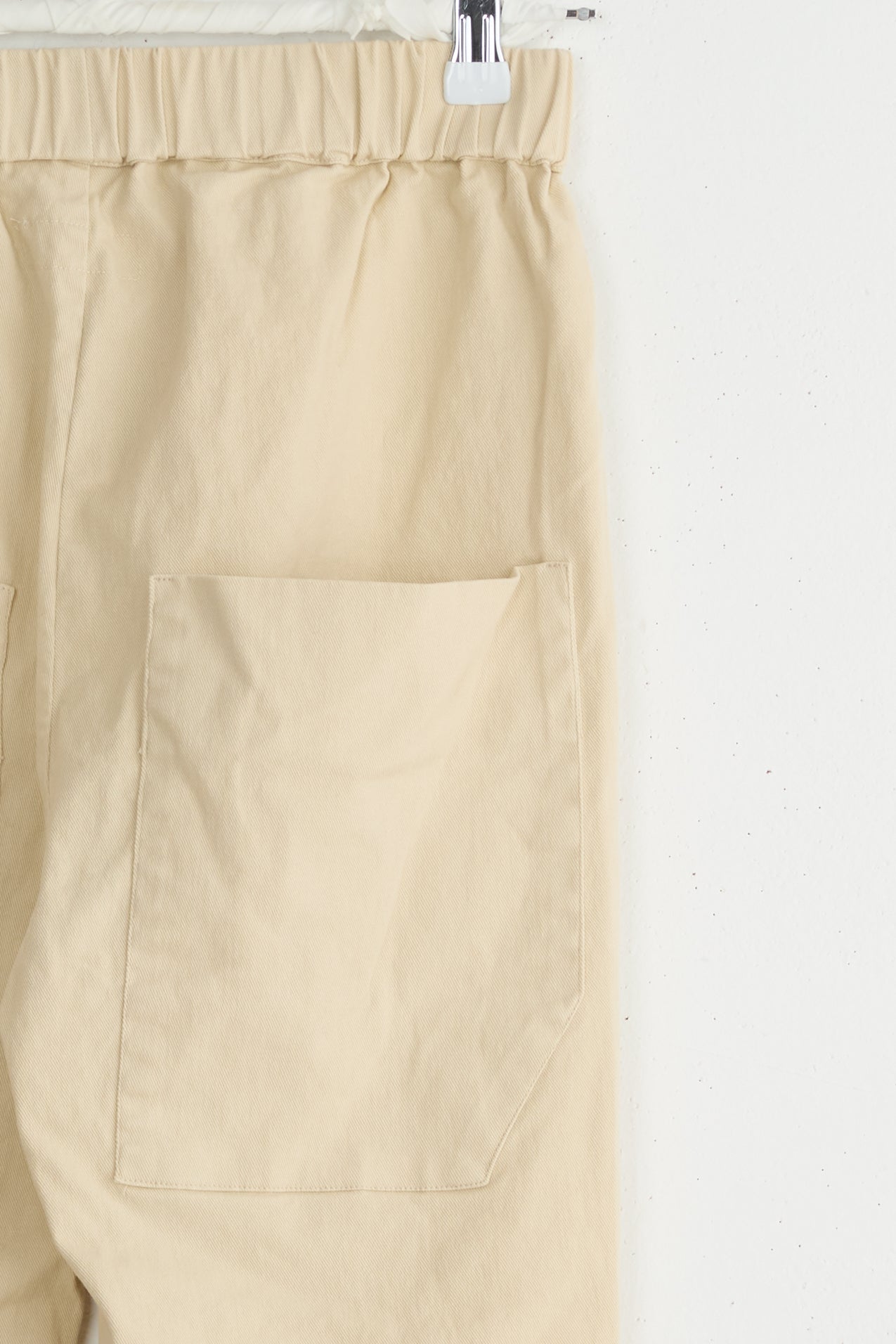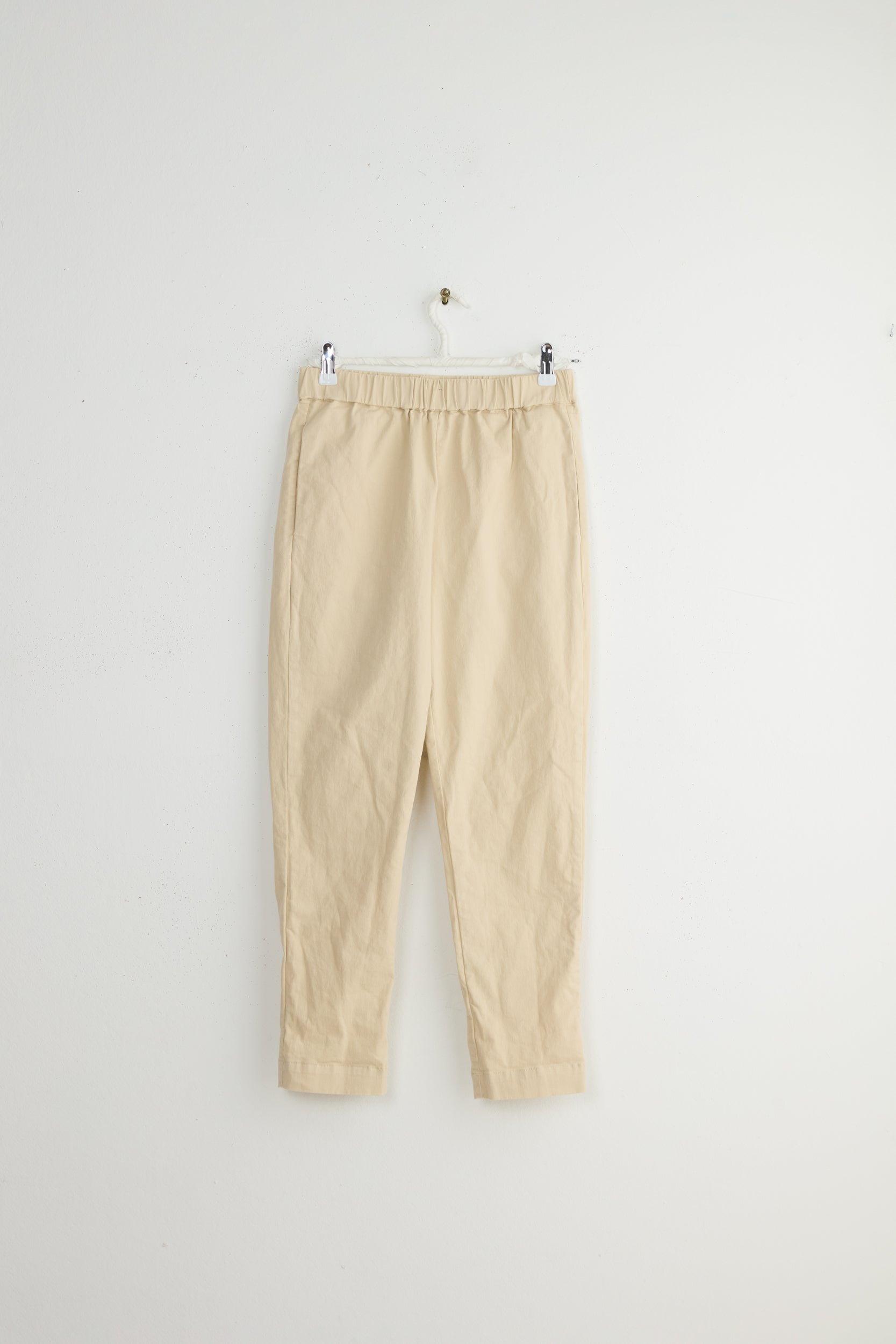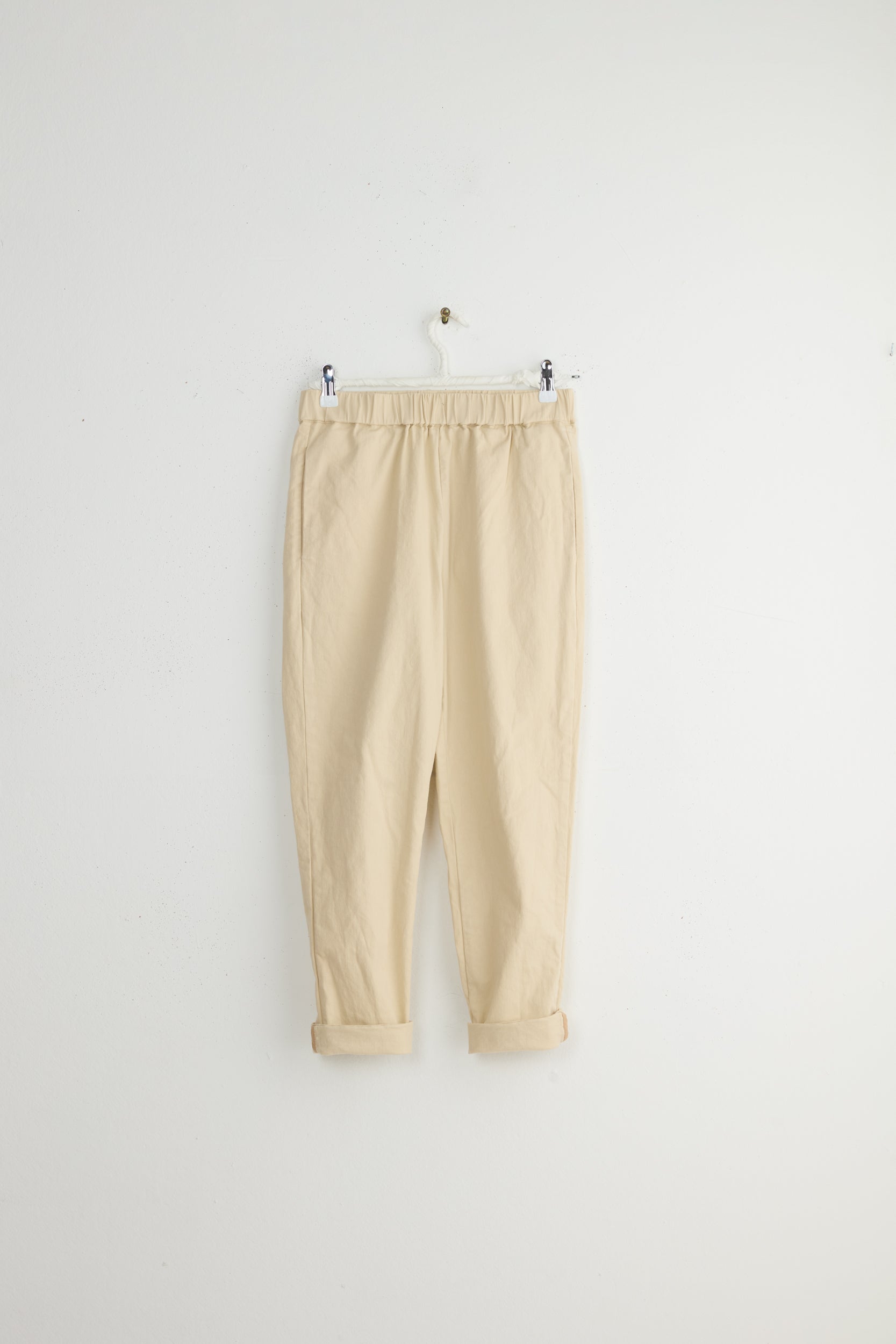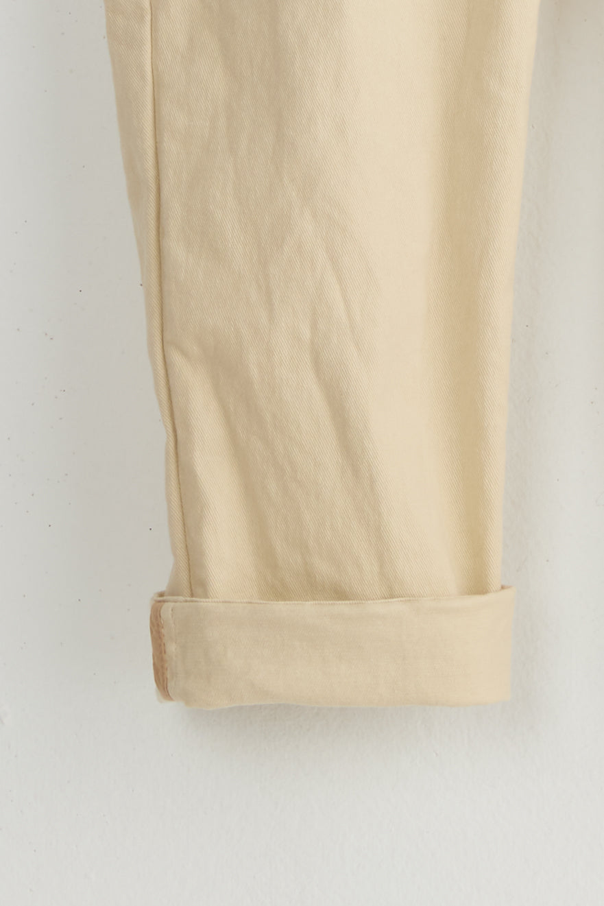 Leo pants by Maya Zukerman. Slim legged mid-high rise pants. Made of a mid-weight cotton drill, Featuring the signature Maya Zukerman square pockets in addition to hidden side pockets. Fitted with an elastic waistband and a colorful inner finish that can be seen if the hem is folded.