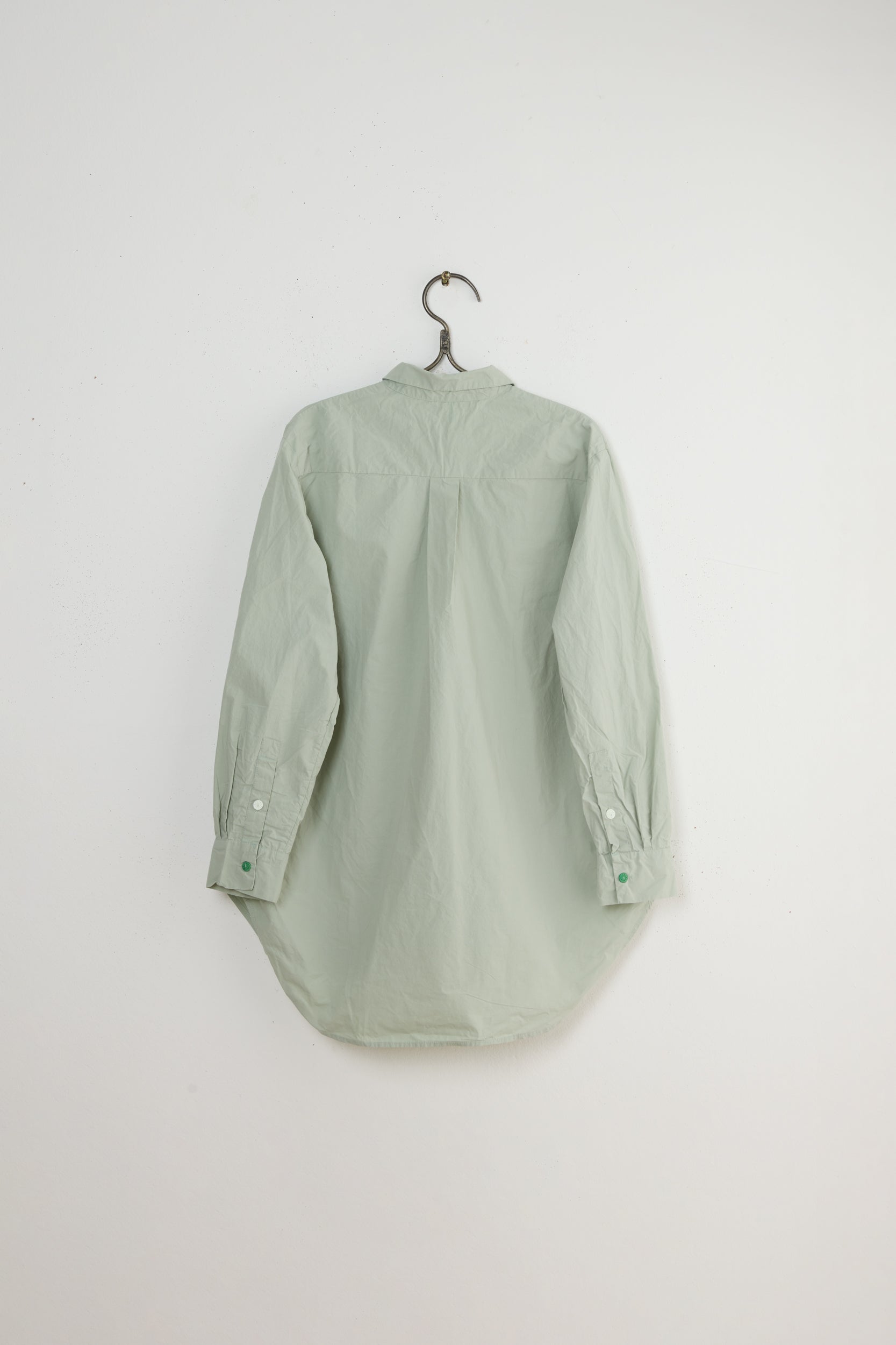 Lipp shirt by Maya Zukerman. A collared henley tunic made from lightweight Japanese paper cotton. Long and narrow silhouette with long cuffed sleeves, rounded hems with side slits, decorative tad beneath the button row and a decorative pleat on the back.