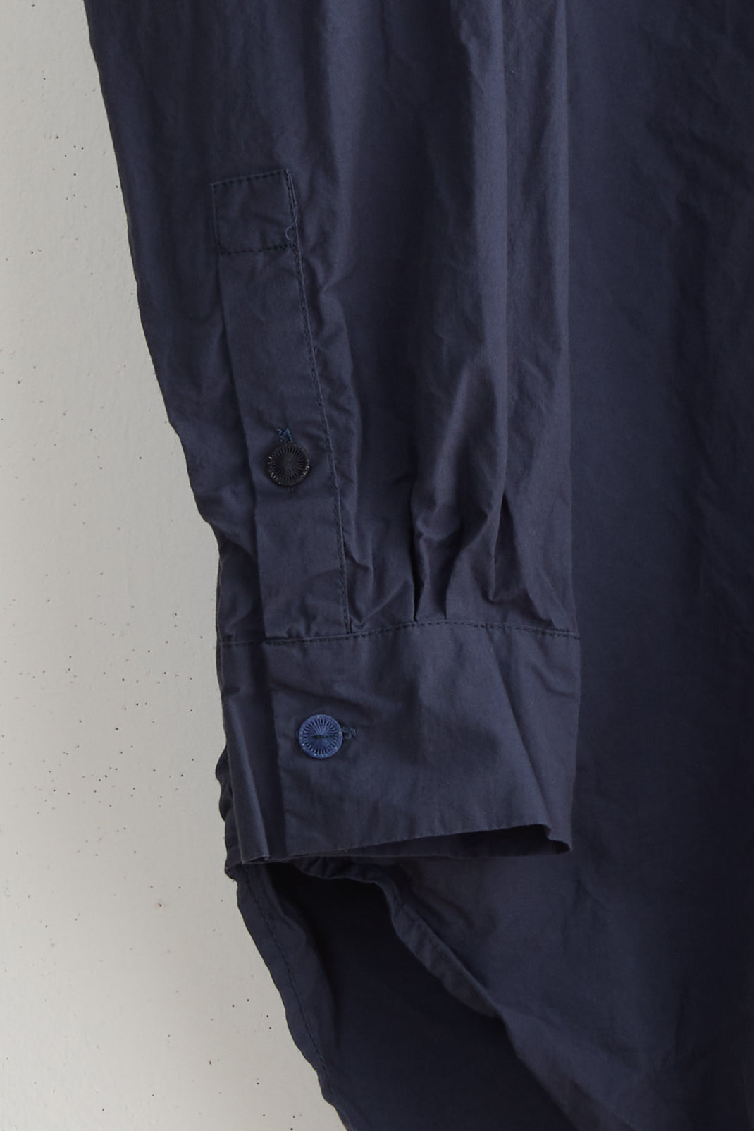 Lipp shirt by Maya Zukerman. A collared henley tunic made from lightweight Japanese paper cotton. Long and narrow silhouette with long cuffed sleeves, rounded hems with side slits, decorative tad beneath the button row and a decorative pleat on the back.