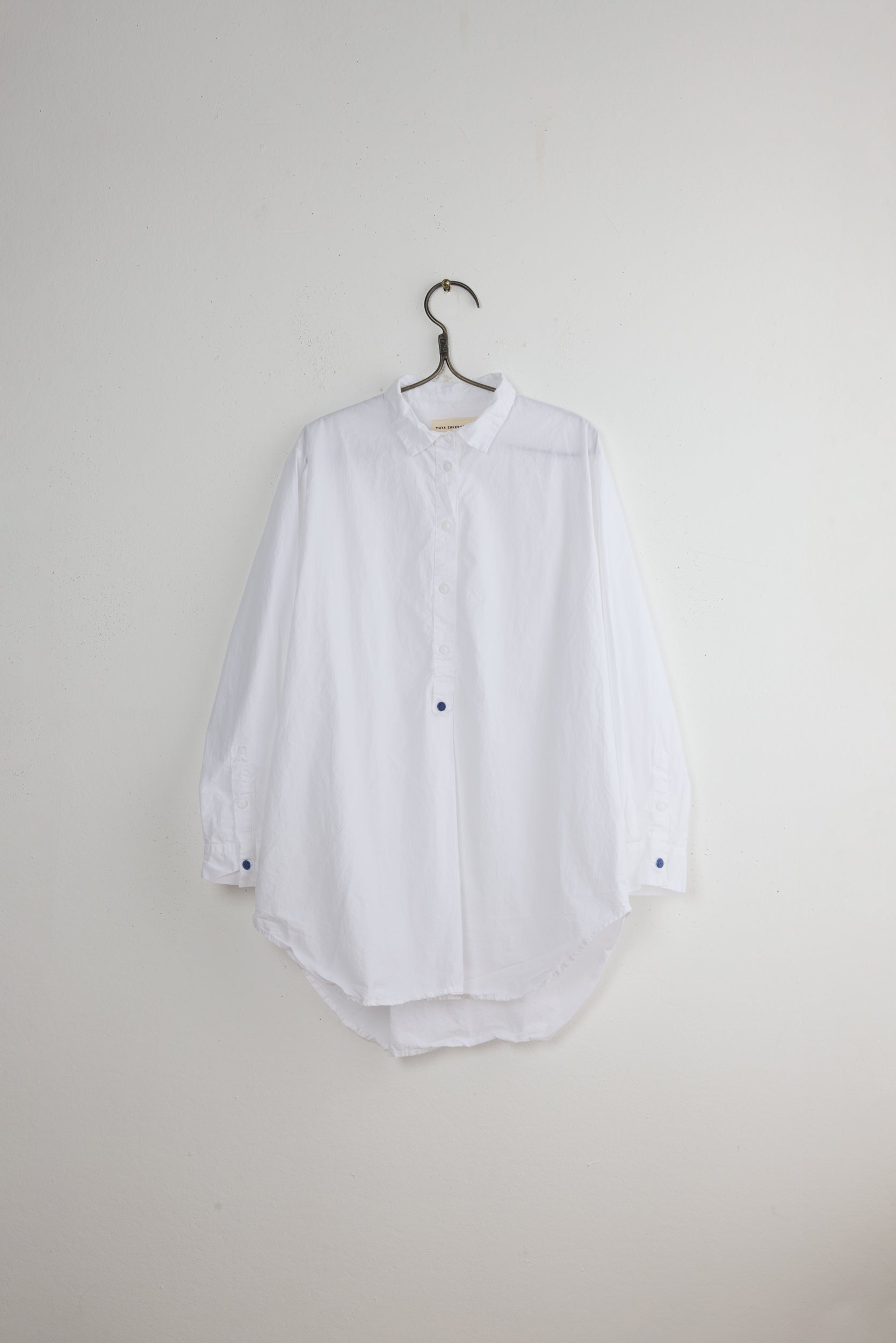 Lipp shirt by Maya Zukerman. A collared henley tunic made from lightweight Japanese paper cotton. Long and narrow silhouette with long cuffed sleeves, rounded hems with side slits, decorative tad beneath the button row and a decorative pleat on the back.