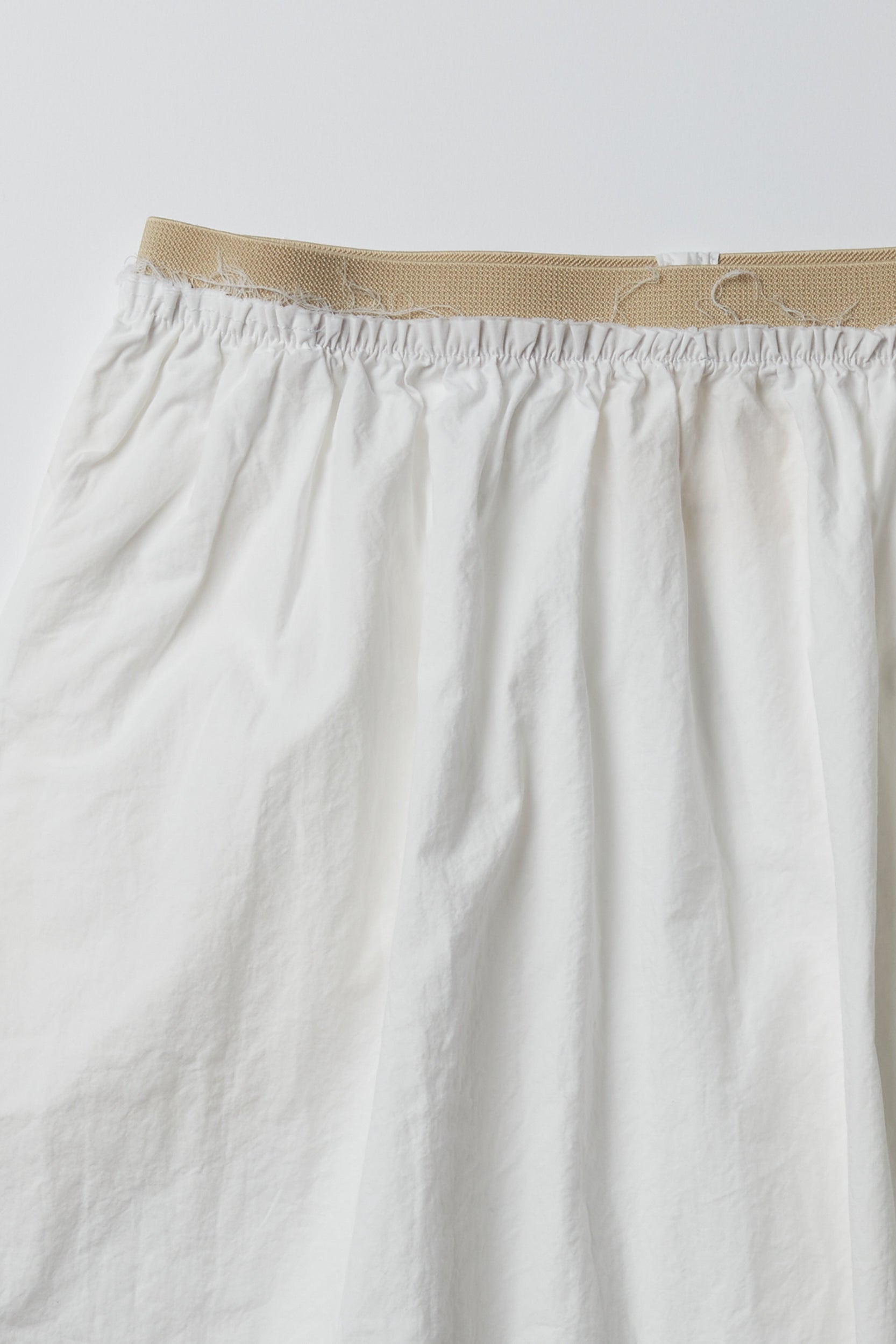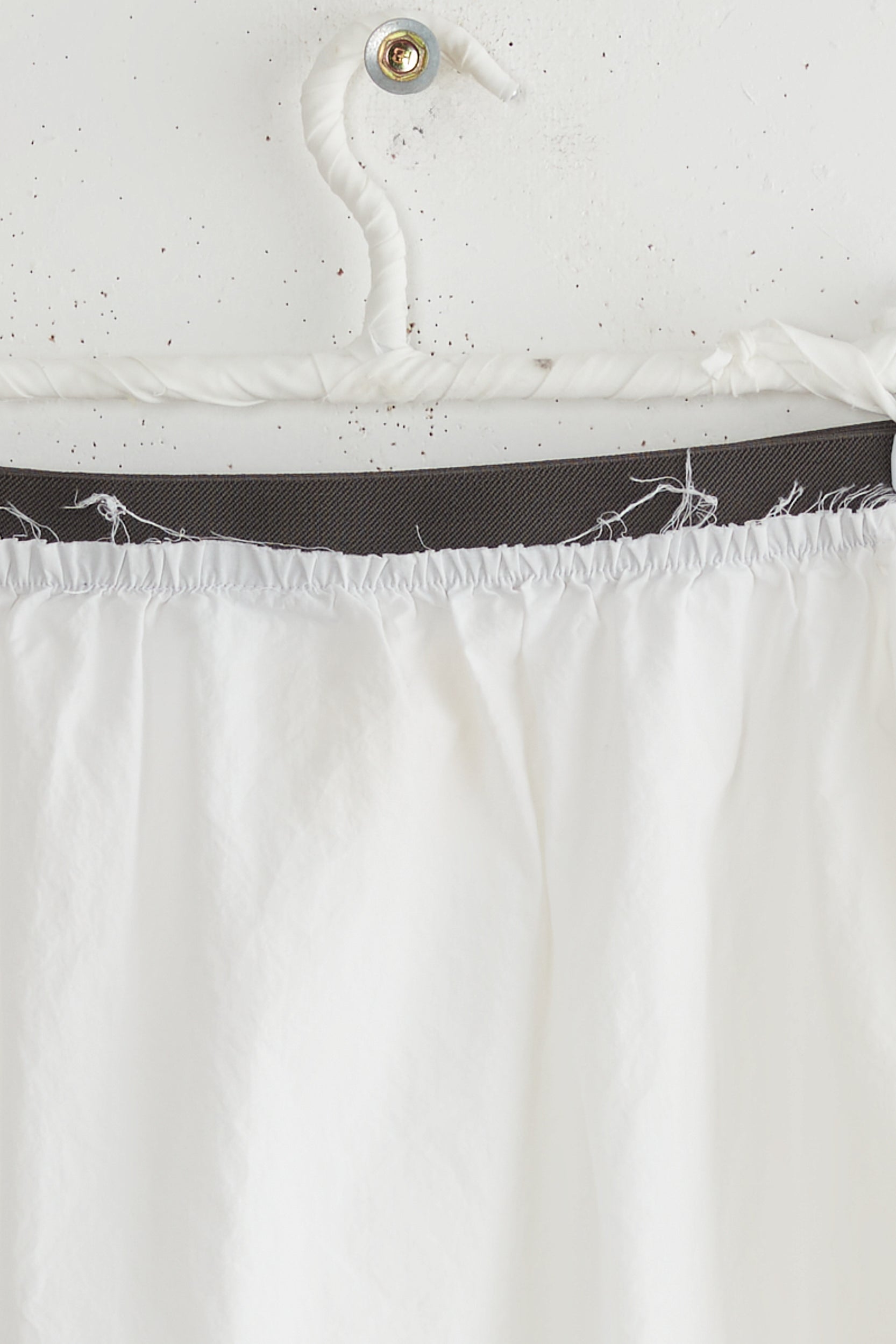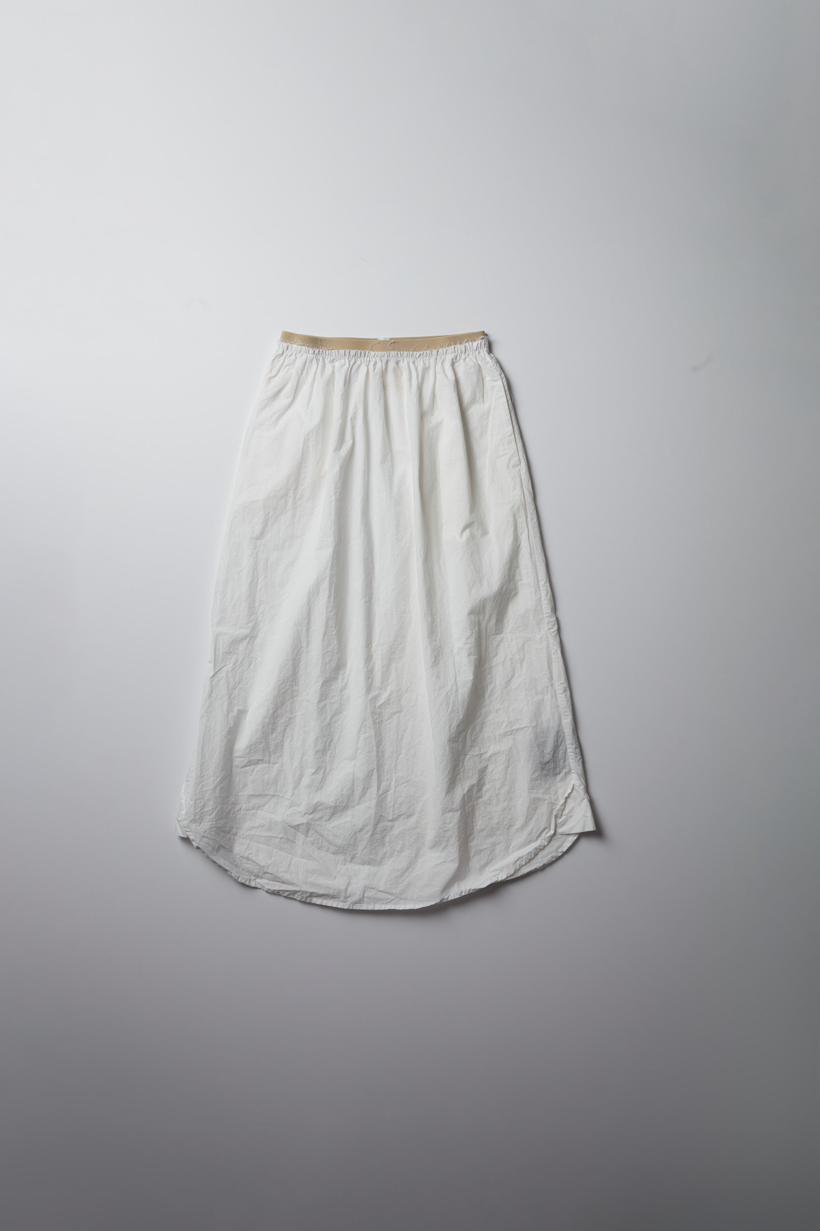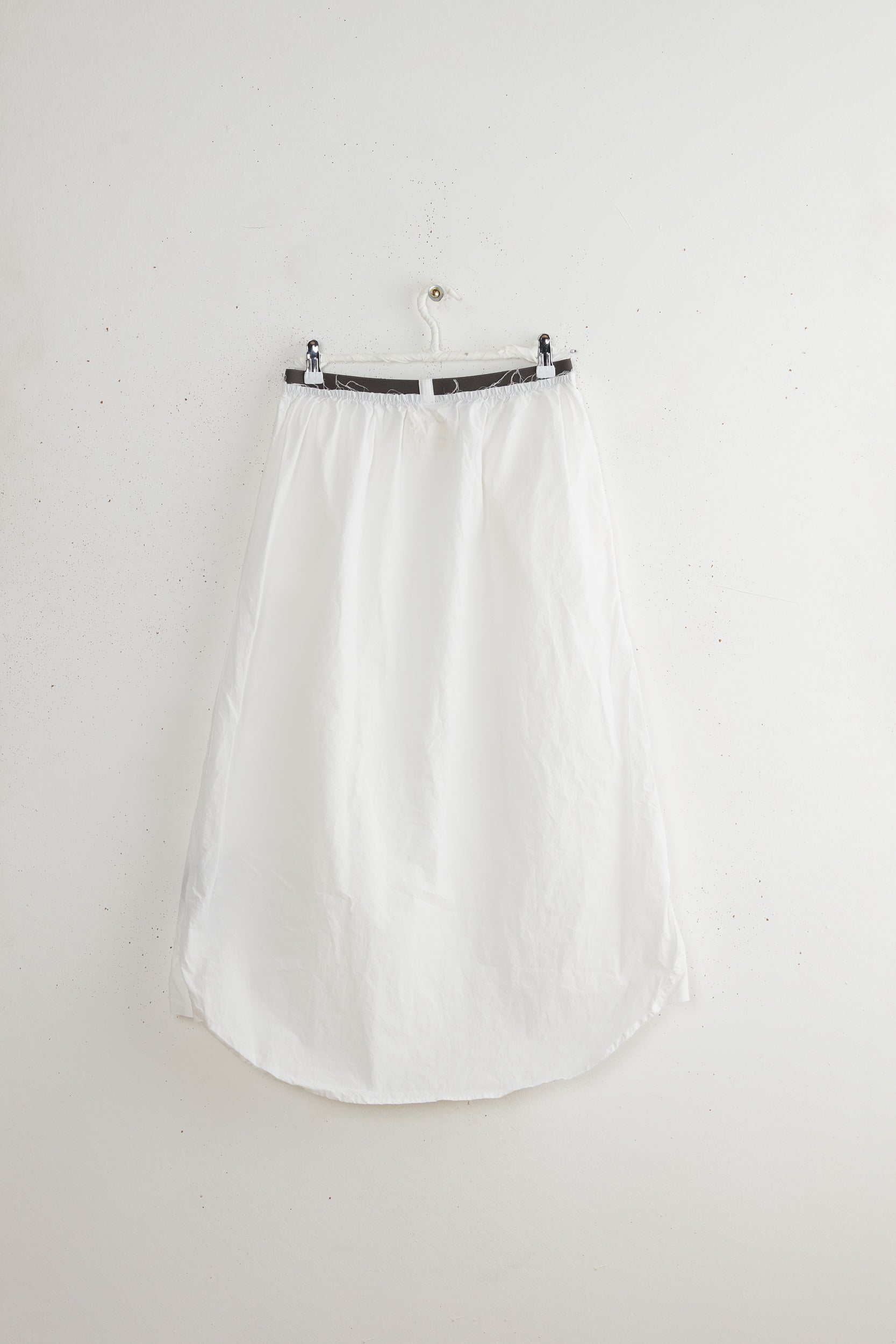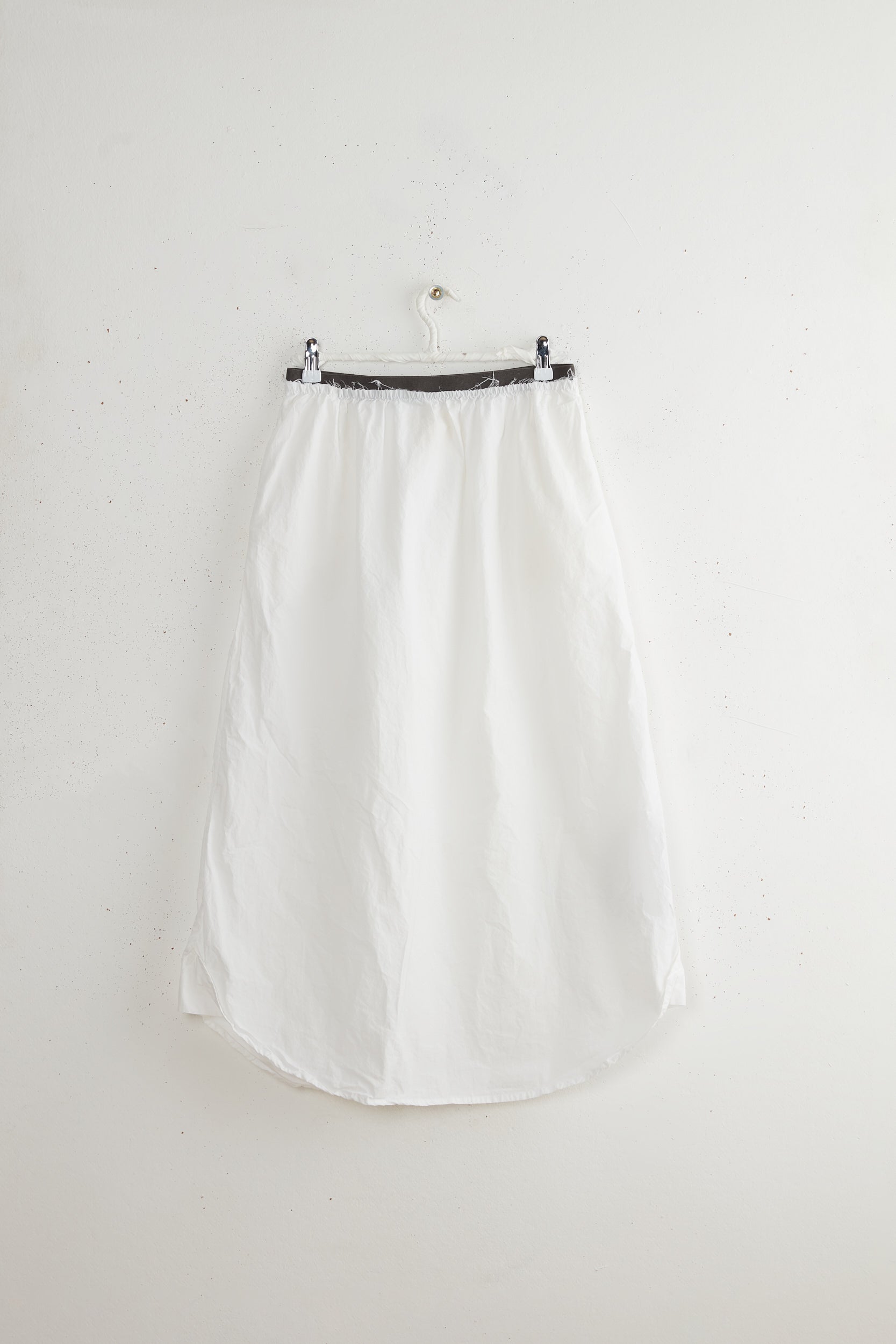 Lola skirt by Maya Zukerman. A paper cotton light and breezy full length skirt with an exposed elastic waist and gathered raw waist detail. A straight loose fit with two side pockets, round hem and a rounded side slits.