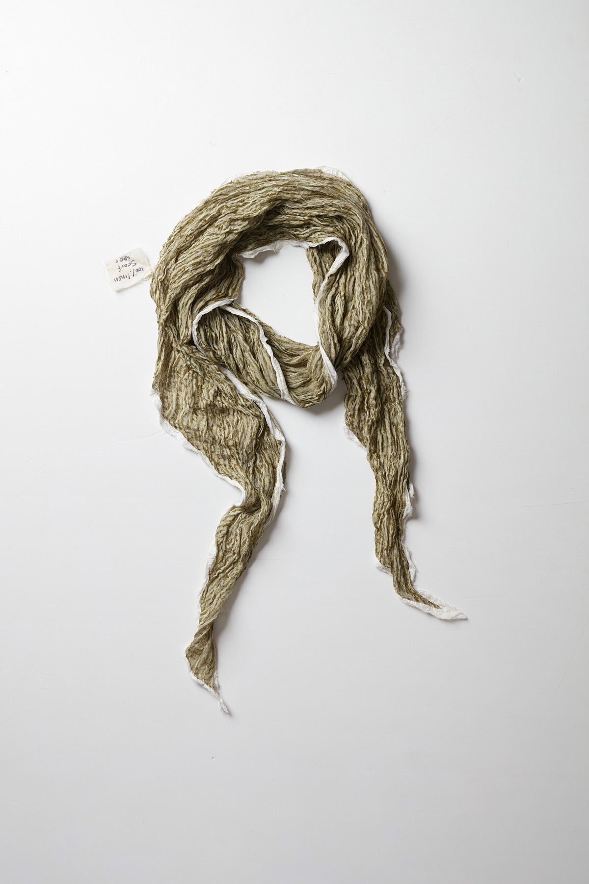 Linen M scarf by Maya Zukerman. long and Light textured scarf with a diagonal end cut creating flowy sharp edges. Soft uneven 100% linen with a raw silk hemline.