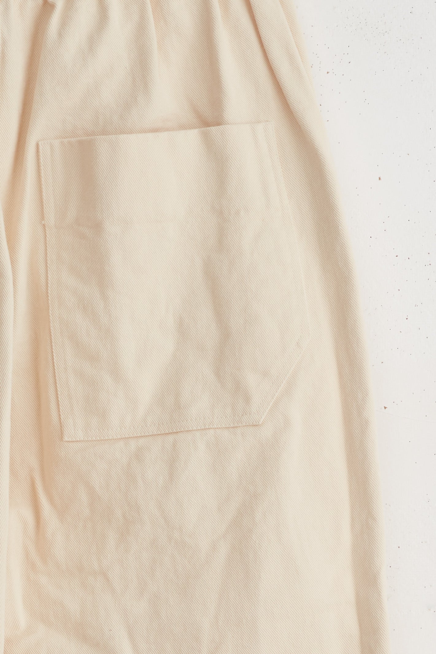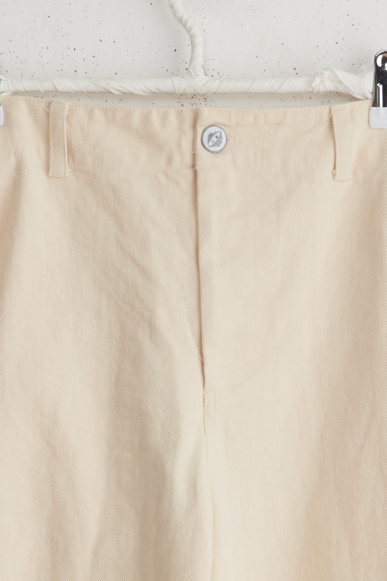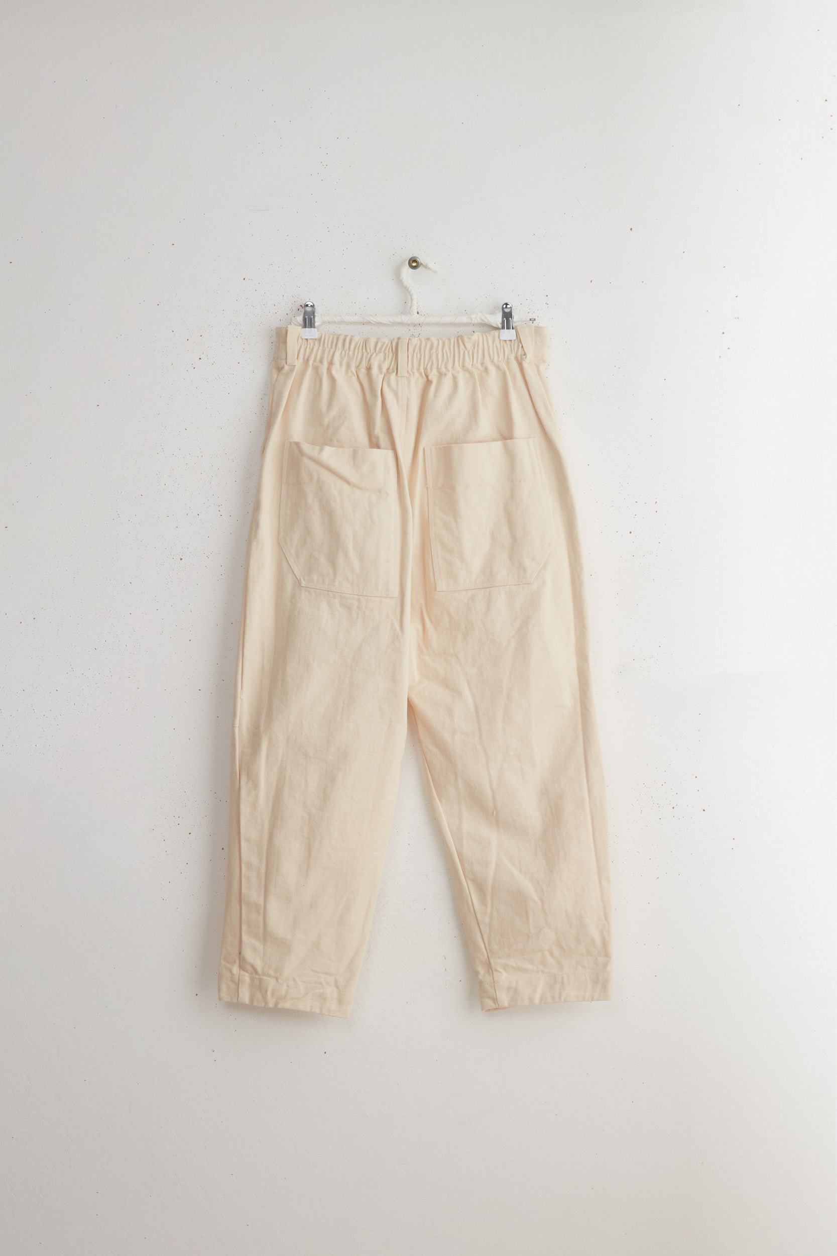 Marly pants by Maya Zukerman are relaxed, tapered legged pants made of soft cotton canvas. Featuring the signature Maya Zukerman square patch pockets and additional side pockets, these were designed with skipper work-wear in mind. Fitted with a metal button and zipper closure, elastic band and belt hoops. Mid-high rise fit with decorative stitch detail on the knee.