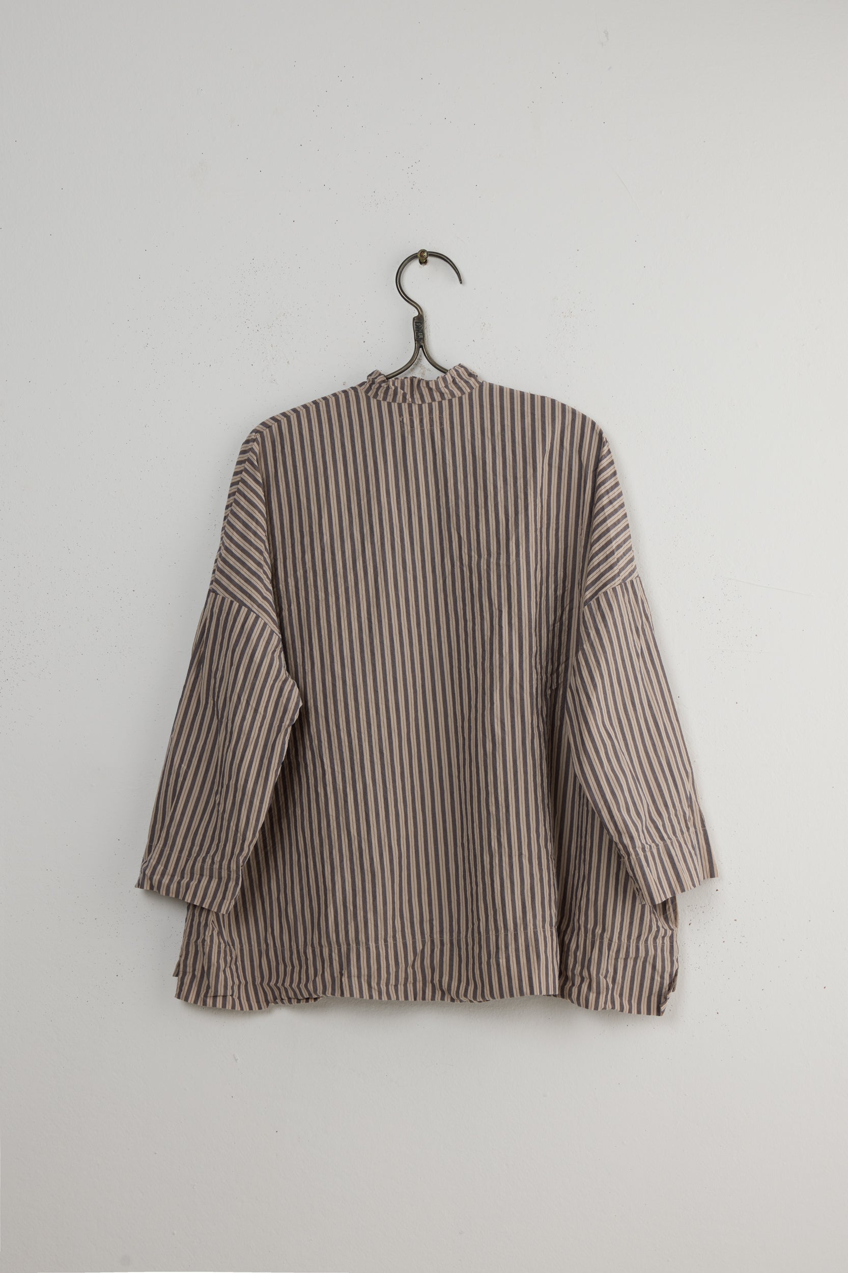 The Striped Melody shirt by Maya Zukerman is a light and breezy collared shirt made from Japanese striped cotton. A "boxy" silhouette, hand dyed Dorset button closure, slim collar and dropped shoulders. Finished with a wide hem, side slits and round cuff slits. A relaxed fit, slightly shorter on the front.