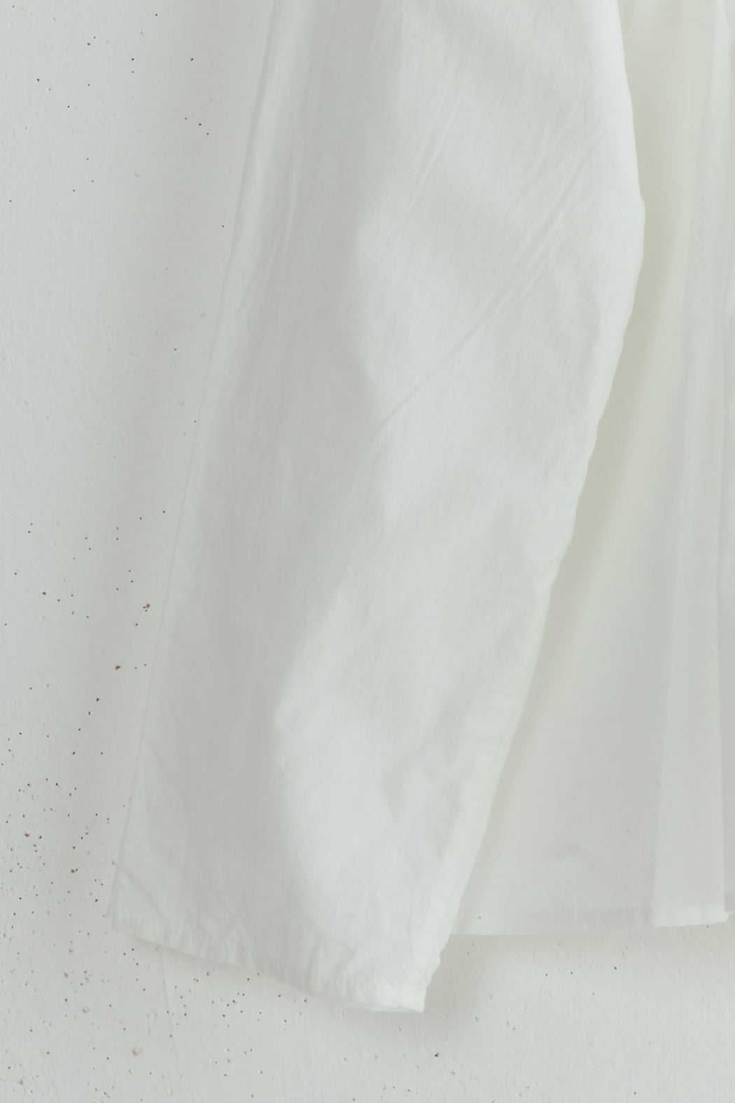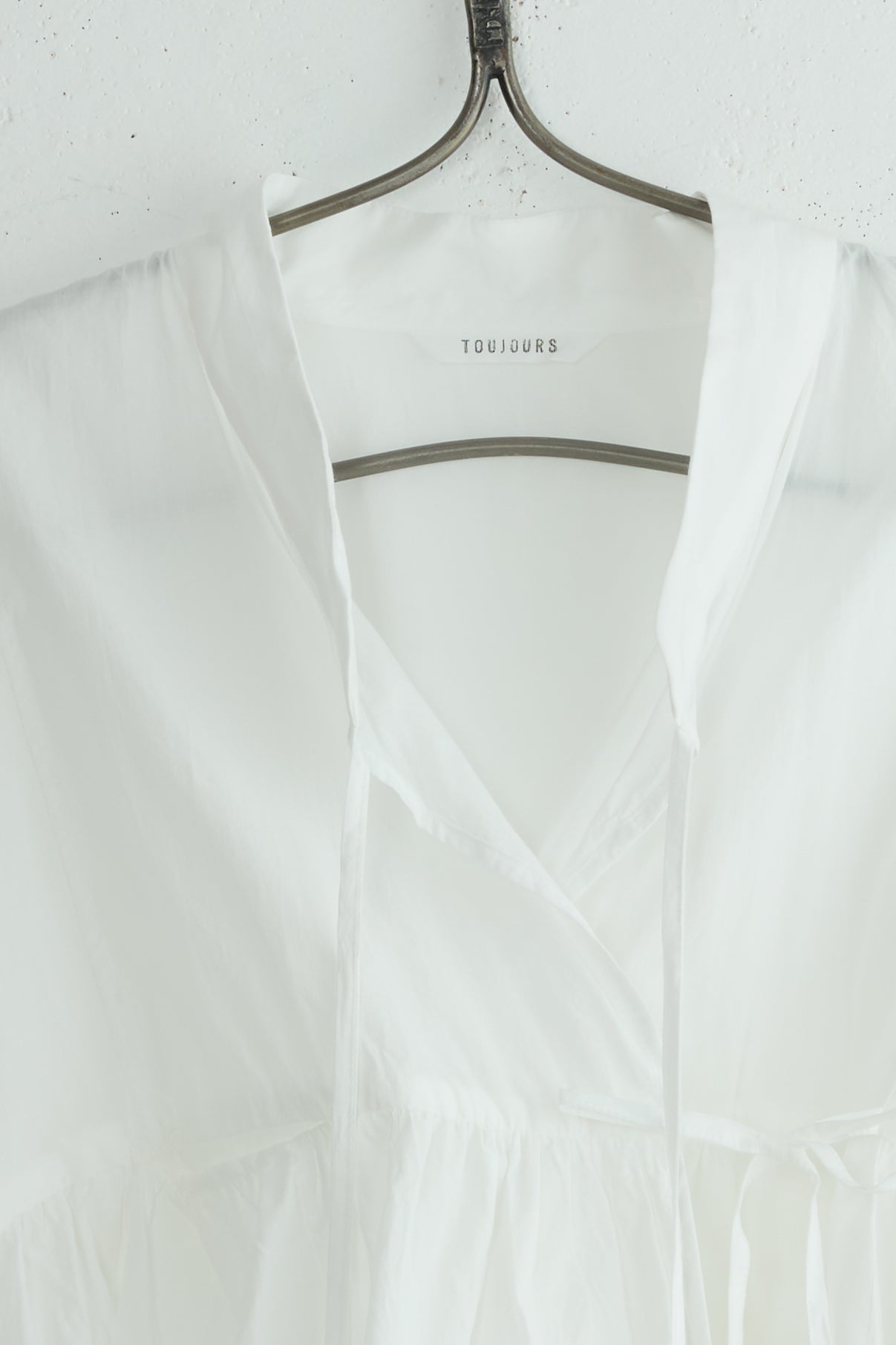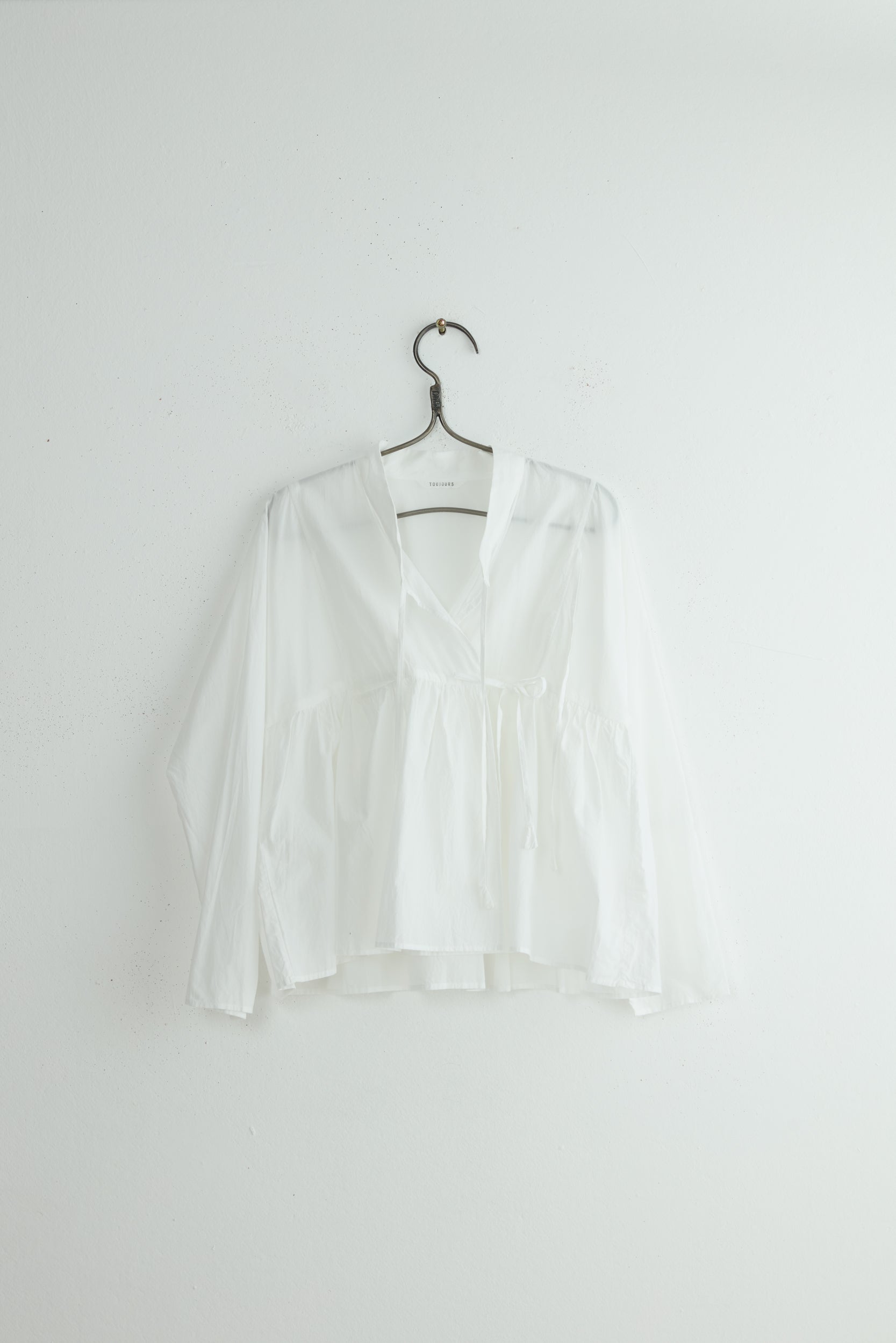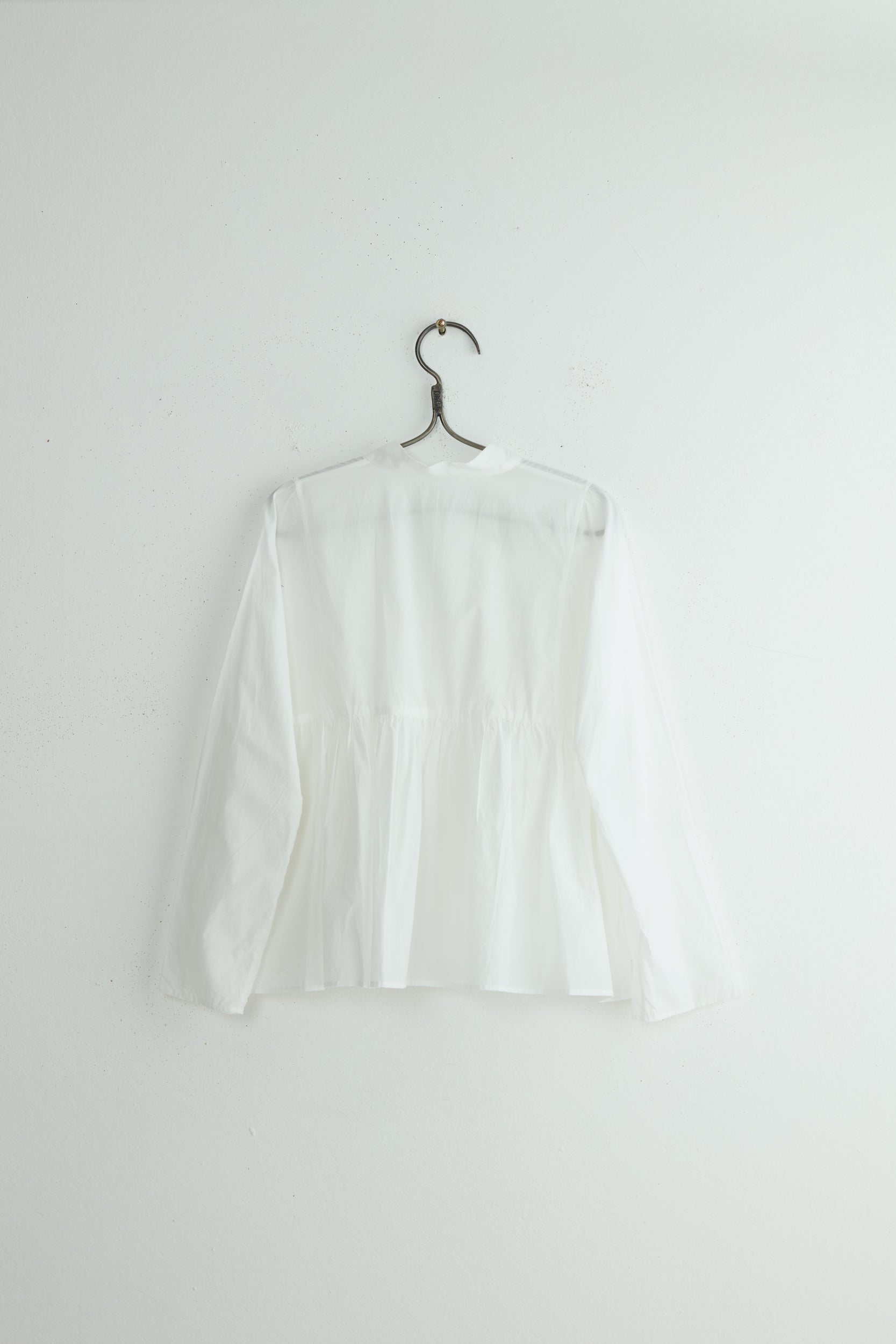 Rabari jacket by TOUJOURS. A romantic, breezy shirt jacket made of thin, gentle cotton. Relaxed fit with a pleated flared waistline and double ribbon closure - two inside and two outside. Details include a standing wrap collar and a small seam pocket placed on the waistline.