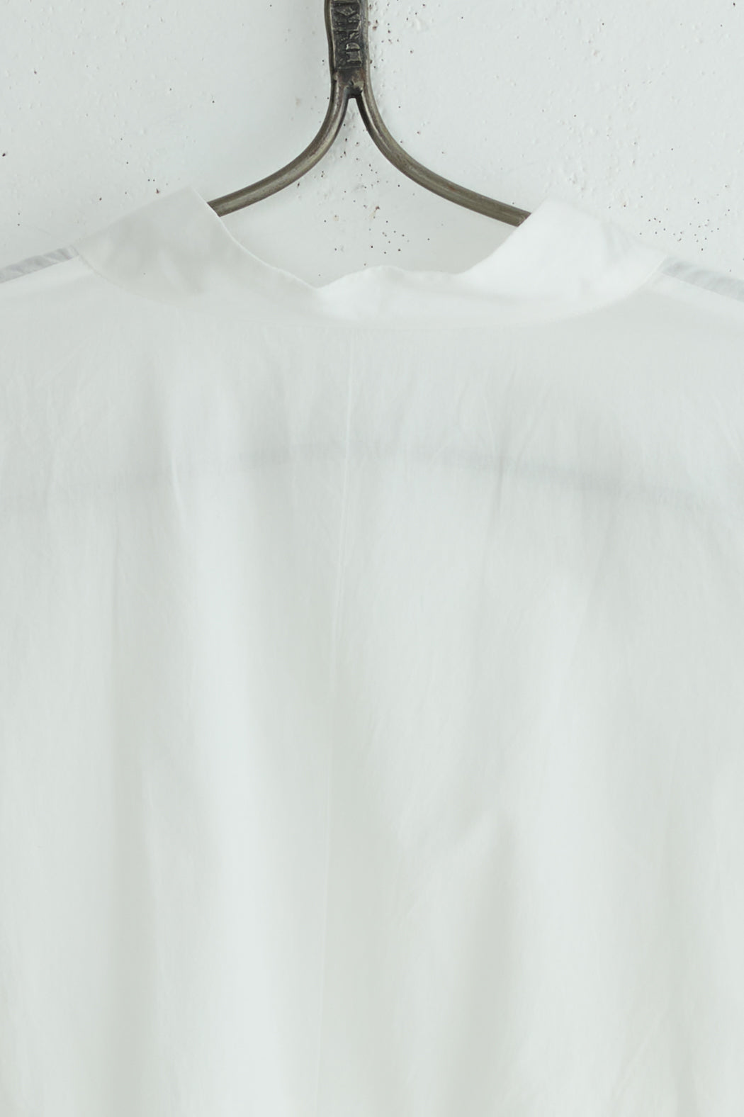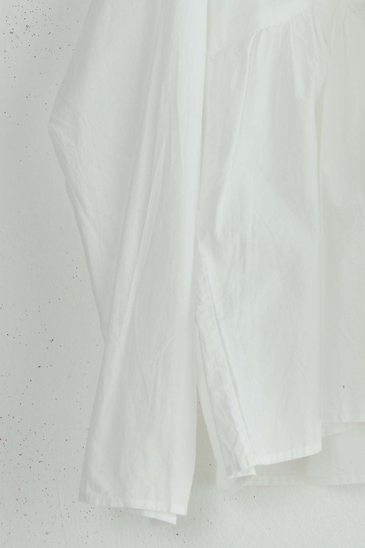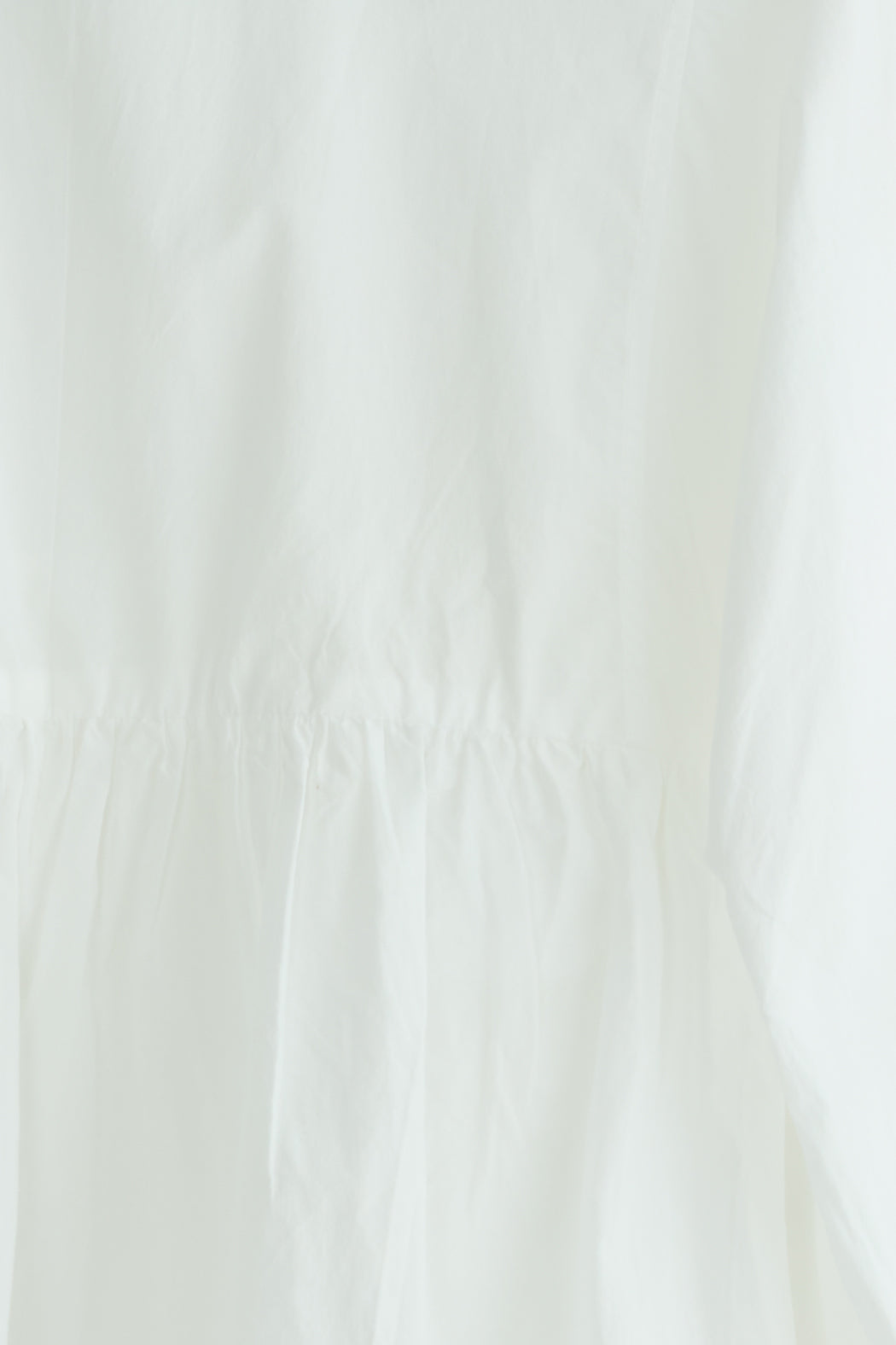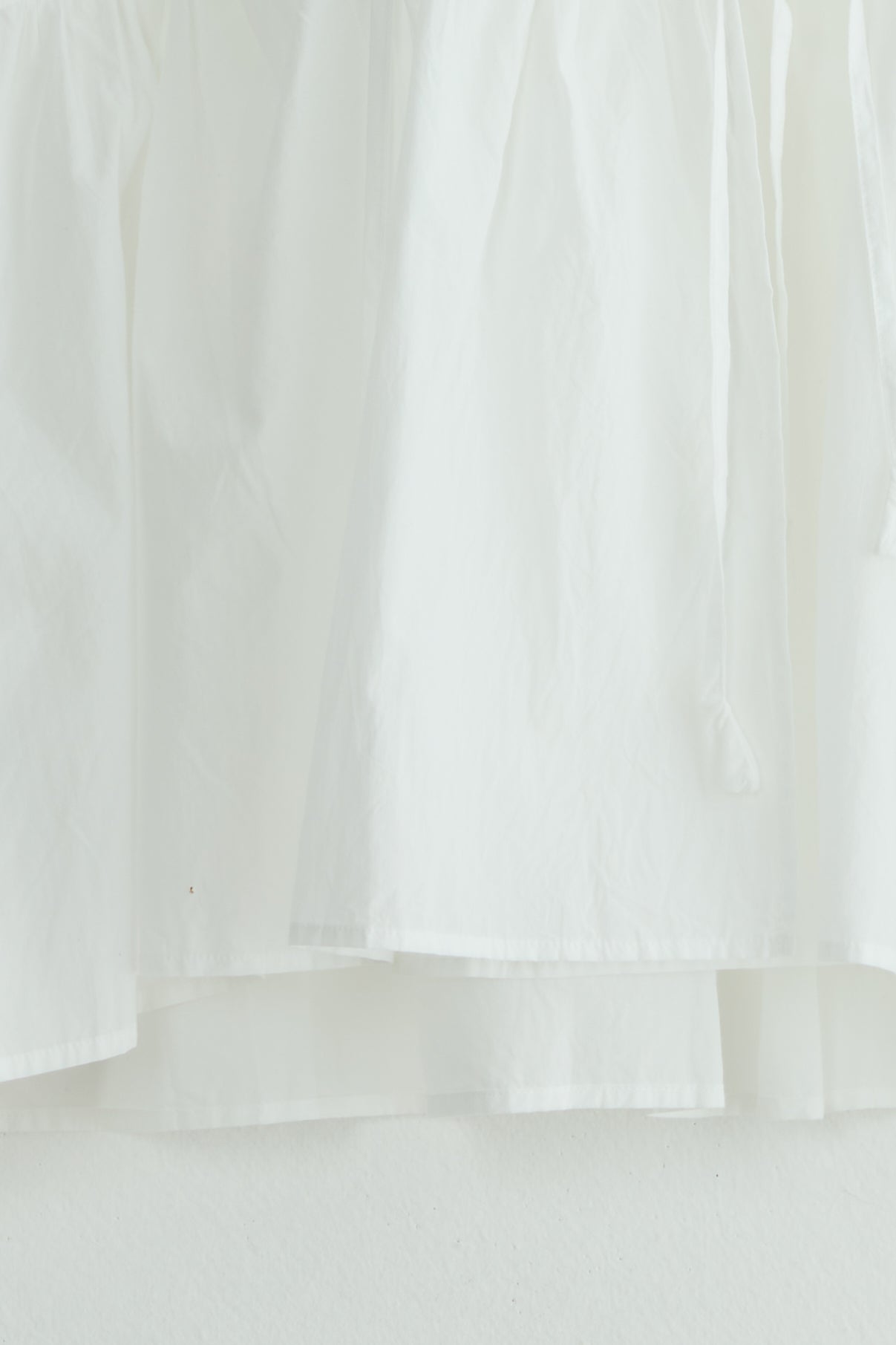 Rabari jacket by TOUJOURS. A romantic, breezy shirt jacket made of thin, gentle cotton. Relaxed fit with a pleated flared waistline and double ribbon closure - two inside and two outside. Details include a standing wrap collar and a small seam pocket placed on the waistline.