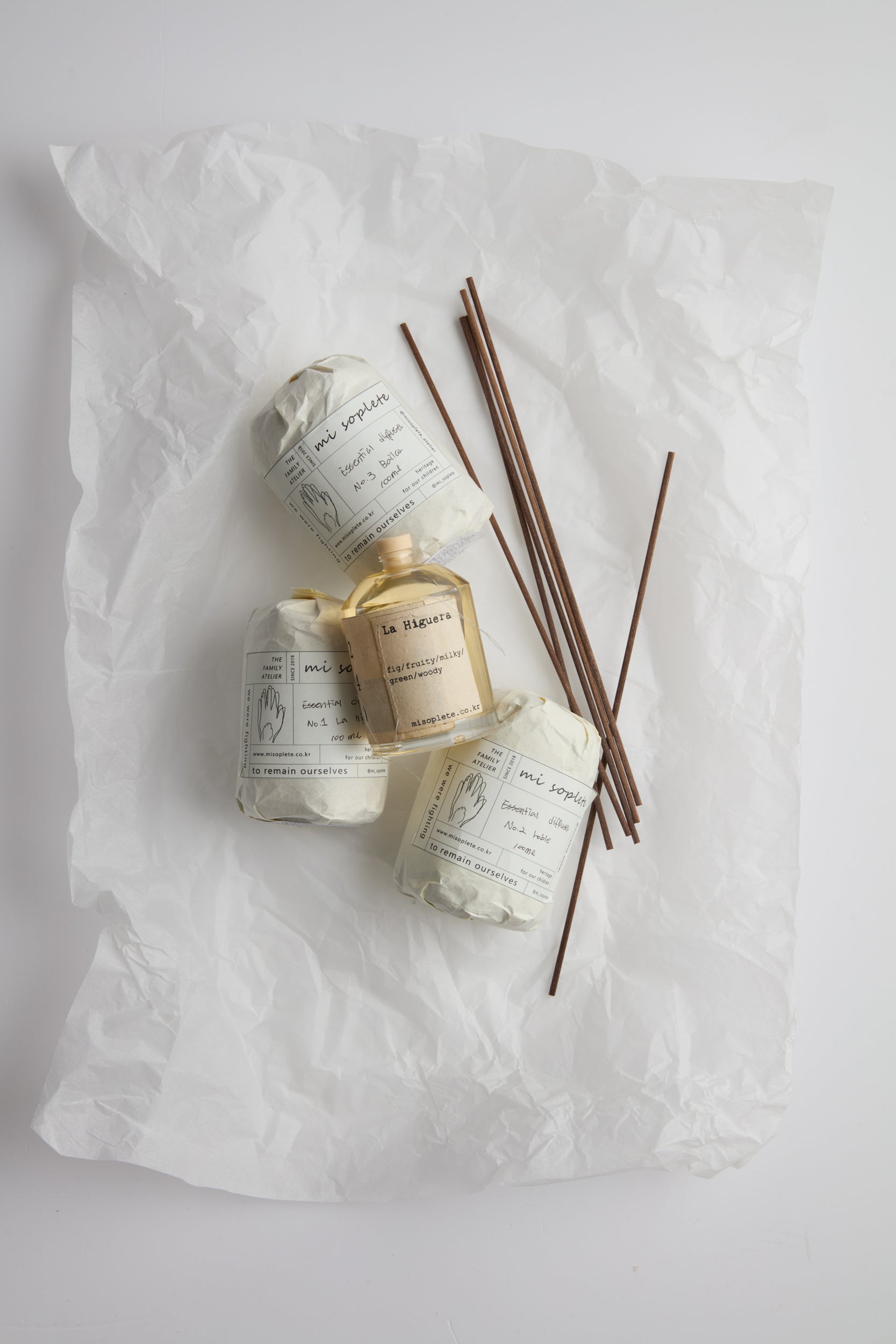 Mi Soplete is a small family-owned atelier in the beautiful Town of Paju, South Korea. Its owners, Hyunpung and Jigyeaom, make by hand every single item, whether it be candles, metalwork, or paintings and prints, with extraordinary attention to detail. Varied as their creations may be, they all share a strong creative concept based both on their individual authentic identities and on the shared identity of their family. The atelier’s name, which means ‘my torch’, emphasizes these concepts of identity even further. Hyunpung, the husband, works with metal, photography, and Korean paper, while Jigyeaom, the wife, creates fragrance products, candles and paintings. Their charming little daughter helps with the paintings and is the inspiration behind their works.