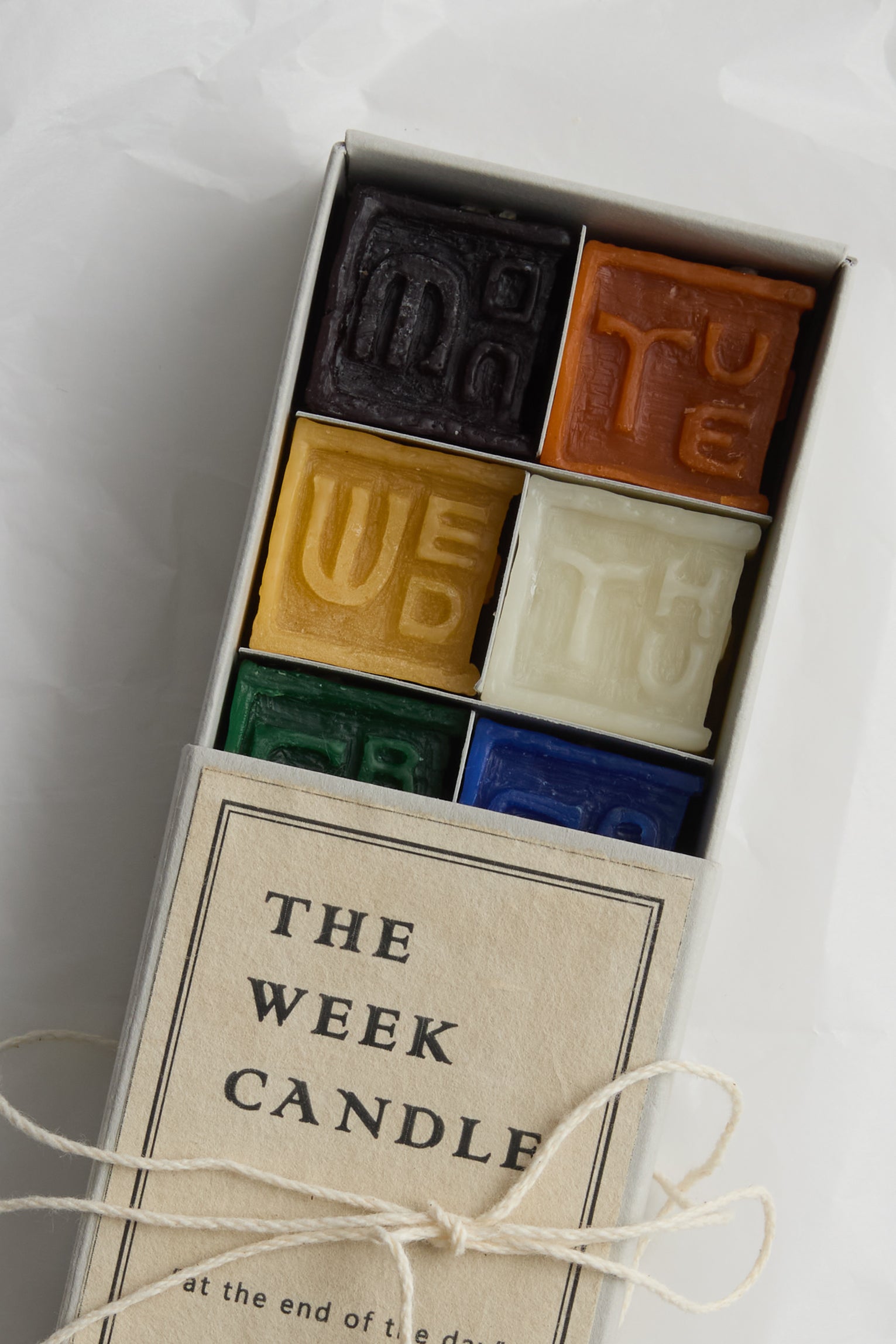 The week candle by Mi Soplete. A charming and creative set of seven little cubed candles, hand carved with the days of the week. Made of 100% natural beeswax that contains propolis, a natural antibiotic that protects beehives, it is effective in eliminating bacteria in the air (fine dust), preventing rhinitis, enhancing immunity, and treating asthma. This product is filled with the unique sensibility of Mi Soplete, and the rough traces of the carving are left intact as an expression of the hand-carving process. Colors are randomly produced among yellow, dark brown, orange, blue, green, white, and black.
