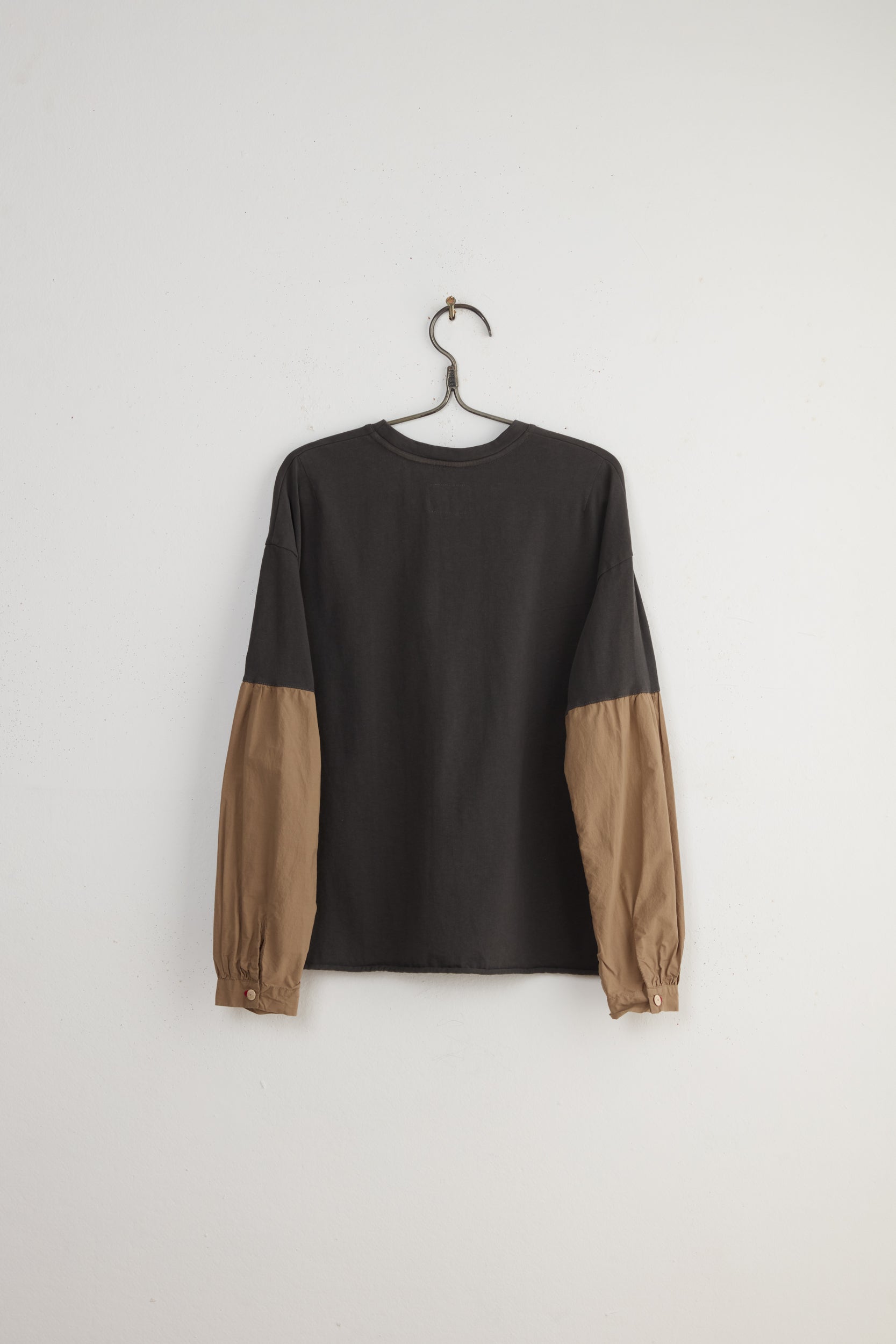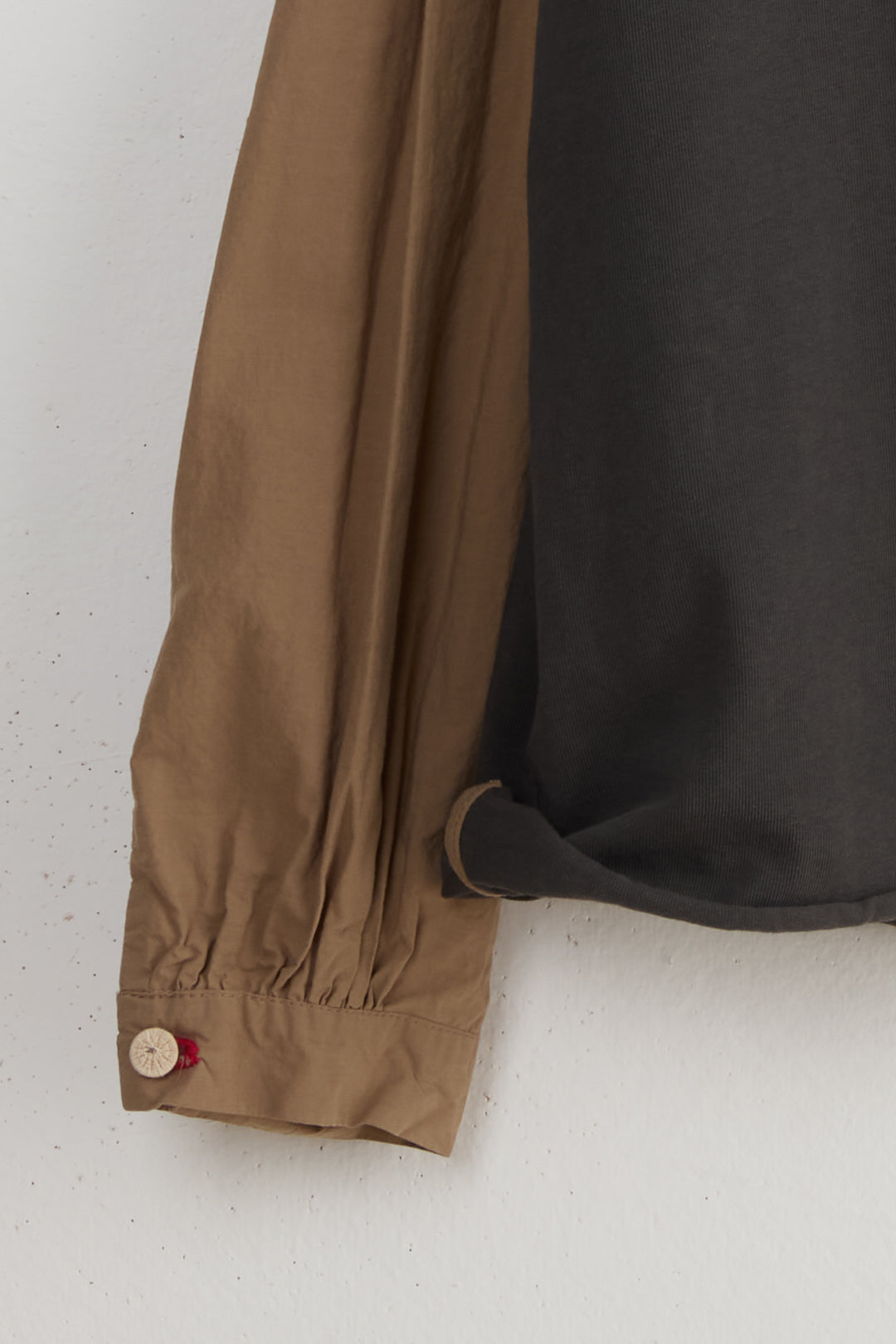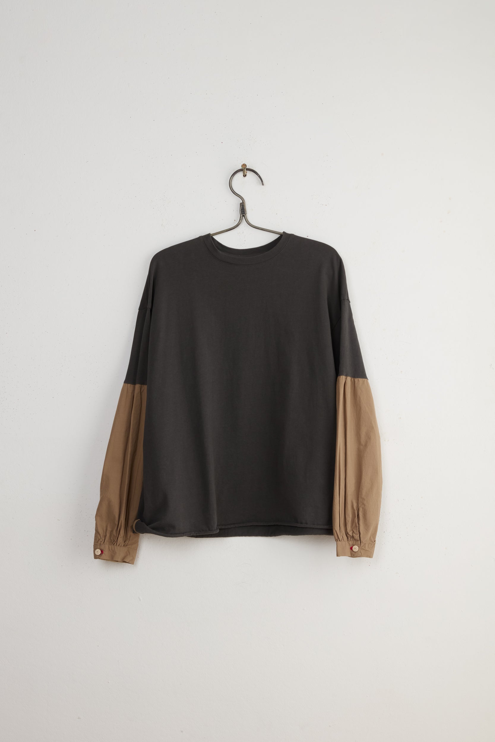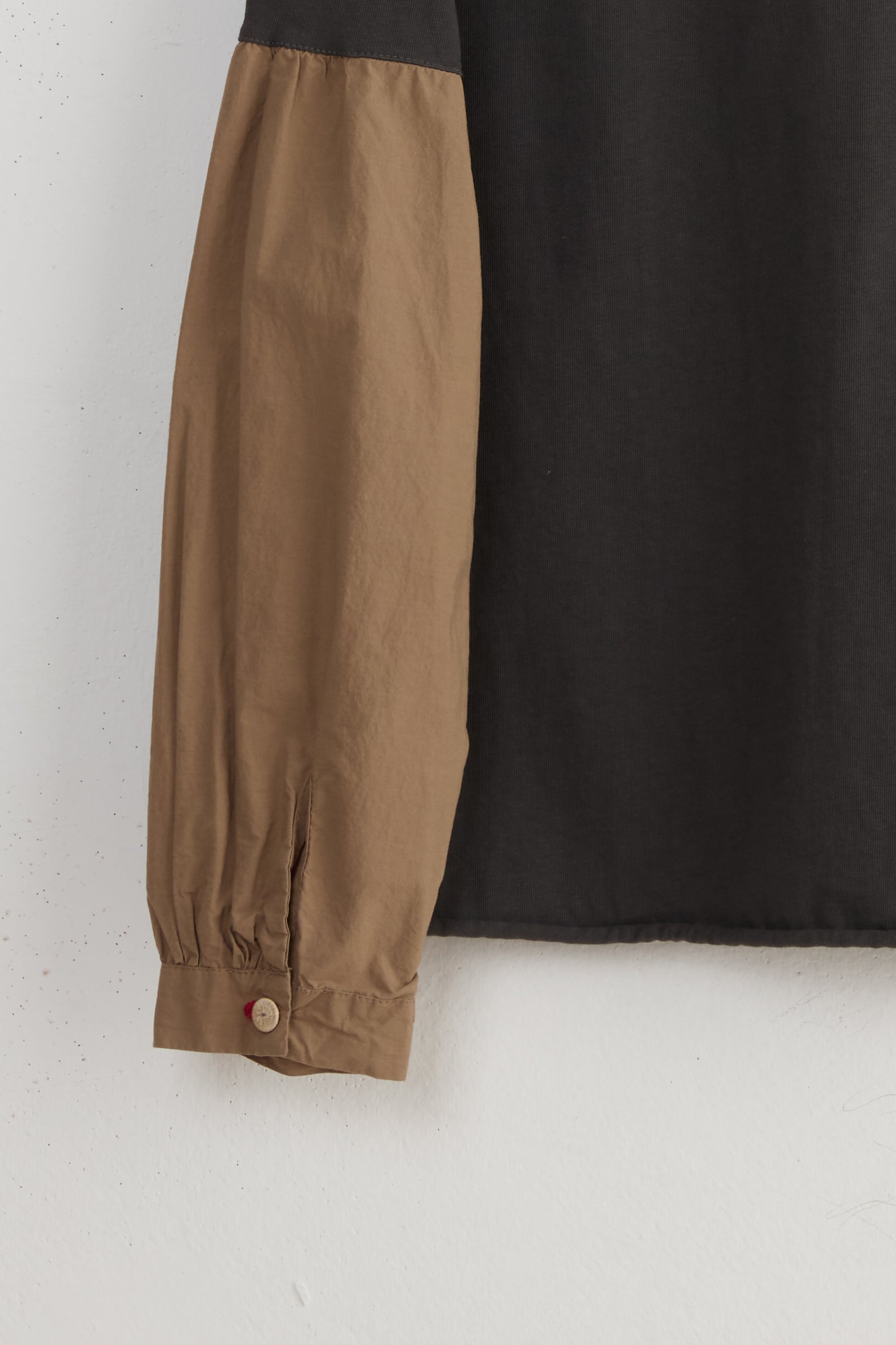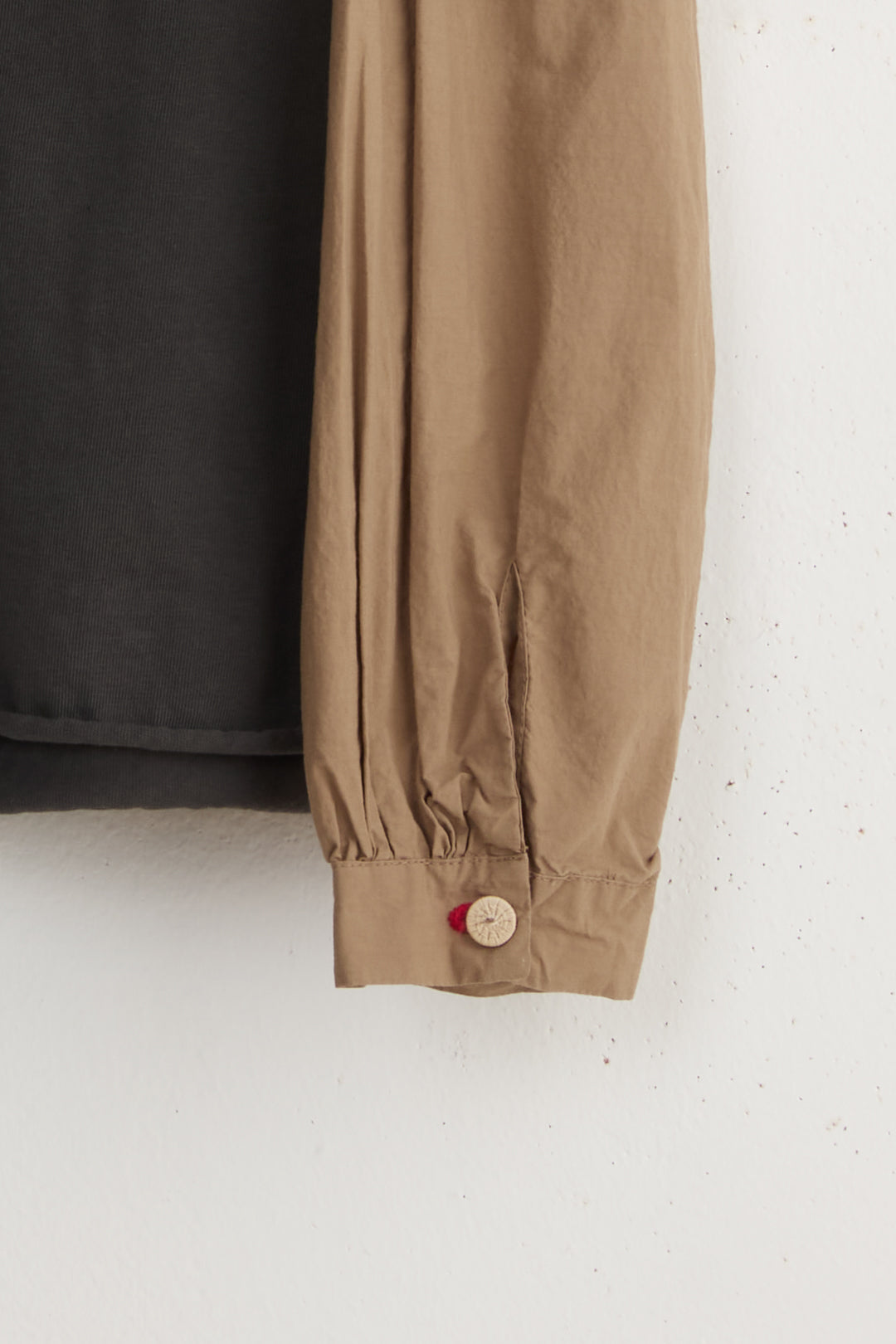 Nabi Cotton long-sleeve shirt by Maya Zukerman. Inspired by Korean agricultural wear, and named after the Korean word for butterfly, the “Nabi” shirt is a Maya Zukerman staple. made of mid-weight jersey with colorful, slightly ruffled paper cotton sleeves, featuring Dorset cuff buttons and a matching inner finish. The oversized fit creates a comfortable yet chic look. Composed of Japanese and Italian natural fabrics and made exclusively in Israel.