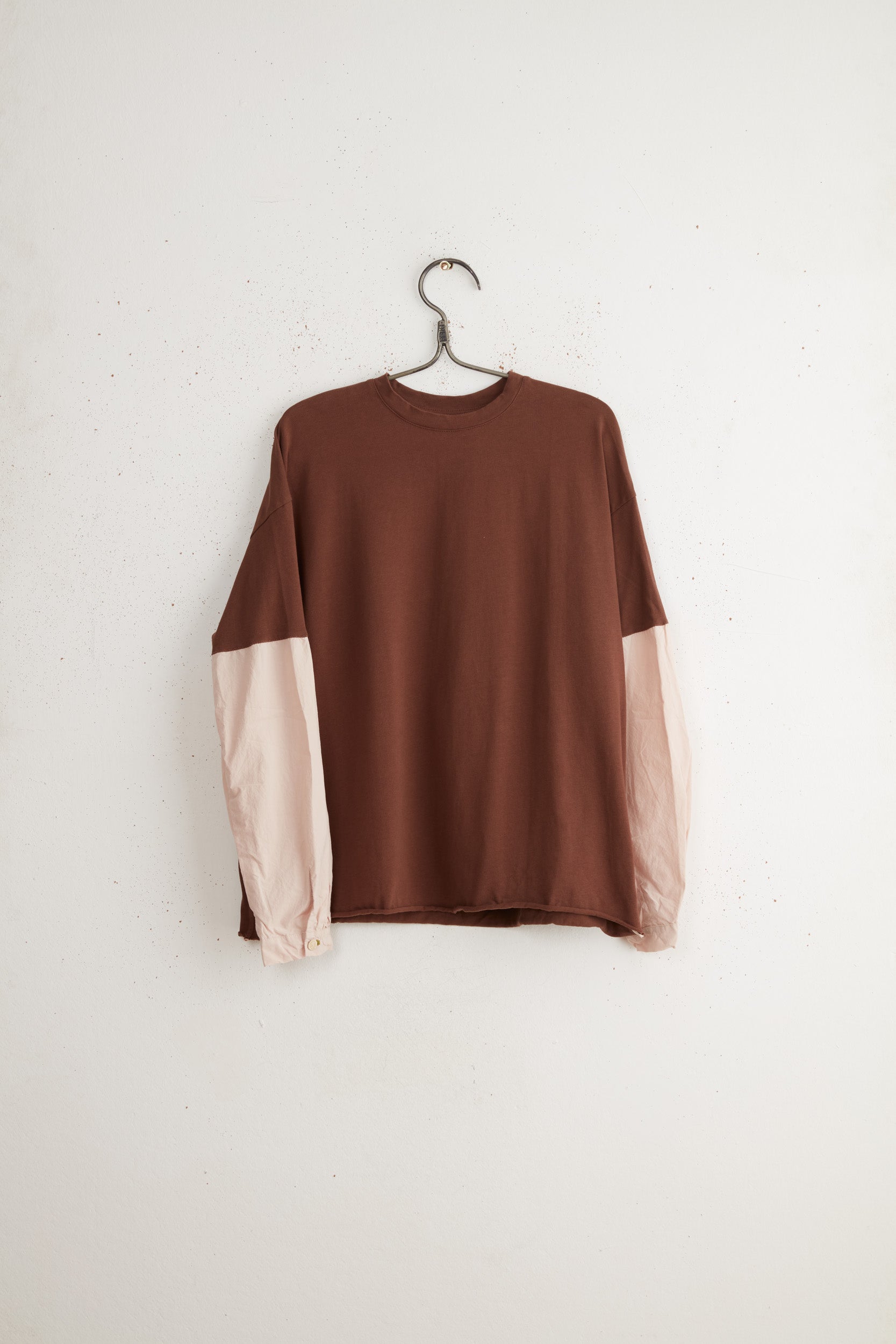 Nabi Cotton long-sleeve shirt by Maya Zukerman. Inspired by Korean agricultural wear, and named after the Korean word for butterfly, the “Nabi” shirt is a Maya Zukerman staple. made of mid-weight jersey with colorful, slightly ruffled paper cotton sleeves, featuring Dorset cuff buttons and a matching inner finish. The oversized fit creates a comfortable yet chic look. Composed of Japanese and Italian natural fabrics and made exclusively in Israel.