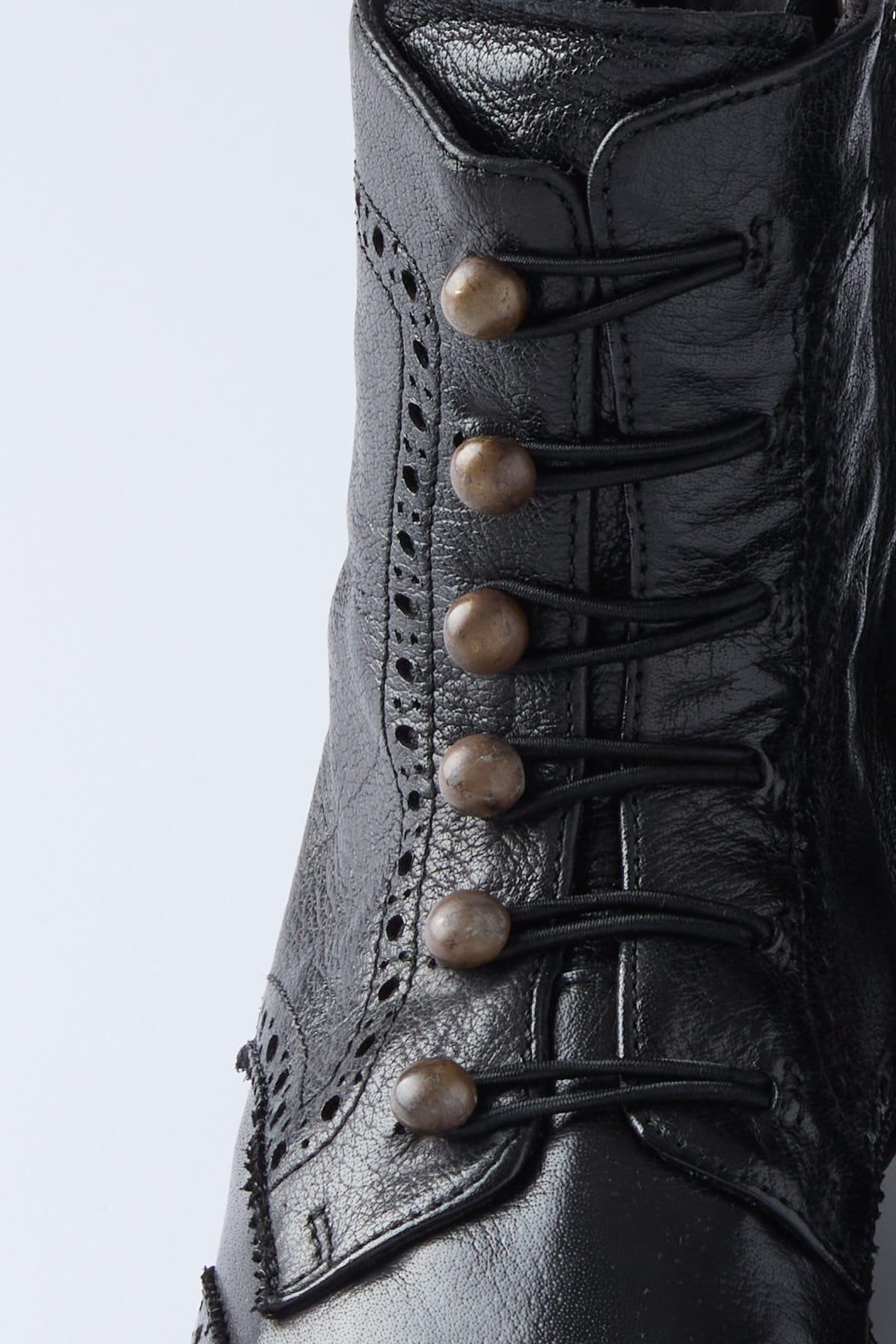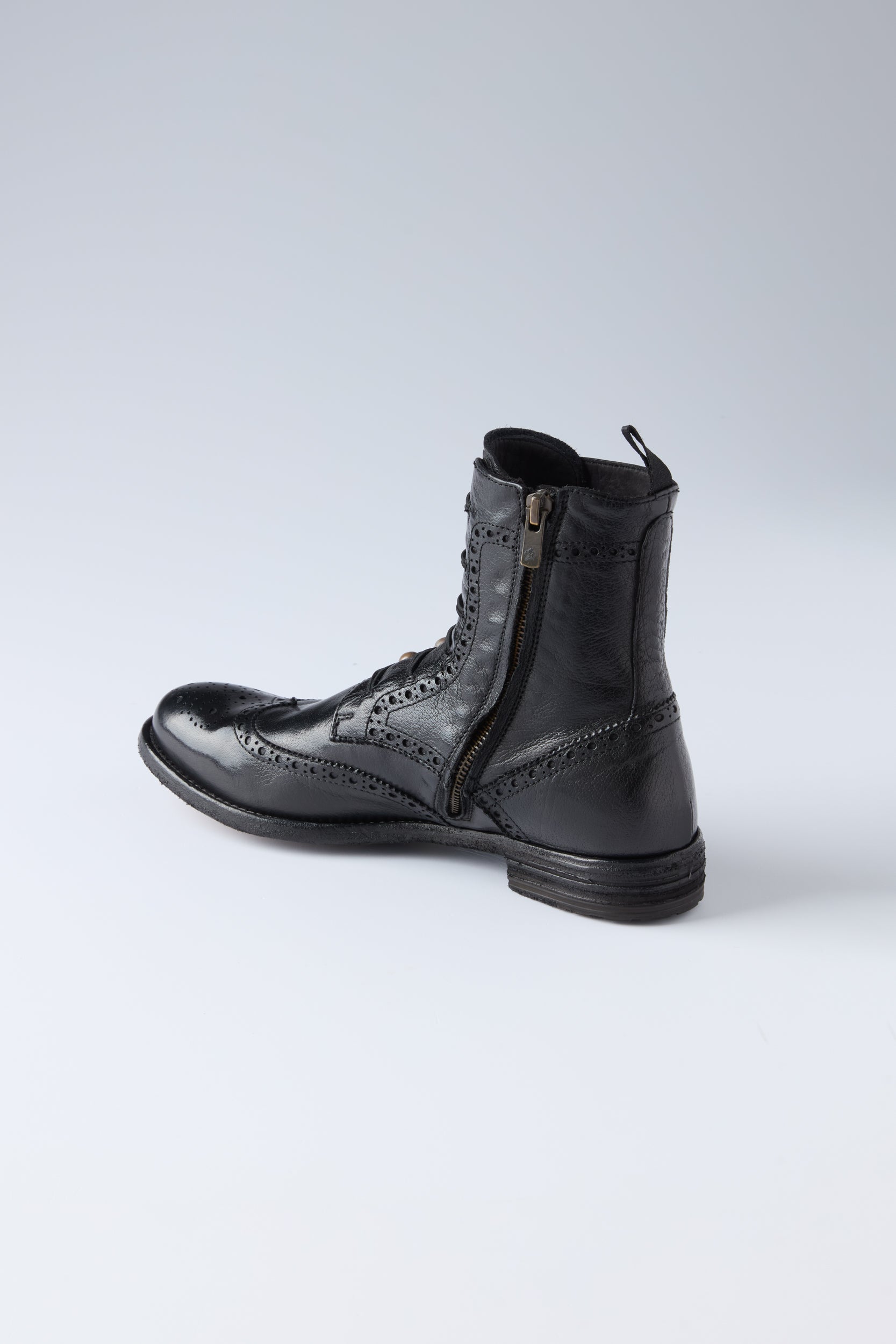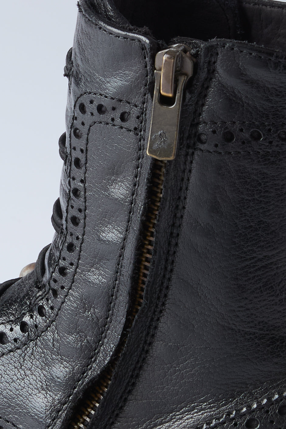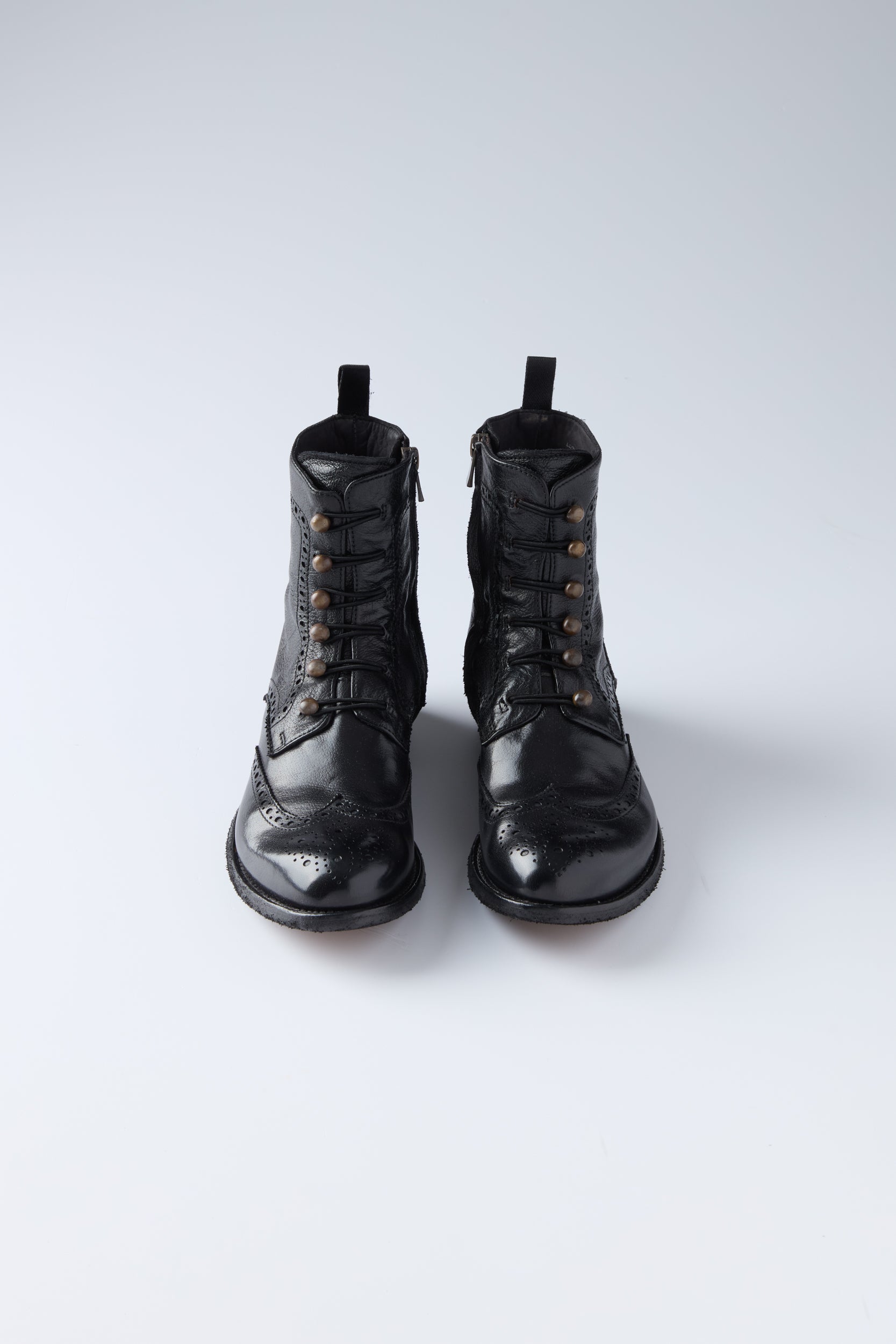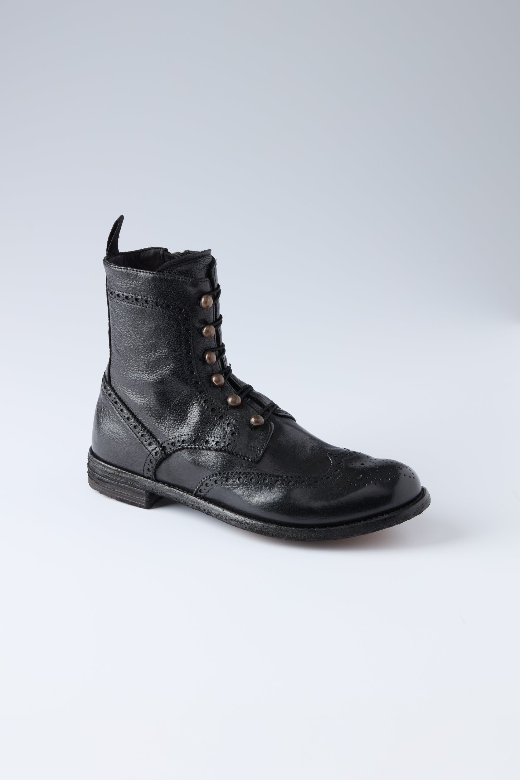 LEXIKON 131 boots by Italian shoe makers Officine Creative. ankle boots crafted from high quality soft leather. An almond-shaped silhouette with a brogue motif and gold-tone pearl buttons closure and elasticated eyelets. side zip fastening, grosgrain heel pull tab and a leather sole with low stacked heel and tread rubber inserts. Large fit. Take one size down. Heel height : 20 mm