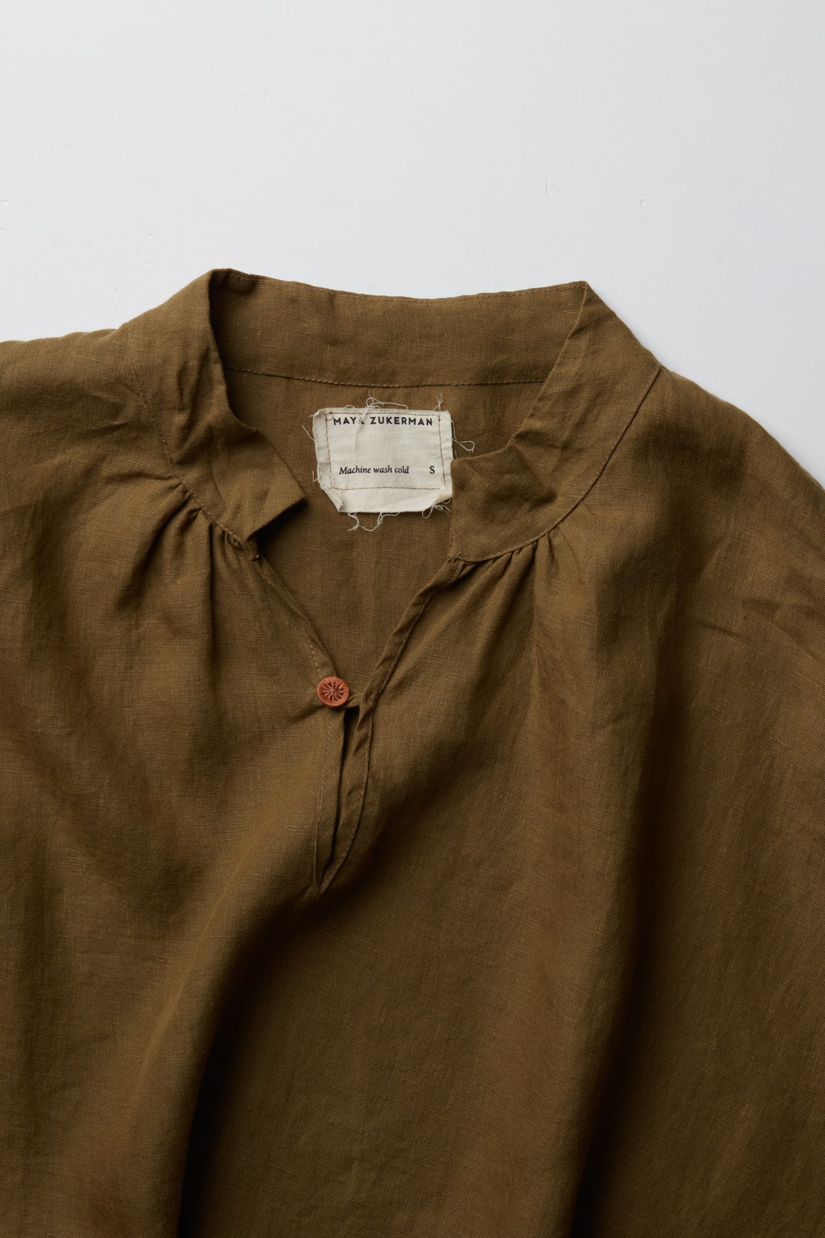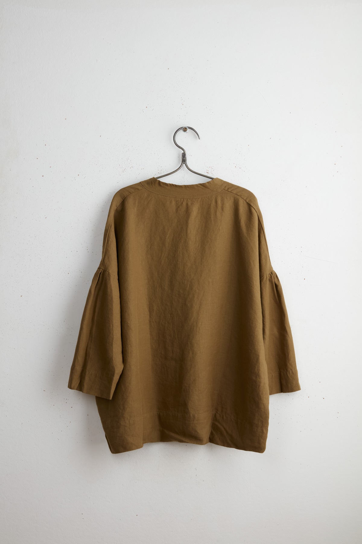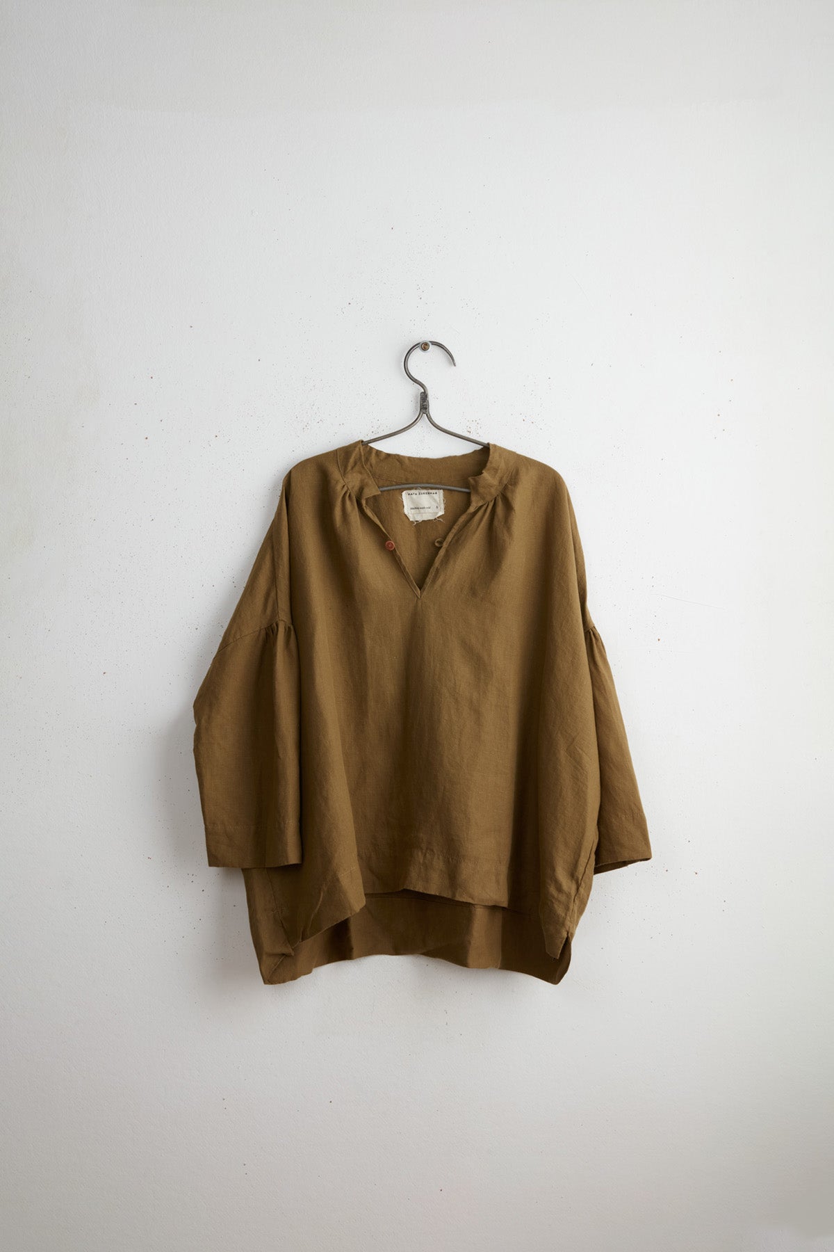 Polly linen shirt by Maya Zukerman. This light-weight, flowy silhouette is one of the brand’s signature cuts, now in a soft linen version. Made for year-round wear, a wide oversized fit with dropped shoulder and gathered sleeves. A wide hem fitting shorter on the front. Details include side slits, cuff slits and a low flat mandarin collar with hand dyed Dorset button closure and gathered edges.
