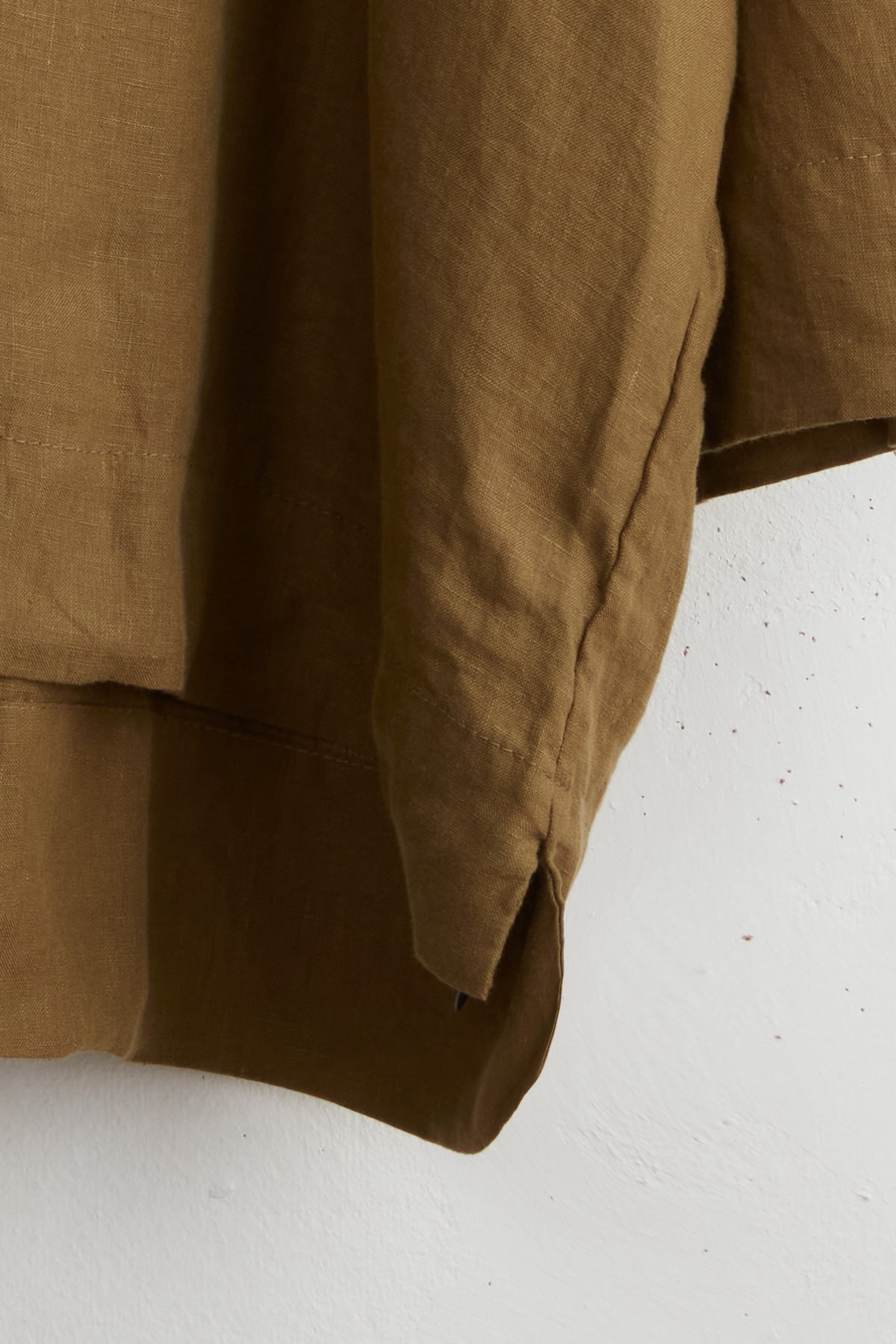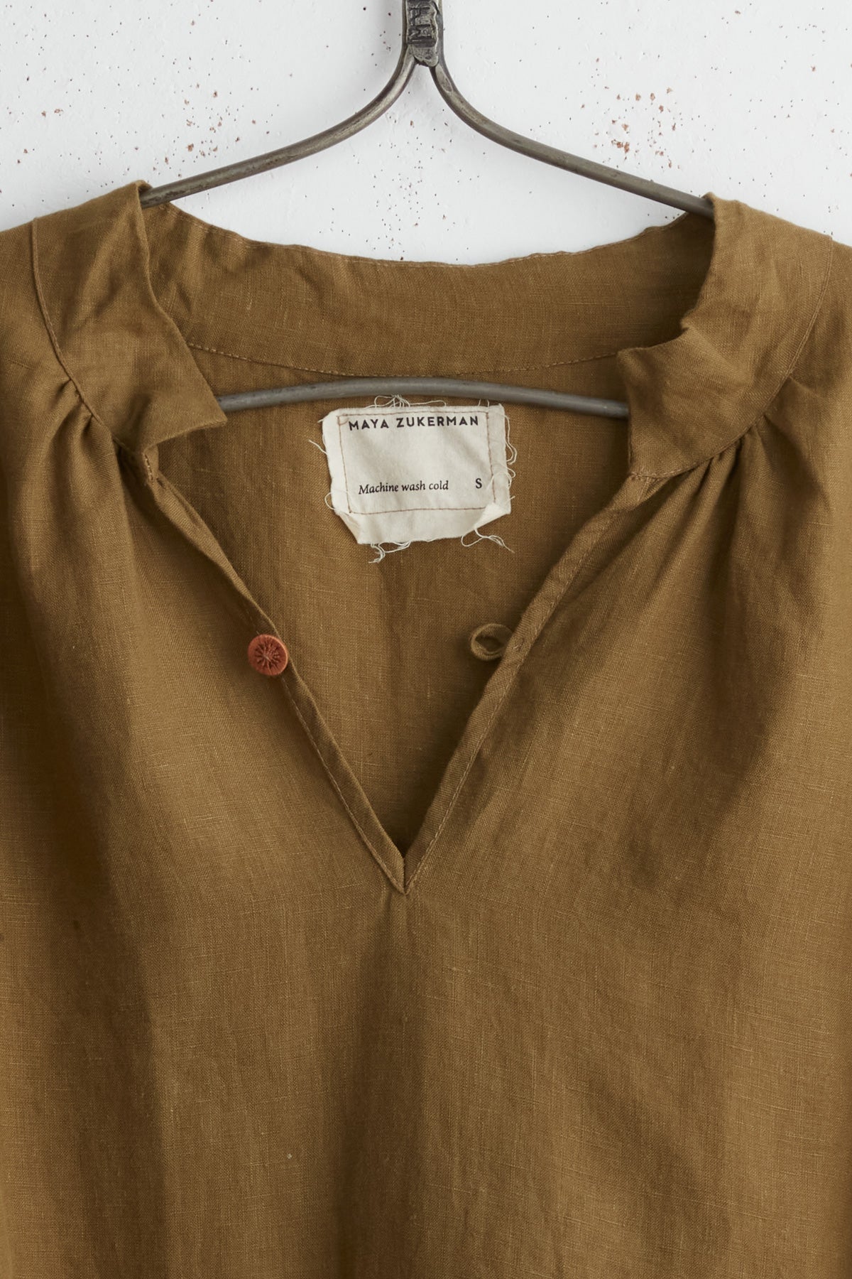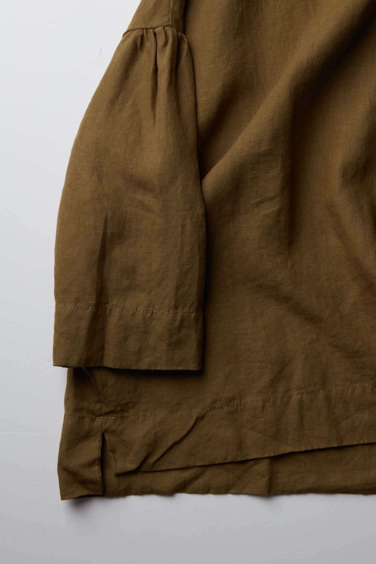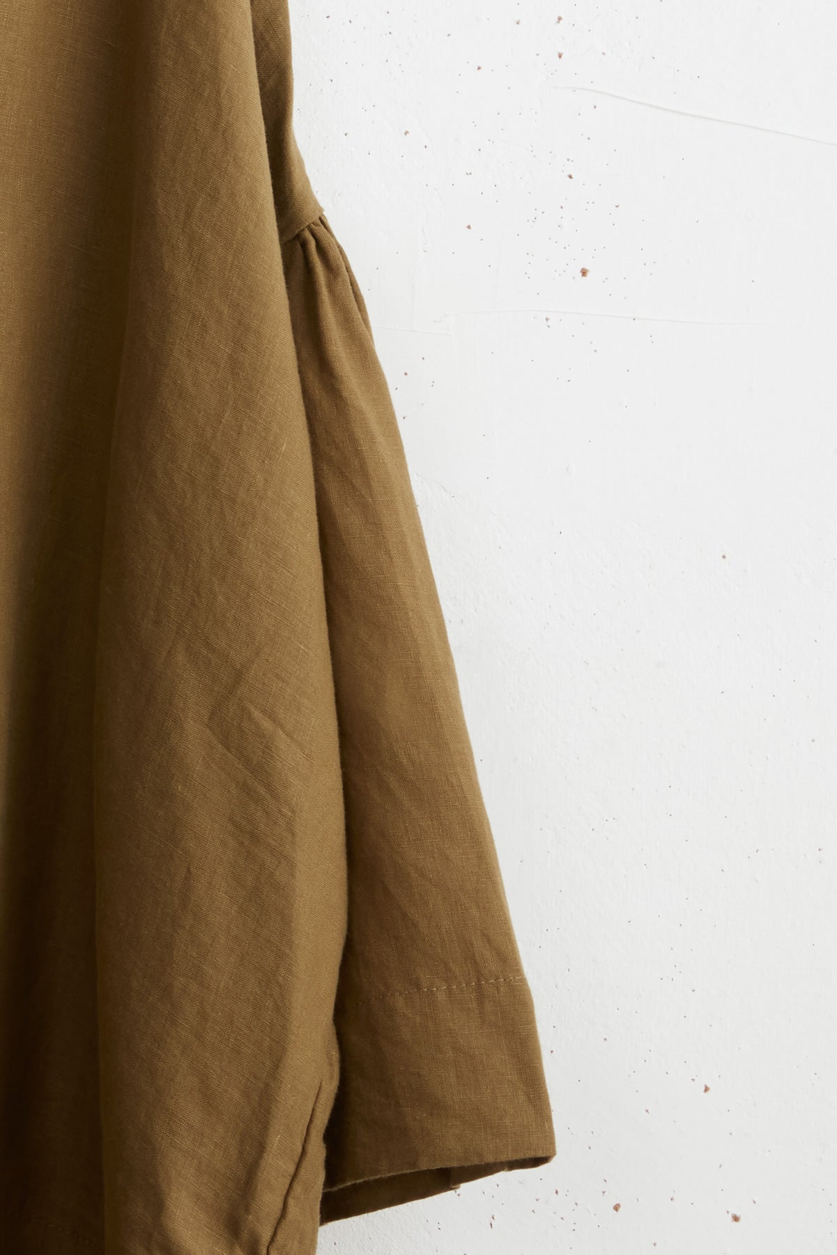 Polly linen shirt by Maya Zukerman. This light-weight, flowy silhouette is one of the brand’s signature cuts, now in a soft linen version. Made for year-round wear, a wide oversized fit with dropped shoulder and gathered sleeves. A wide hem fitting shorter on the front. Details include side slits, cuff slits and a low flat mandarin collar with hand dyed Dorset button closure and gathered edges.