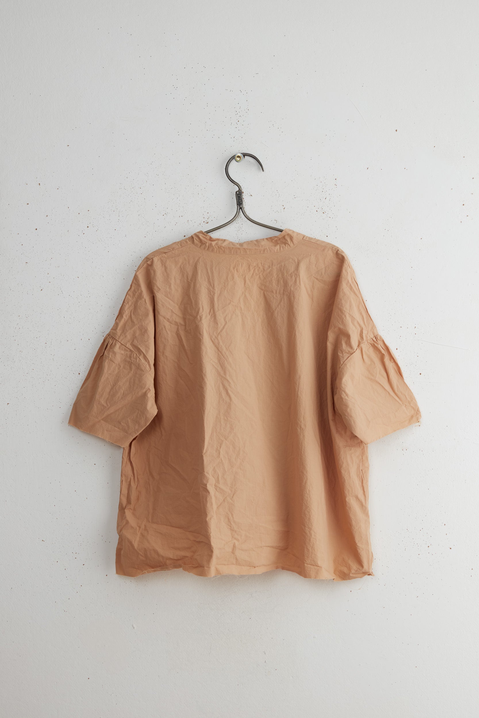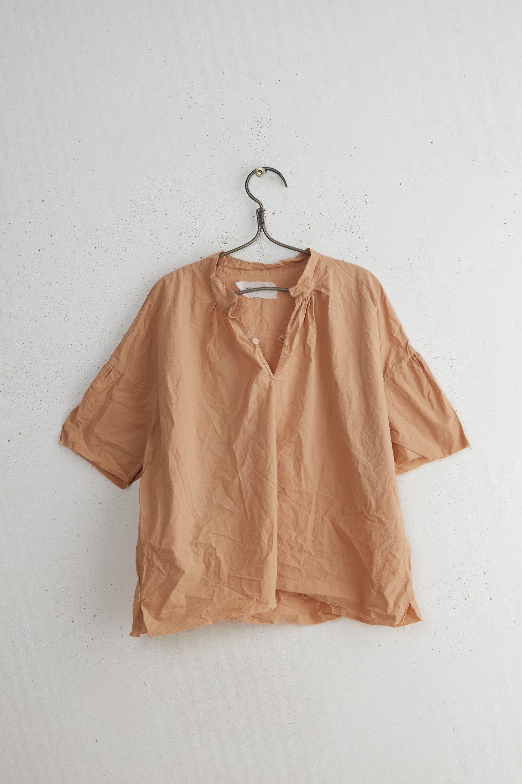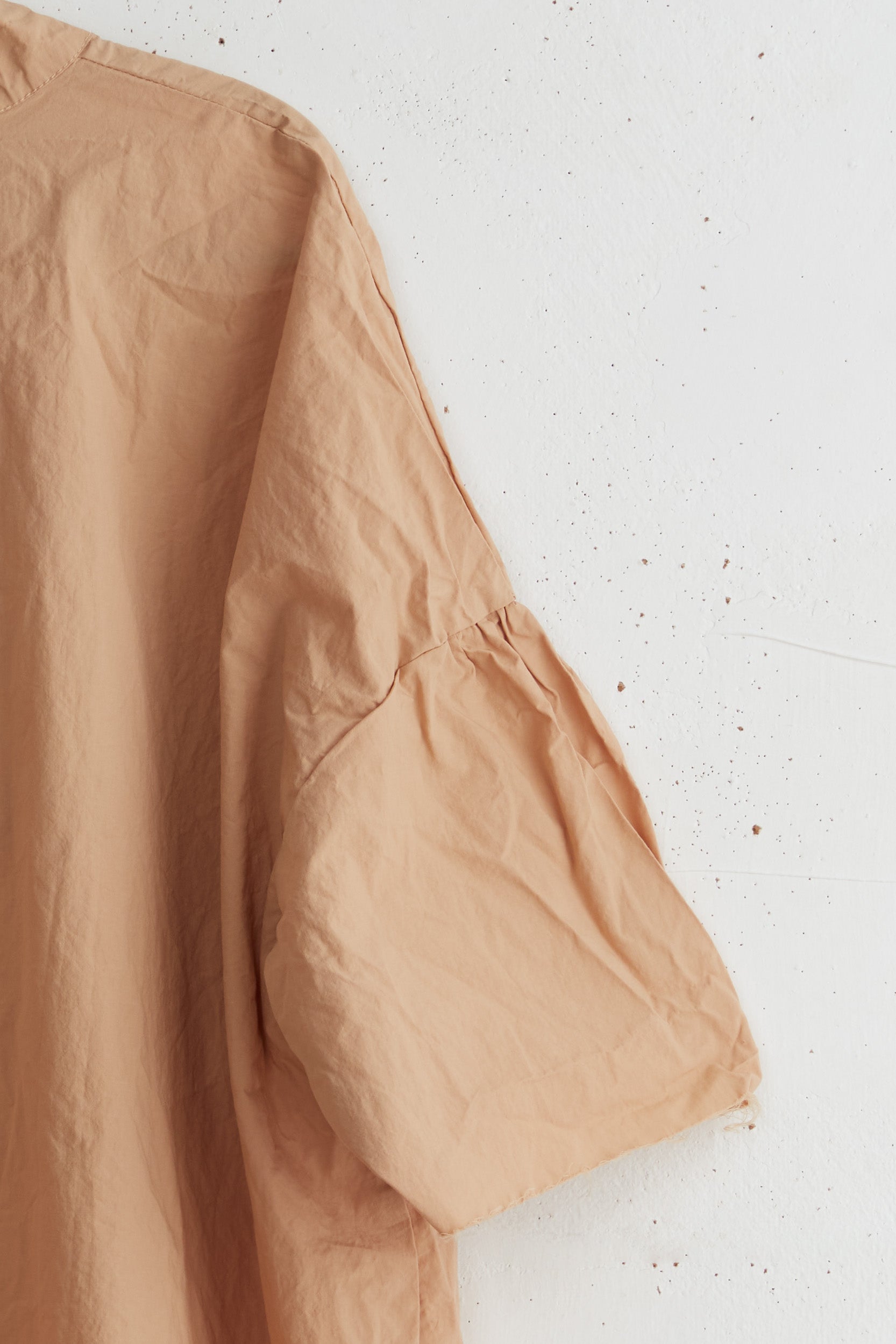 Polly short shirt by Maya Zukerman. The beloved polly shirt in a new summer version. wide oversized fit in a crisp, light-weight paper cotton. with dropped shoulders, gathered short sleeve and raw hems fitting shorter on the front. Details include side slits and a low flat mandarin collar with hand dyed Dorset button closure and gathered edges.
