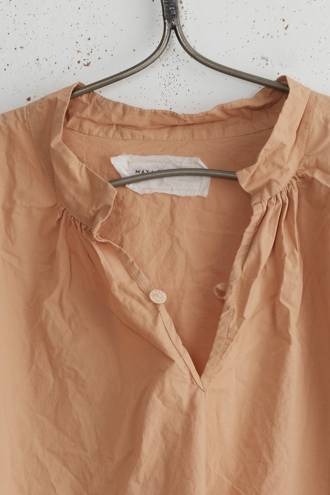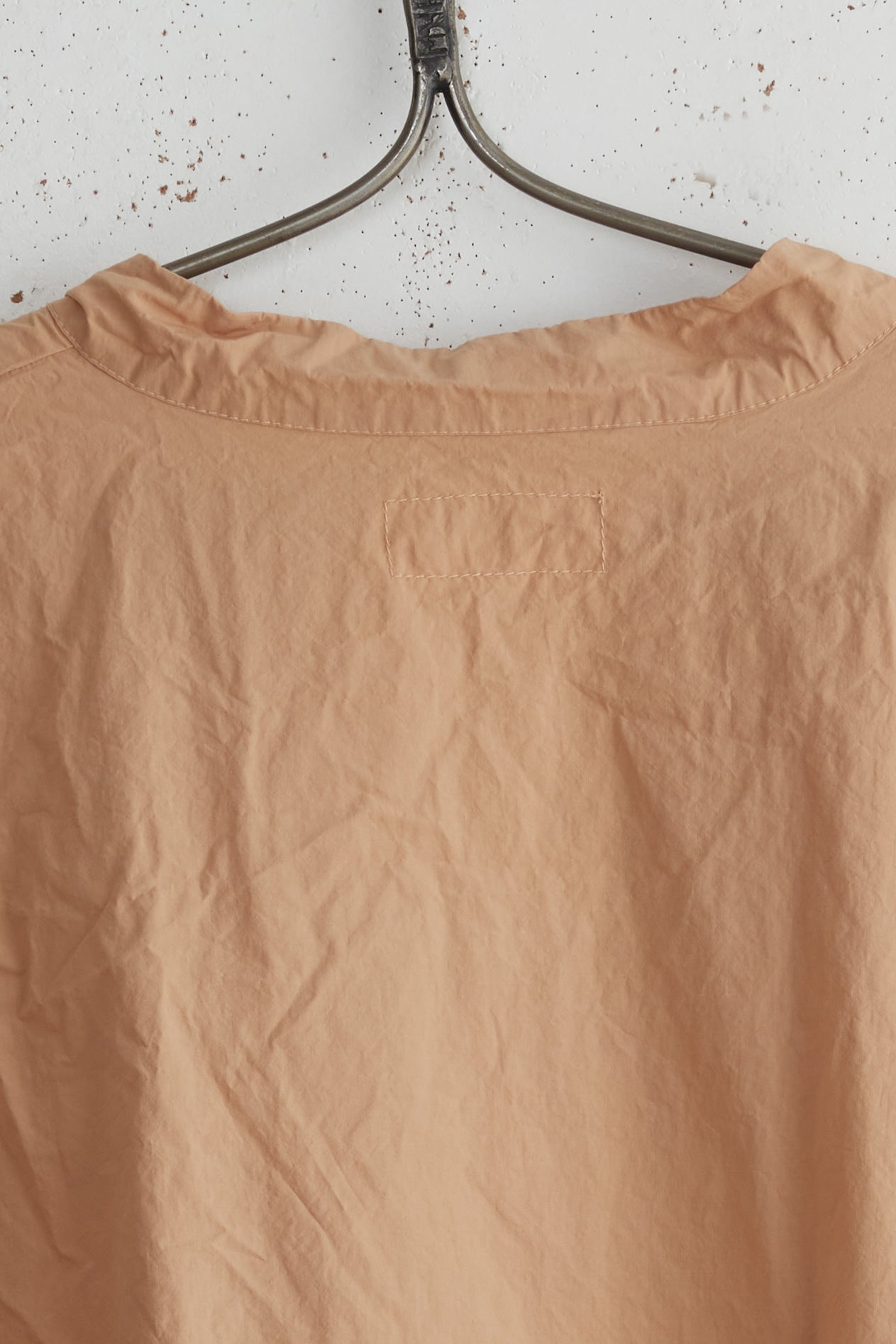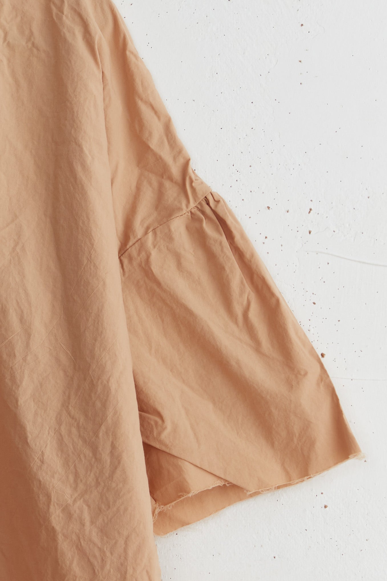 Polly short shirt by Maya Zukerman. The beloved polly shirt in a new summer version. wide oversized fit in a crisp, light-weight paper cotton. with dropped shoulders, gathered short sleeve and raw hems fitting shorter on the front. Details include side slits and a low flat mandarin collar with hand dyed Dorset button closure and gathered edges.