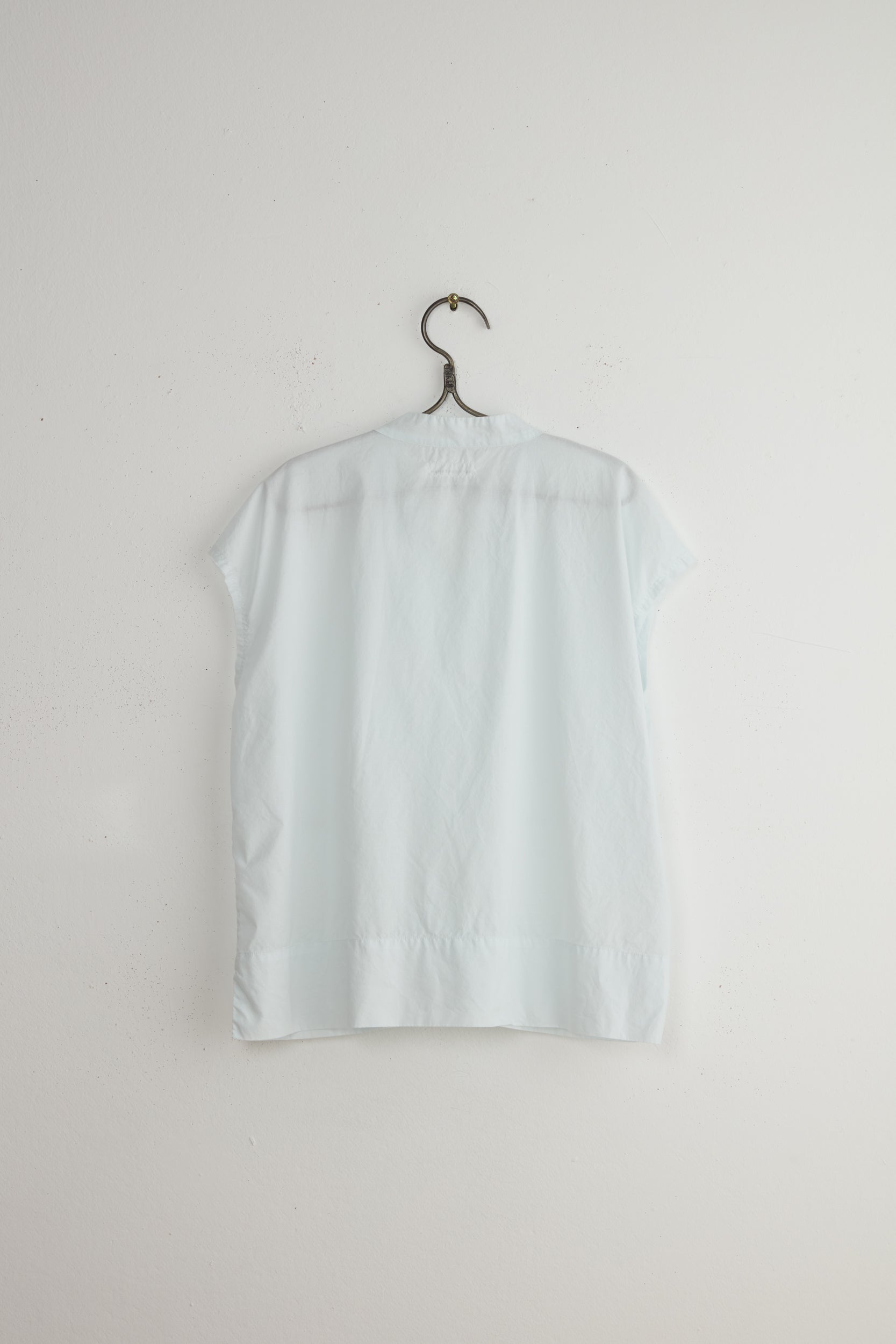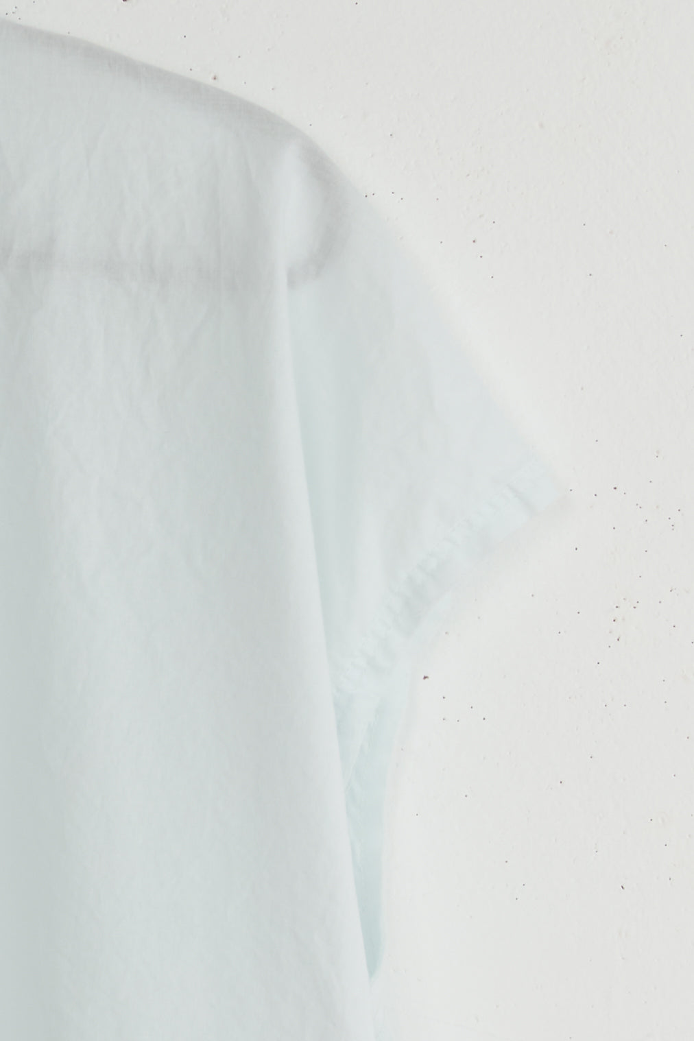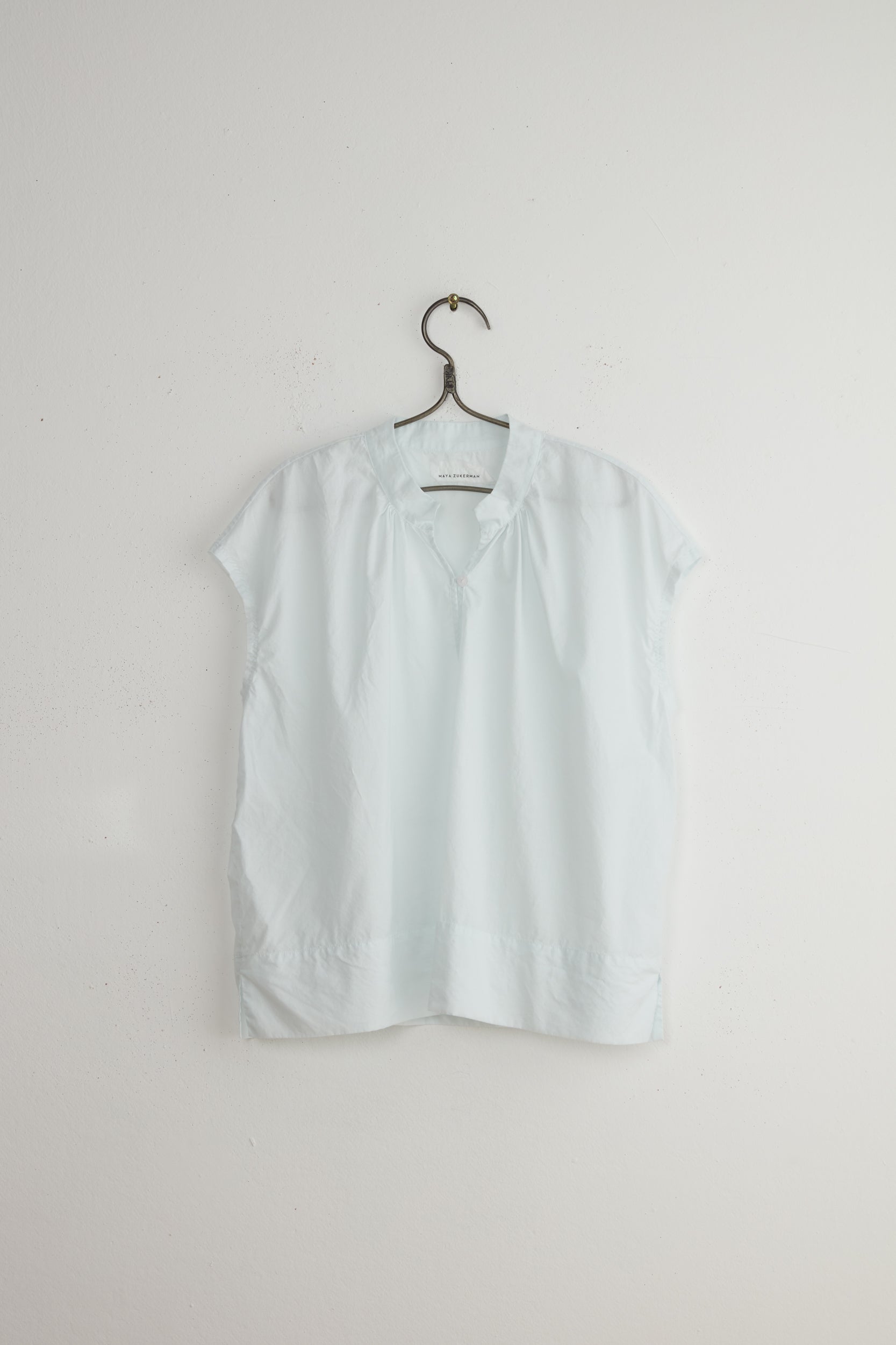 Polly slvless shirt by Maya Zukerman. The beloved polly shirt in a new sleeveless summer version. A wide, oversized blouse made from a crisp, light-weight paper cotton. with a dropped shoulder line and raw hems fitting shorter on the front. Details include side slits and a low flat mandarin collar with a hand dyed Dorset button and gathered edges.
