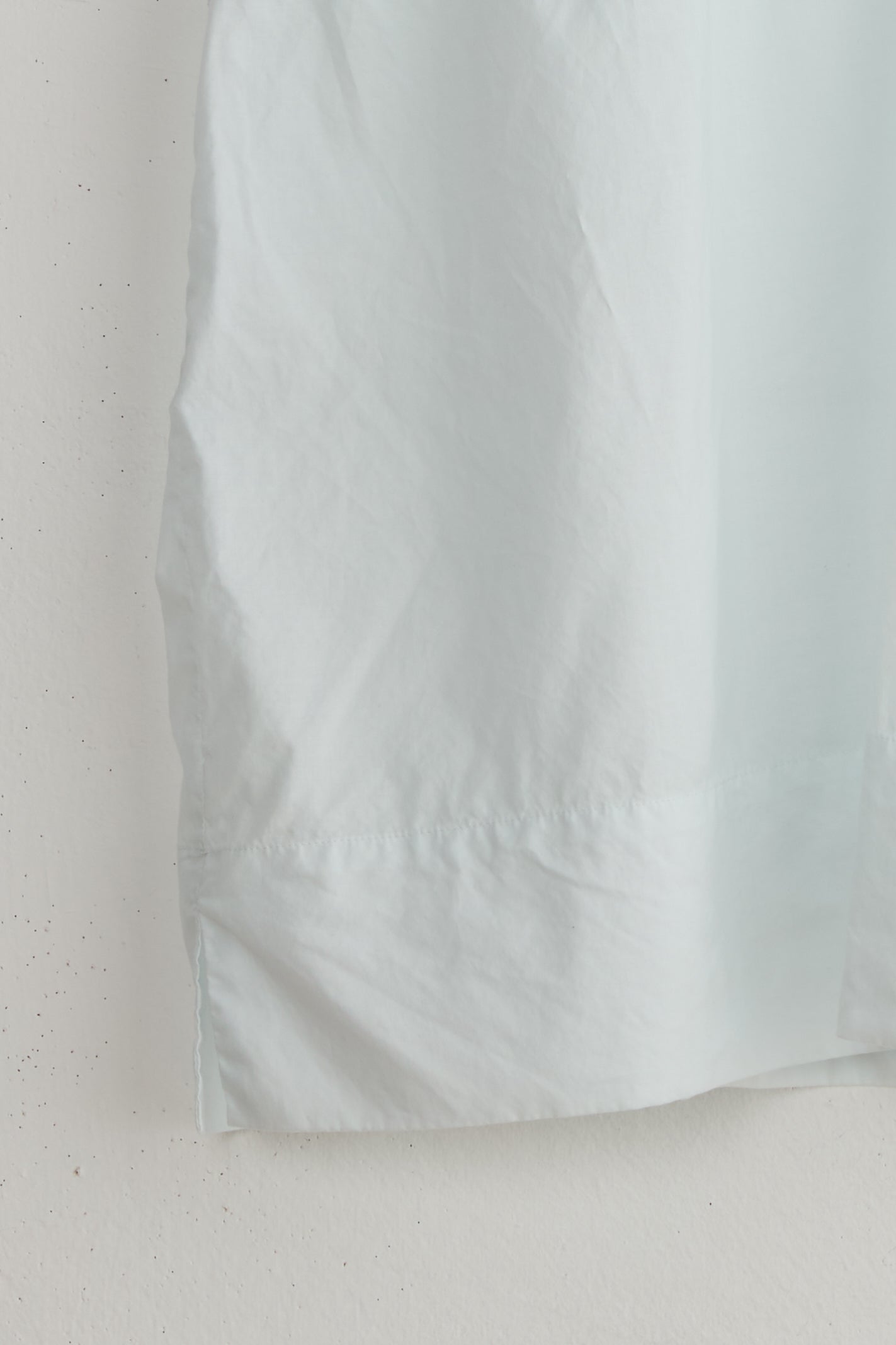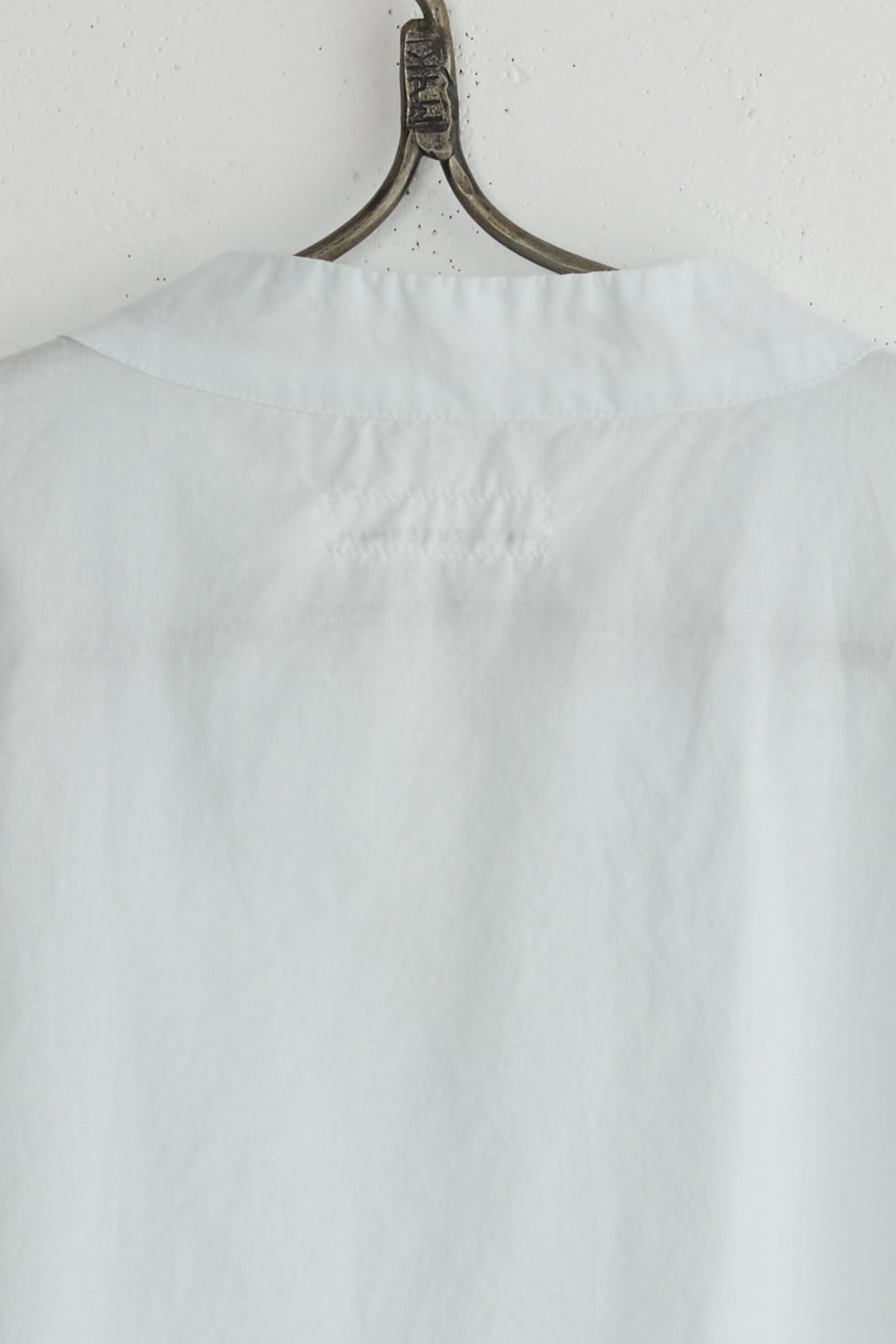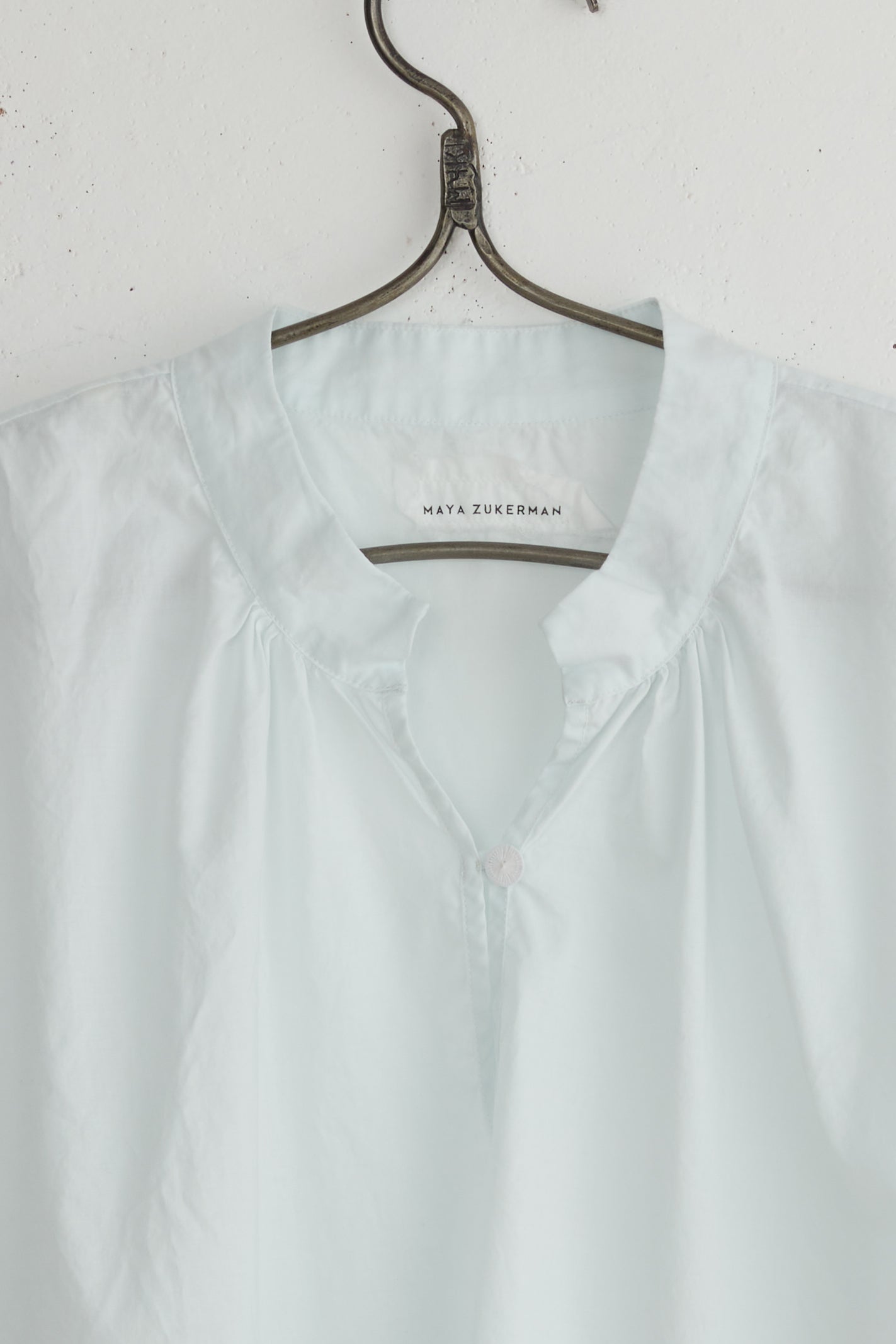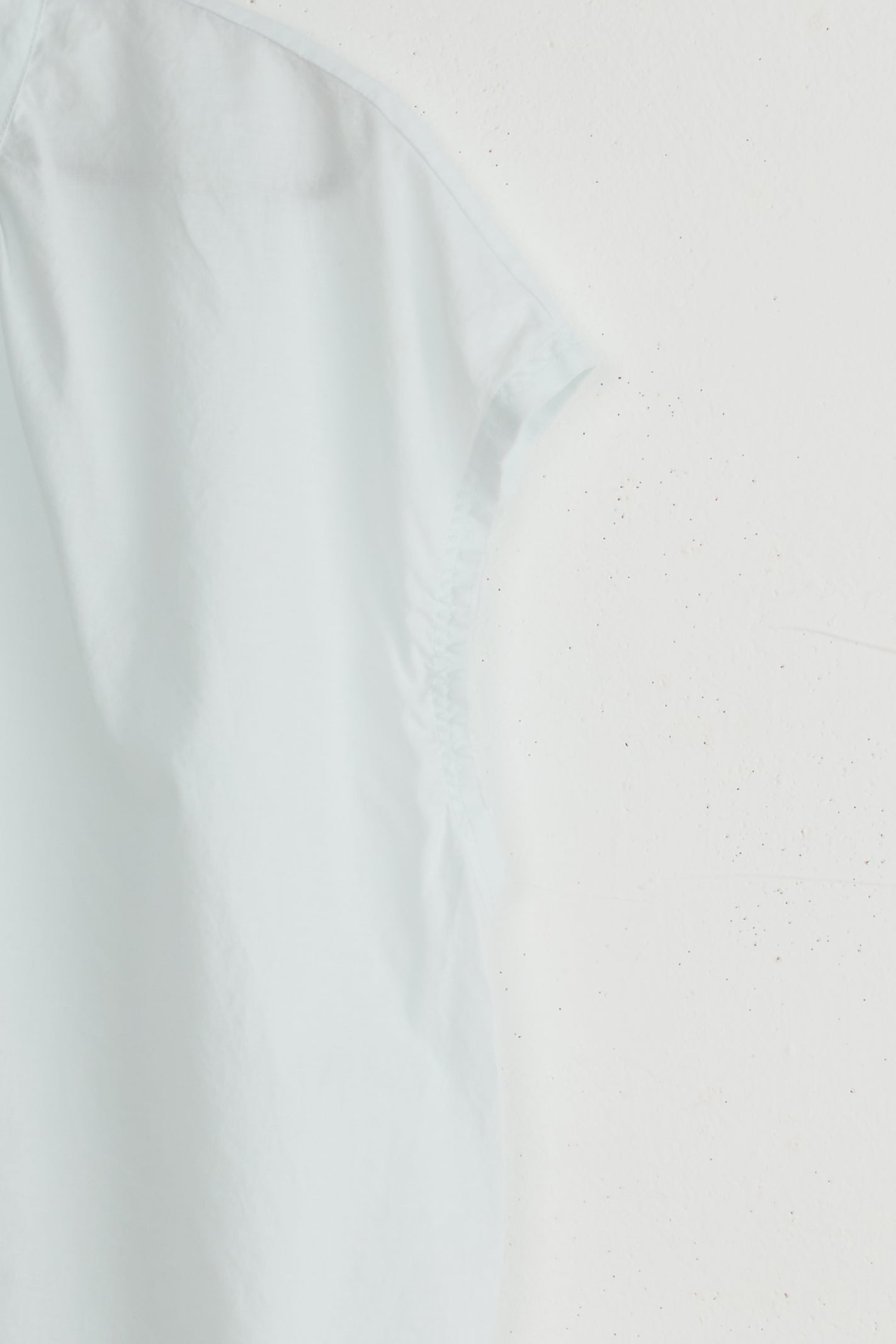 Polly slvless shirt by Maya Zukerman. The beloved polly shirt in a new sleeveless summer version. A wide, oversized blouse made from a crisp, light-weight paper cotton. with a dropped shoulder line and raw hems fitting shorter on the front. Details include side slits and a low flat mandarin collar with a hand dyed Dorset button and gathered edges.