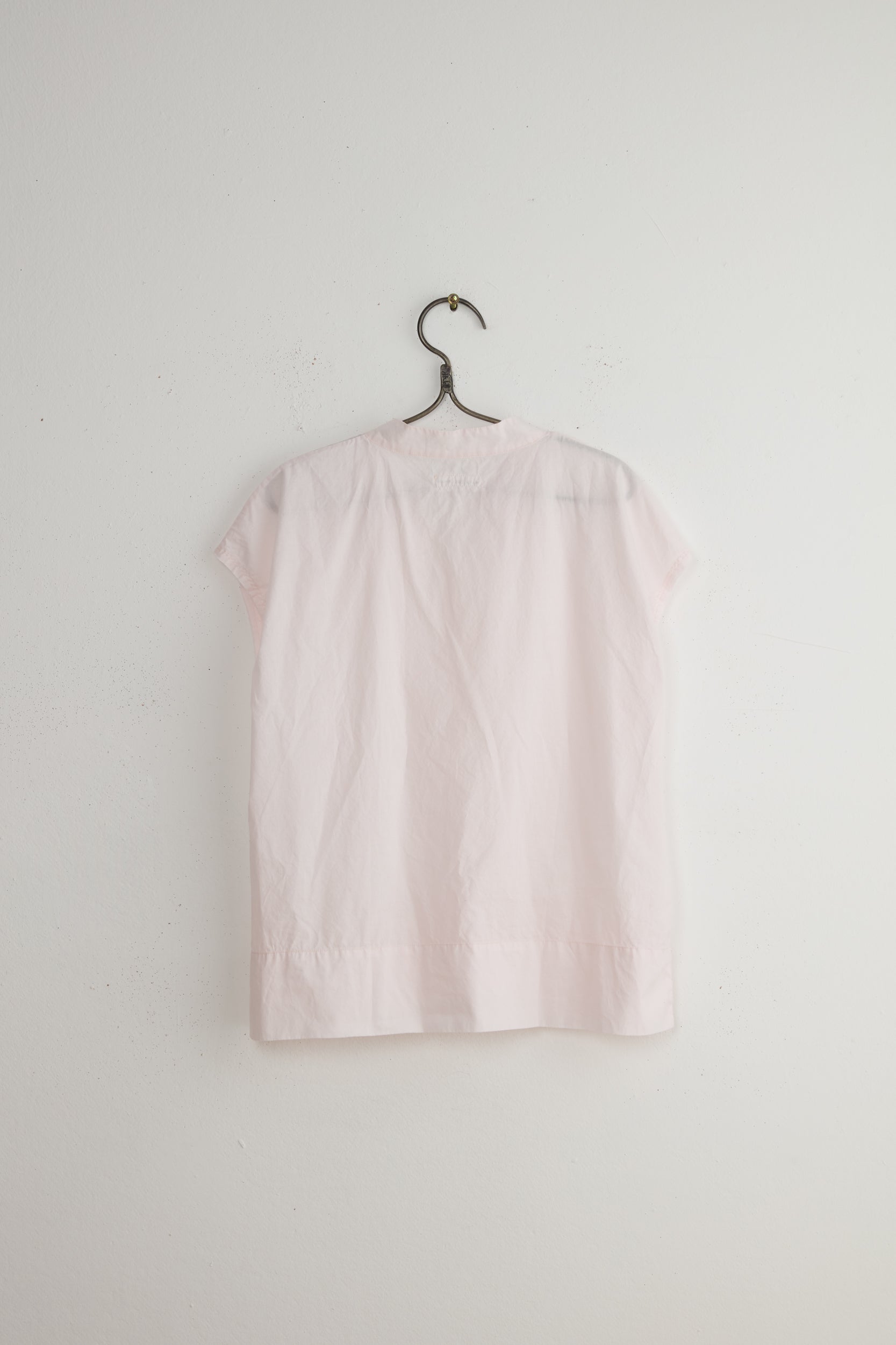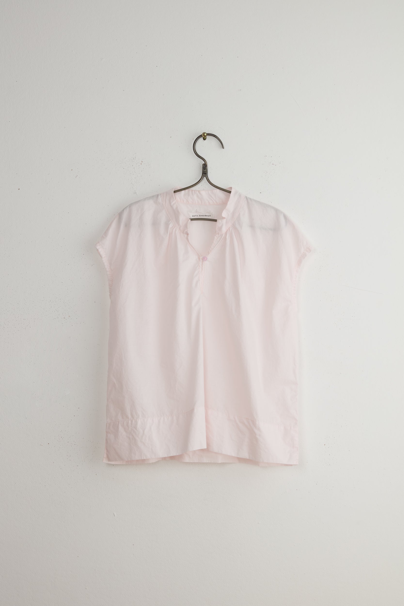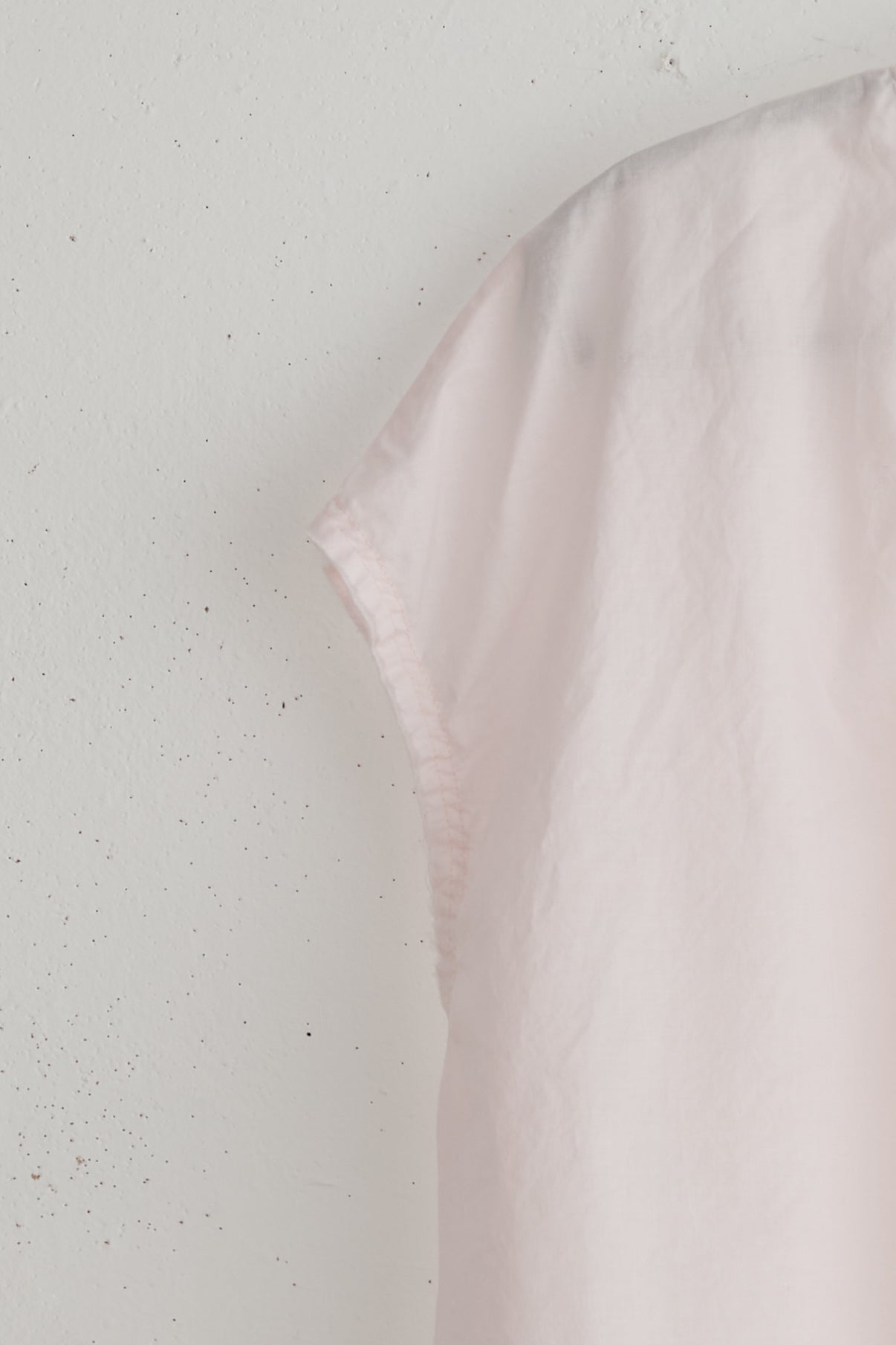 Polly slvless shirt by Maya Zukerman. The beloved polly shirt in a new sleeveless summer version. A wide, oversized blouse made from a crisp, light-weight paper cotton. with a dropped shoulder line and raw hems fitting shorter on the front. Details include side slits and a low flat mandarin collar with a hand dyed Dorset button and gathered edges.