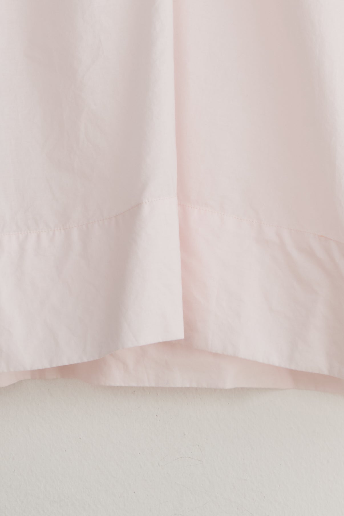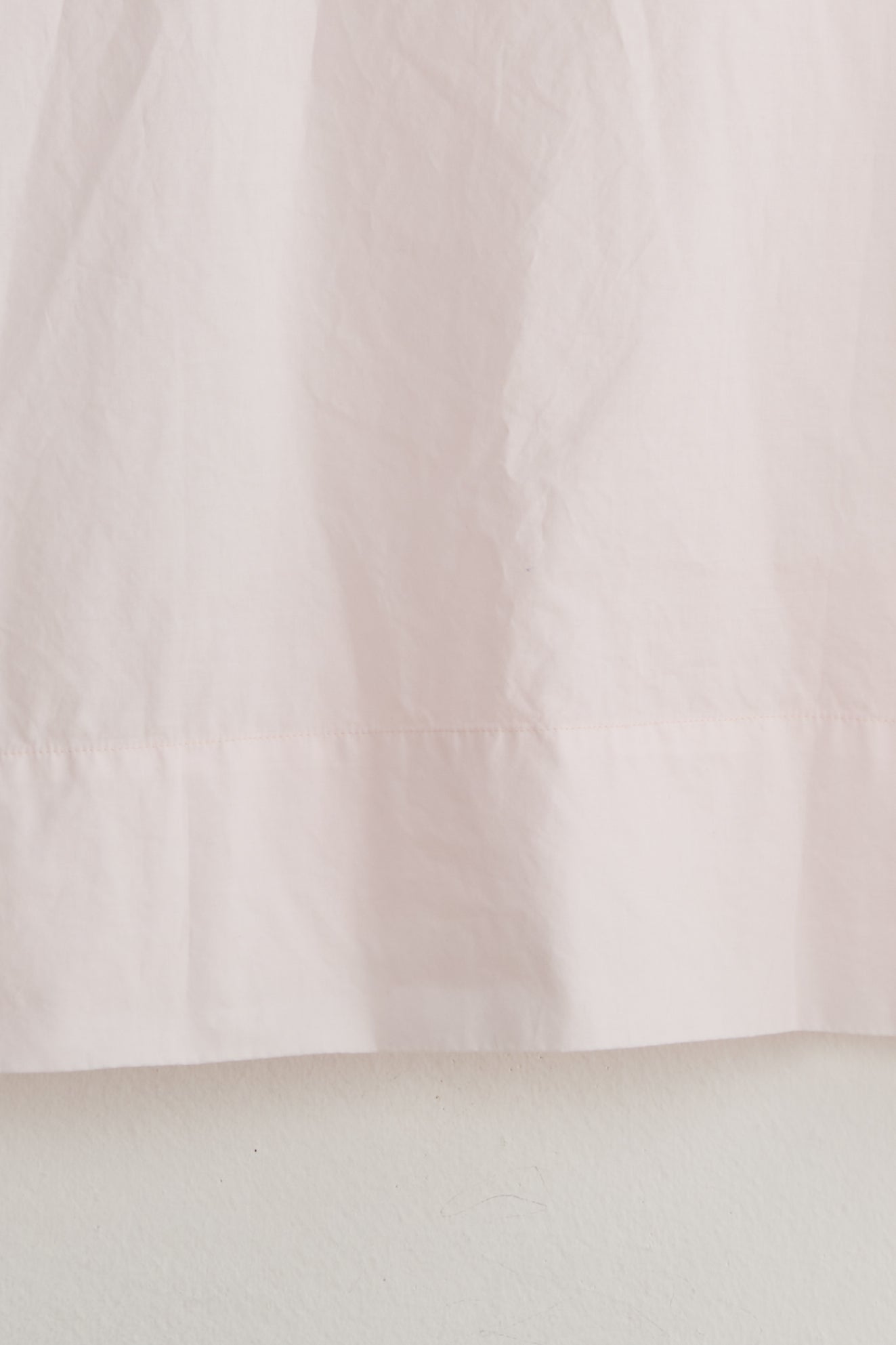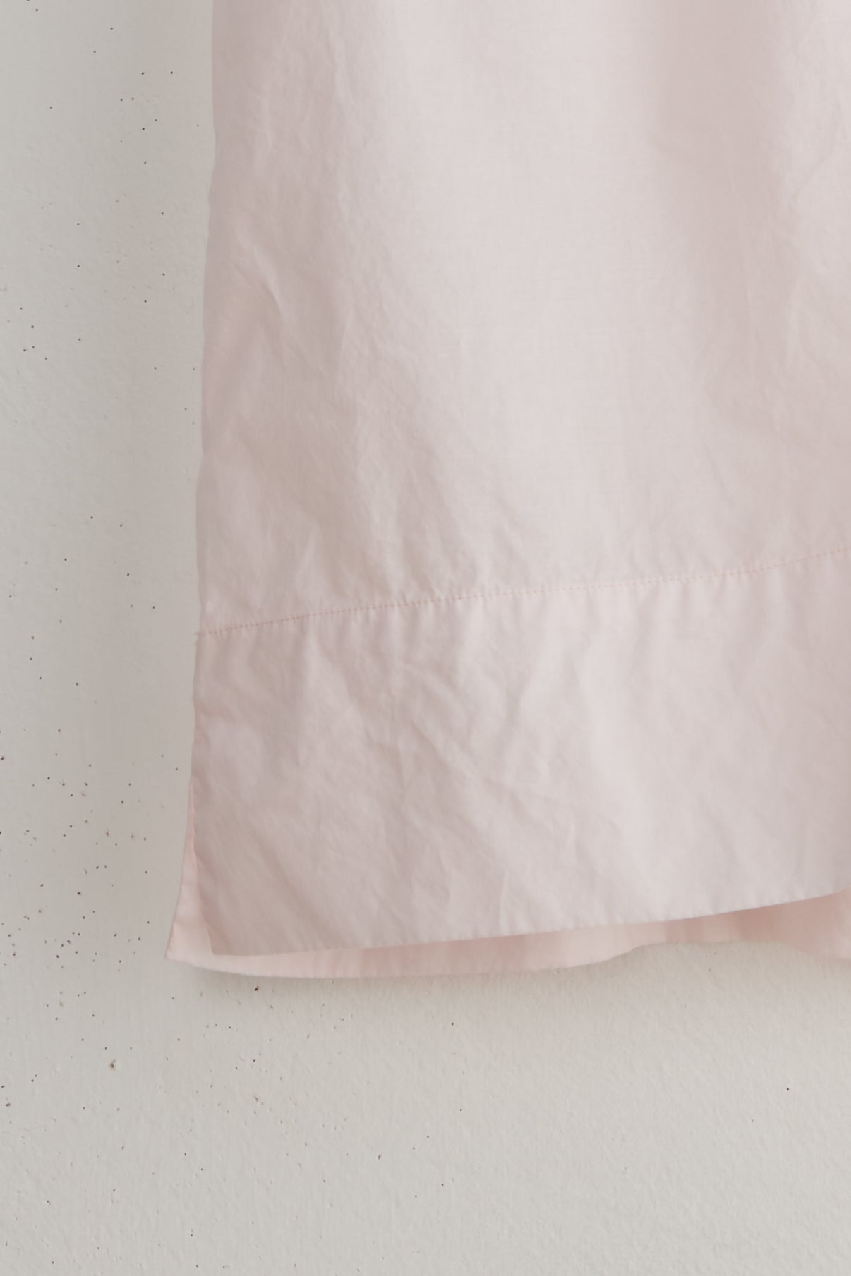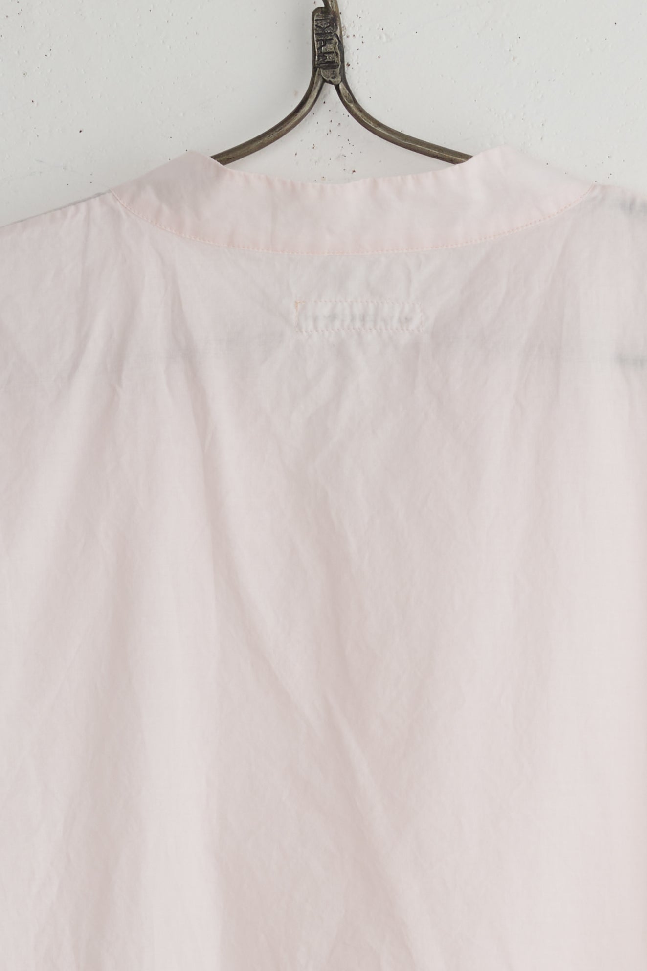 Polly slvless shirt by Maya Zukerman. The beloved polly shirt in a new sleeveless summer version. A wide, oversized blouse made from a crisp, light-weight paper cotton. with a dropped shoulder line and raw hems fitting shorter on the front. Details include side slits and a low flat mandarin collar with a hand dyed Dorset button and gathered edges.