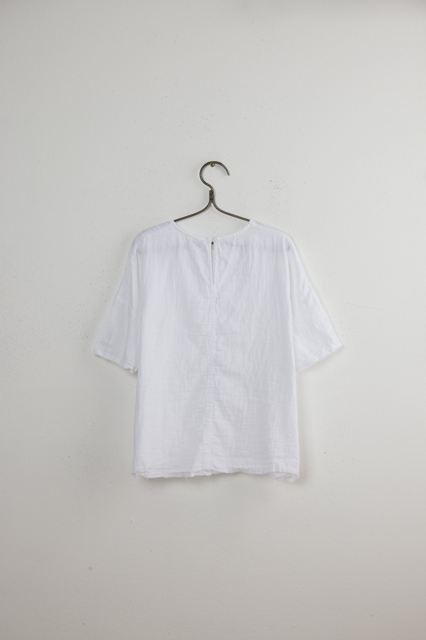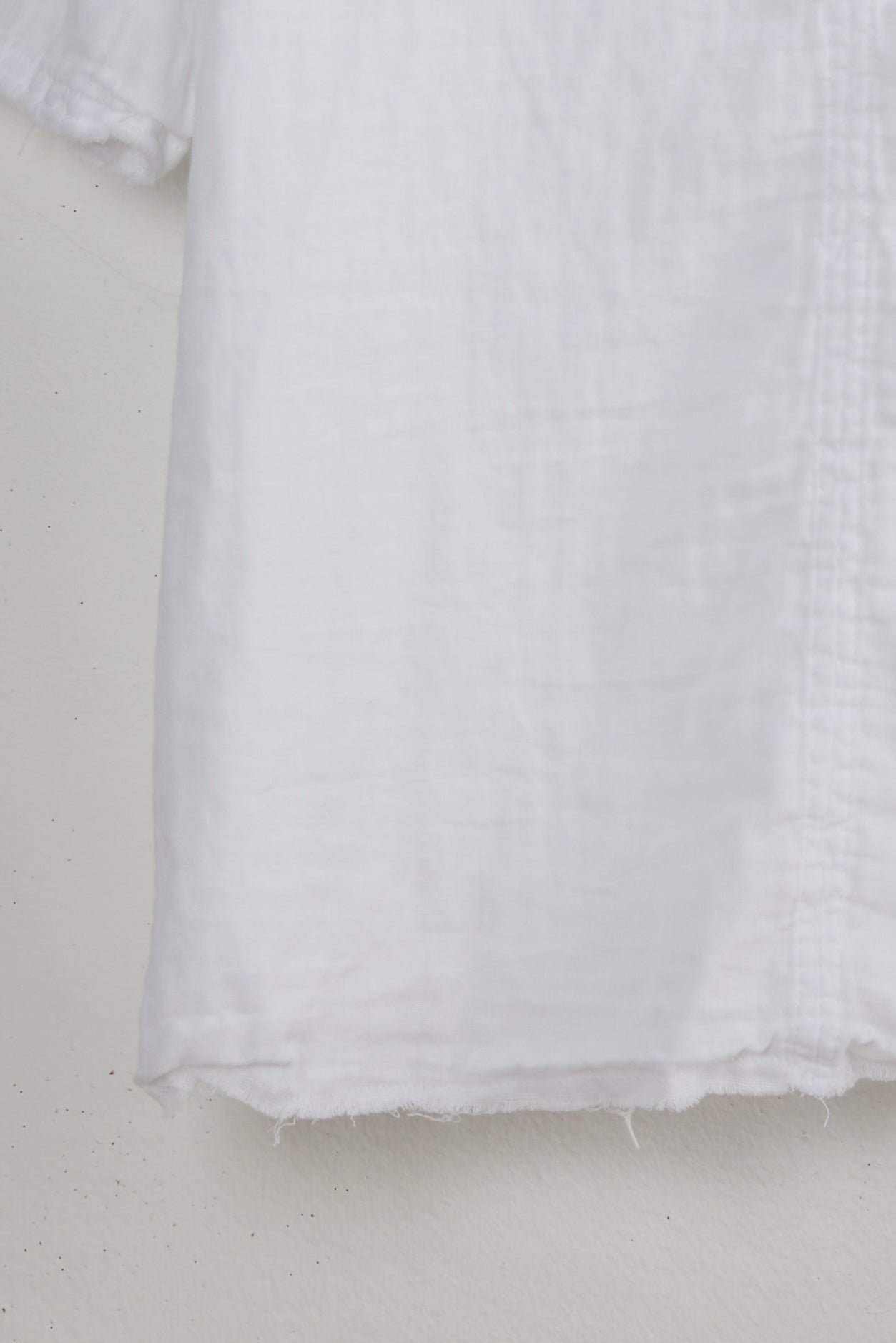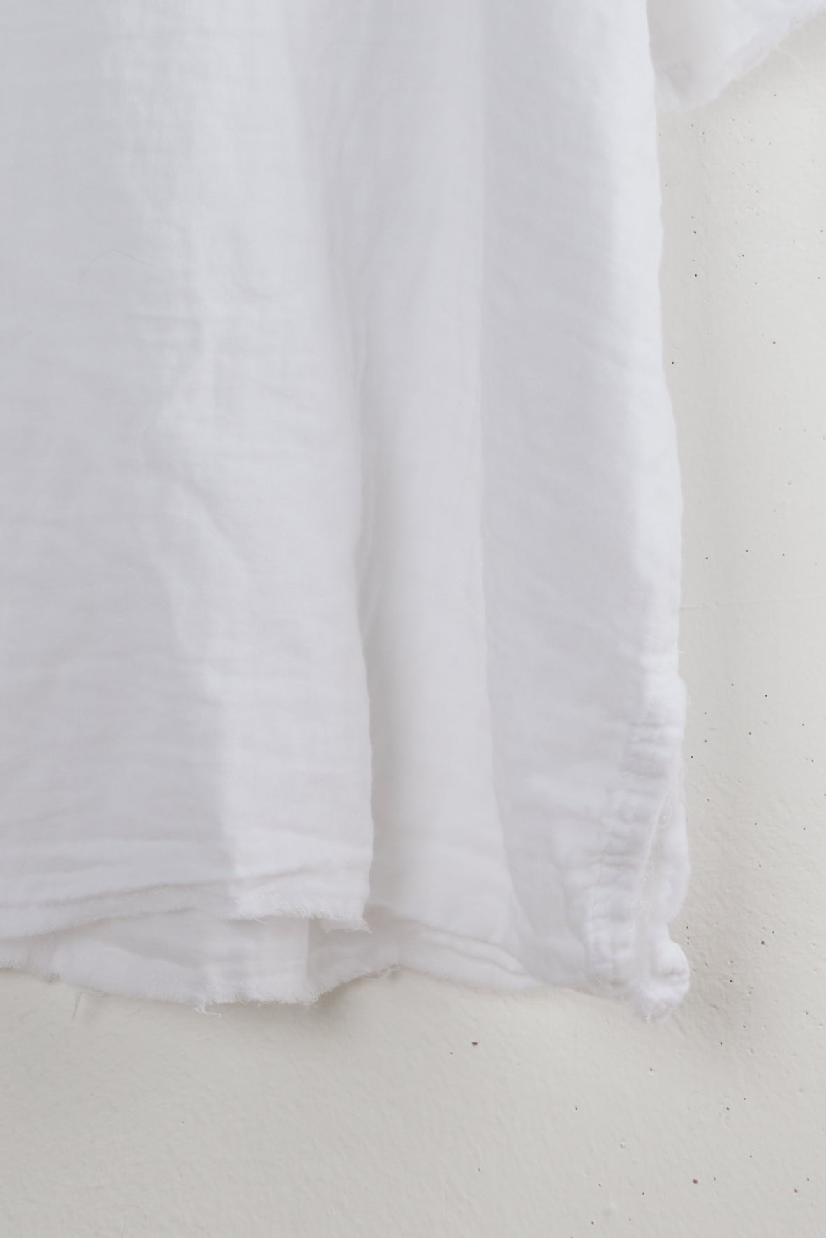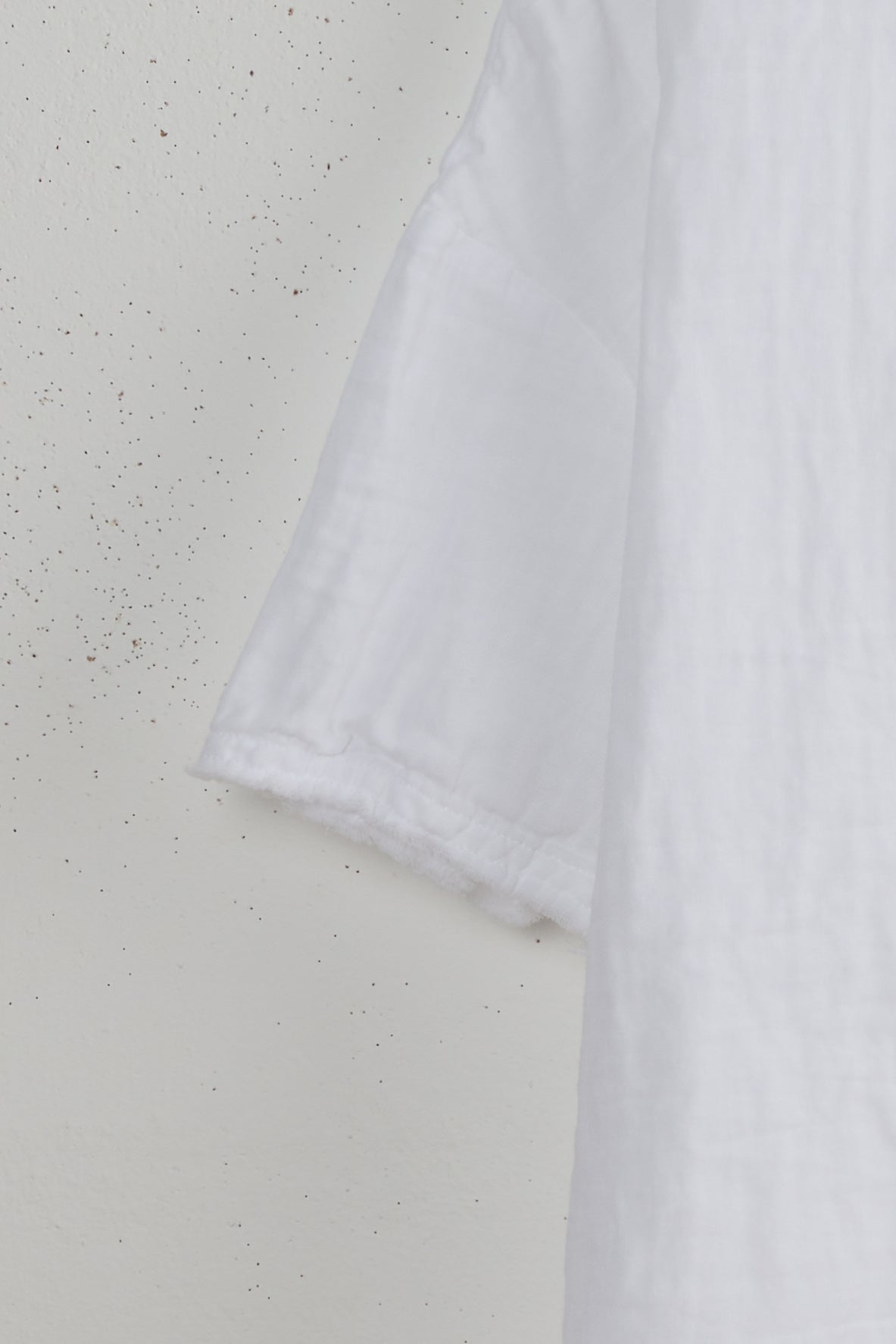Pollyanna DG shirt by Maya Zukerman. The light-weight, flowy silhouette is one of the brand’s signature cuts, now in a new fabri - super soft and airy Japanese double gauze cotton. this shirt has a straight oversized fit with dropped shoulder, crew neck and wrist long sleeves. A raw hem with side slits and a back slit with a hand dyed Dorset button closure.