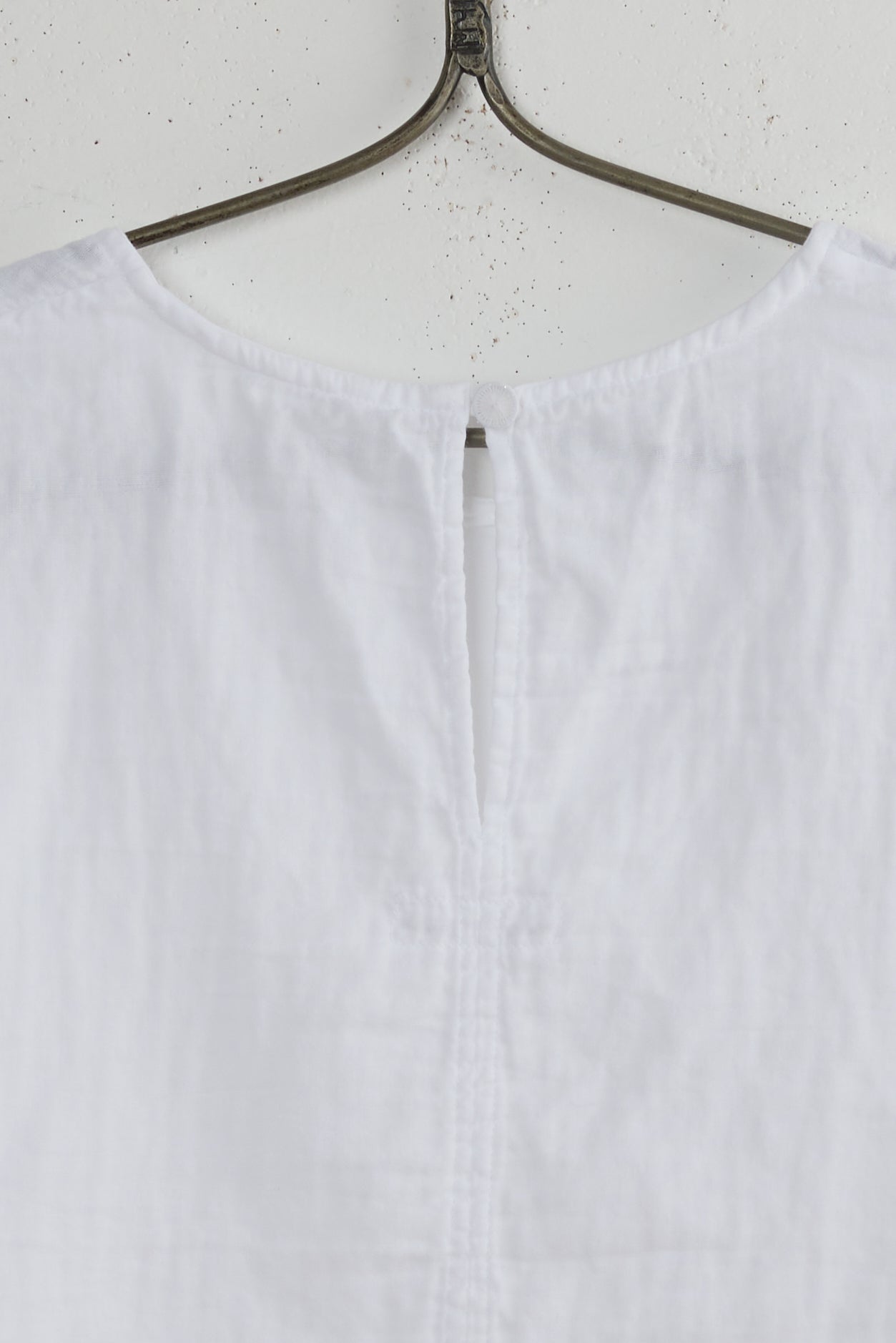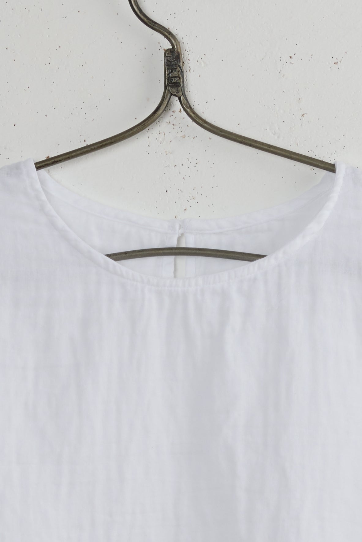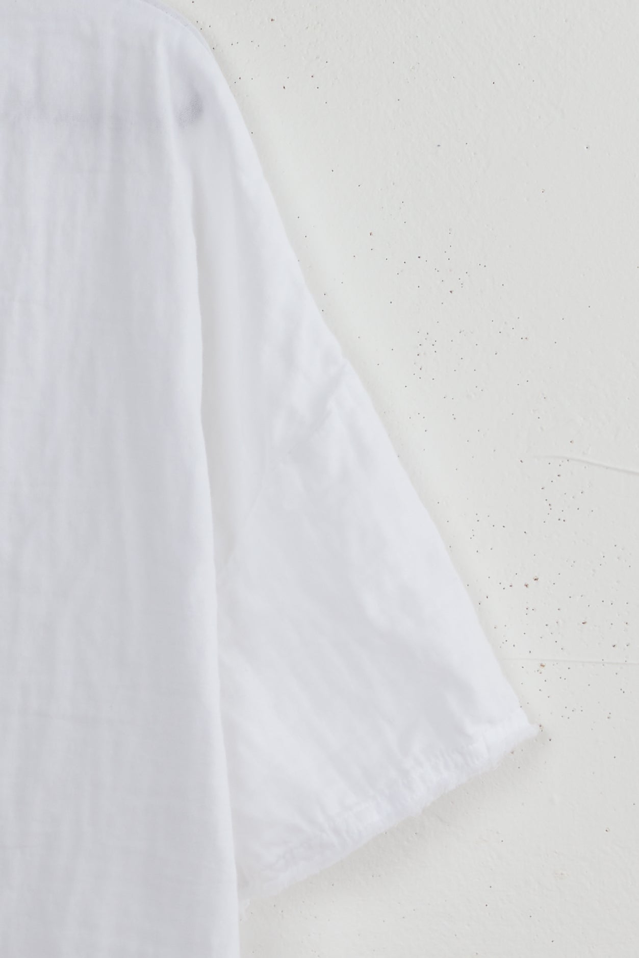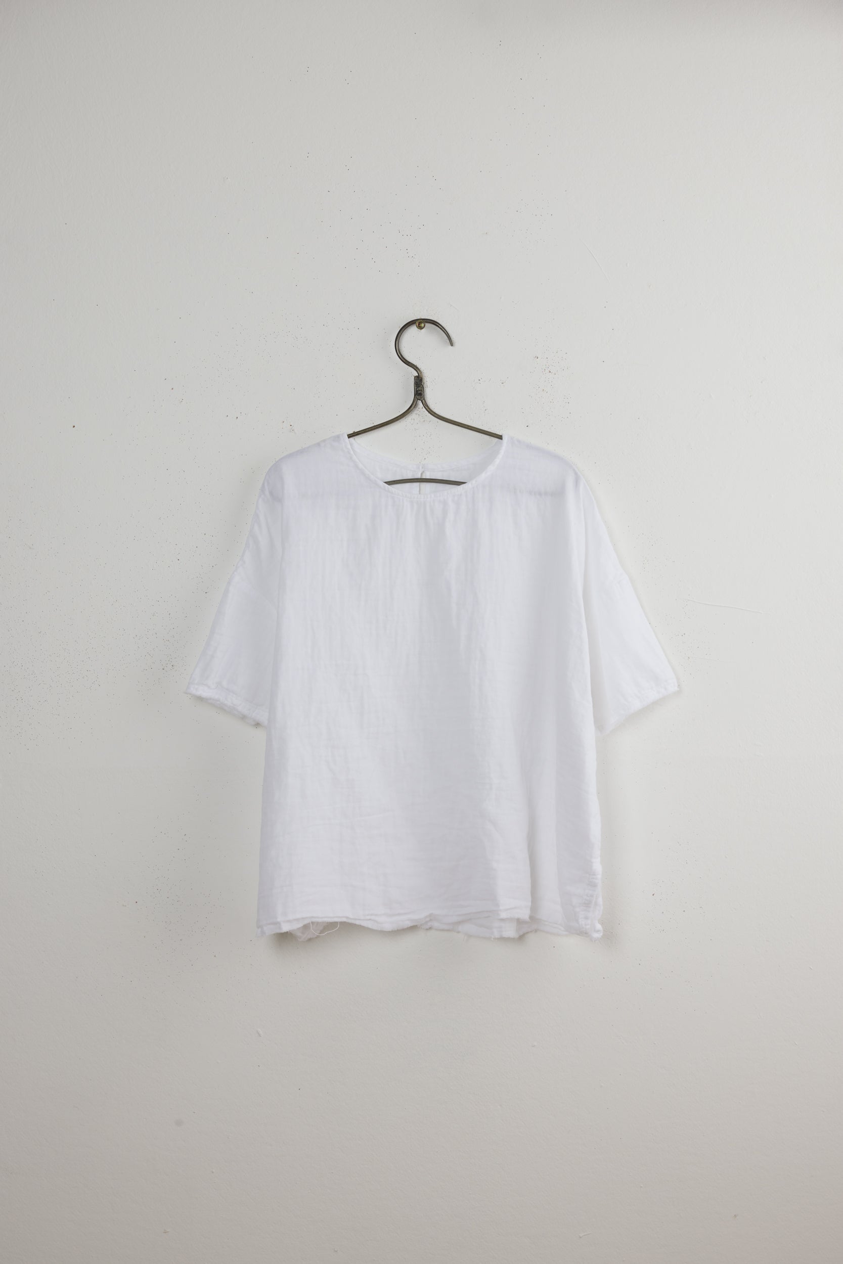Pollyanna DG shirt by Maya Zukerman. The light-weight, flowy silhouette is one of the brand’s signature cuts, now in a new fabri - super soft and airy Japanese double gauze cotton. this shirt has a straight oversized fit with dropped shoulder, crew neck and wrist long sleeves. A raw hem with side slits and a back slit with a hand dyed Dorset button closure.