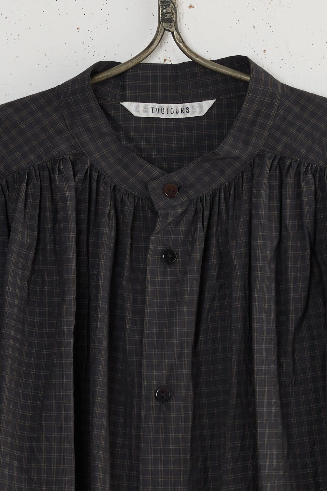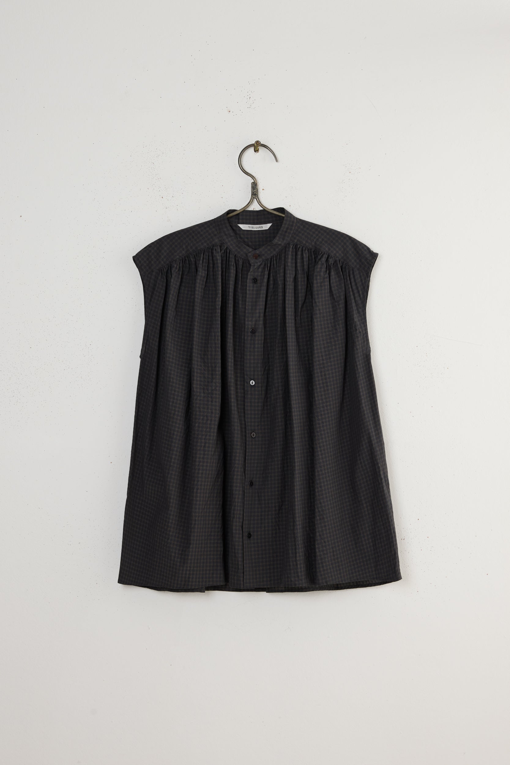 Pleated sleeveless long shirt by TOUJOURS. A plaid sleeveless collared blouse made of thin, gentle cotton silk cloth. Long and relaxed fit with a band collar, button closure and pleats along the front and back yoke. we love wearing it with the matching plaid random pleated maxi skirt.