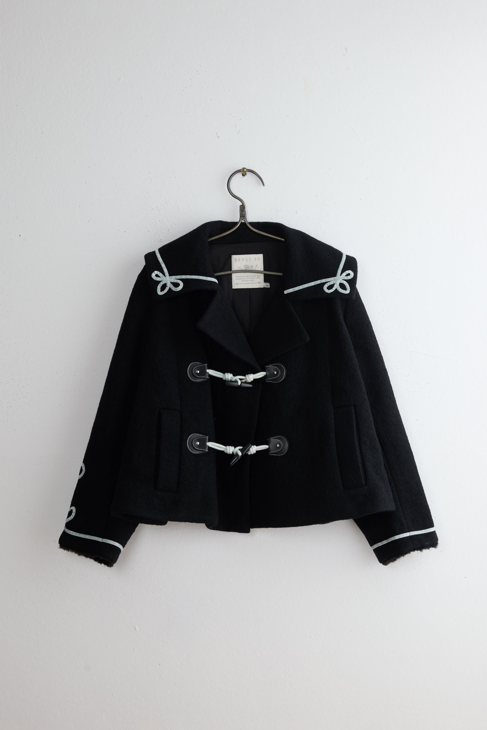 Embroidery coat by Renli su. A flared-out cropped coat Made from condensed wool. Boxy fit with an exaggerated collar and two toggle fastenings, decorative contrasting trims around the collar and cuffs and raw sleeve hems.