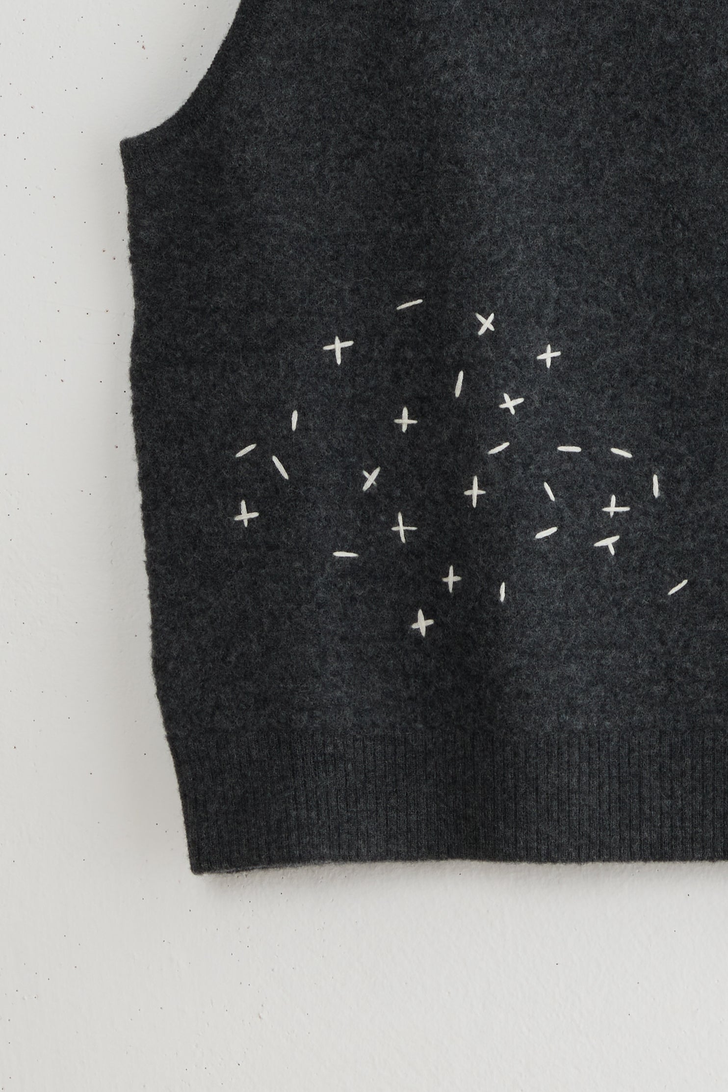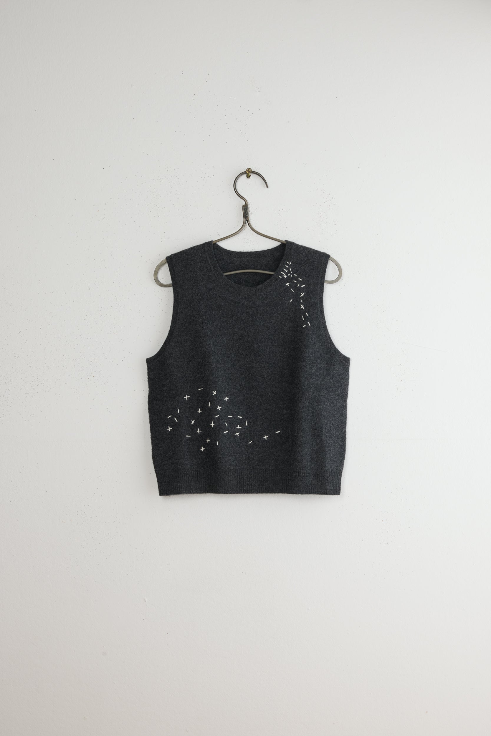 Stitch knit vest by Renli Su. A sleeveless knitted vest crafted from compact textured yarn. A clean, fitted silhouette with hand stitched detailing, round neck and ribbed hems.
