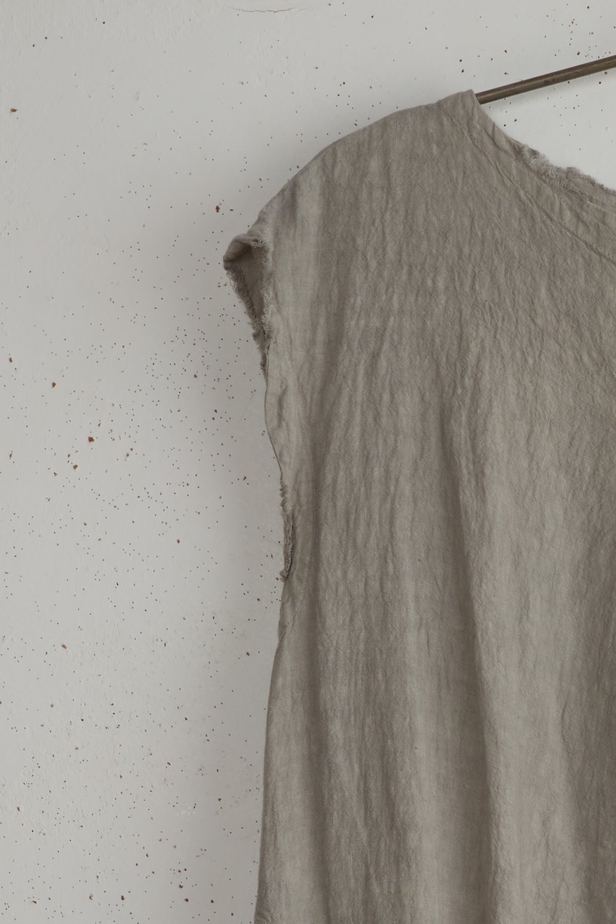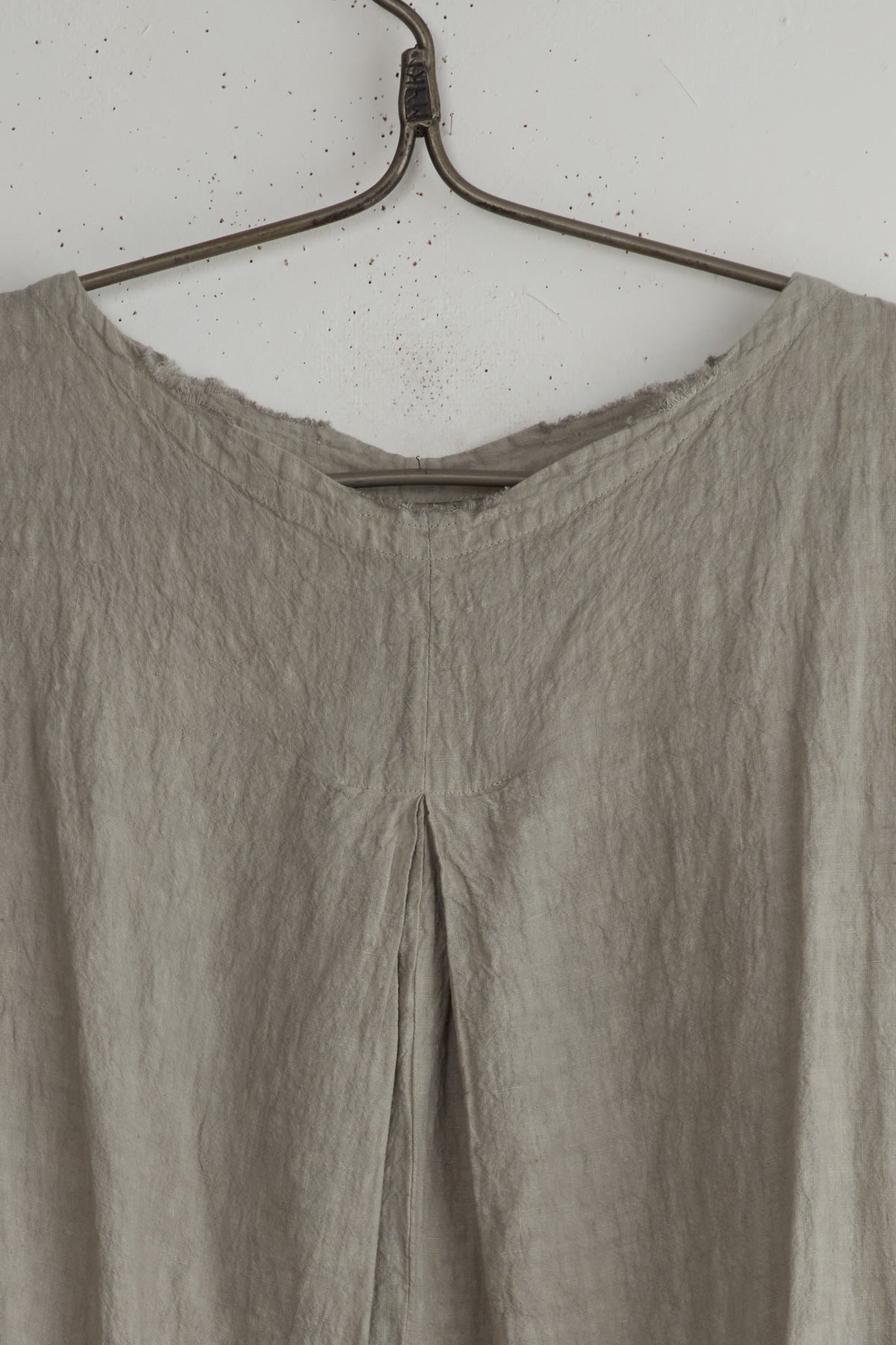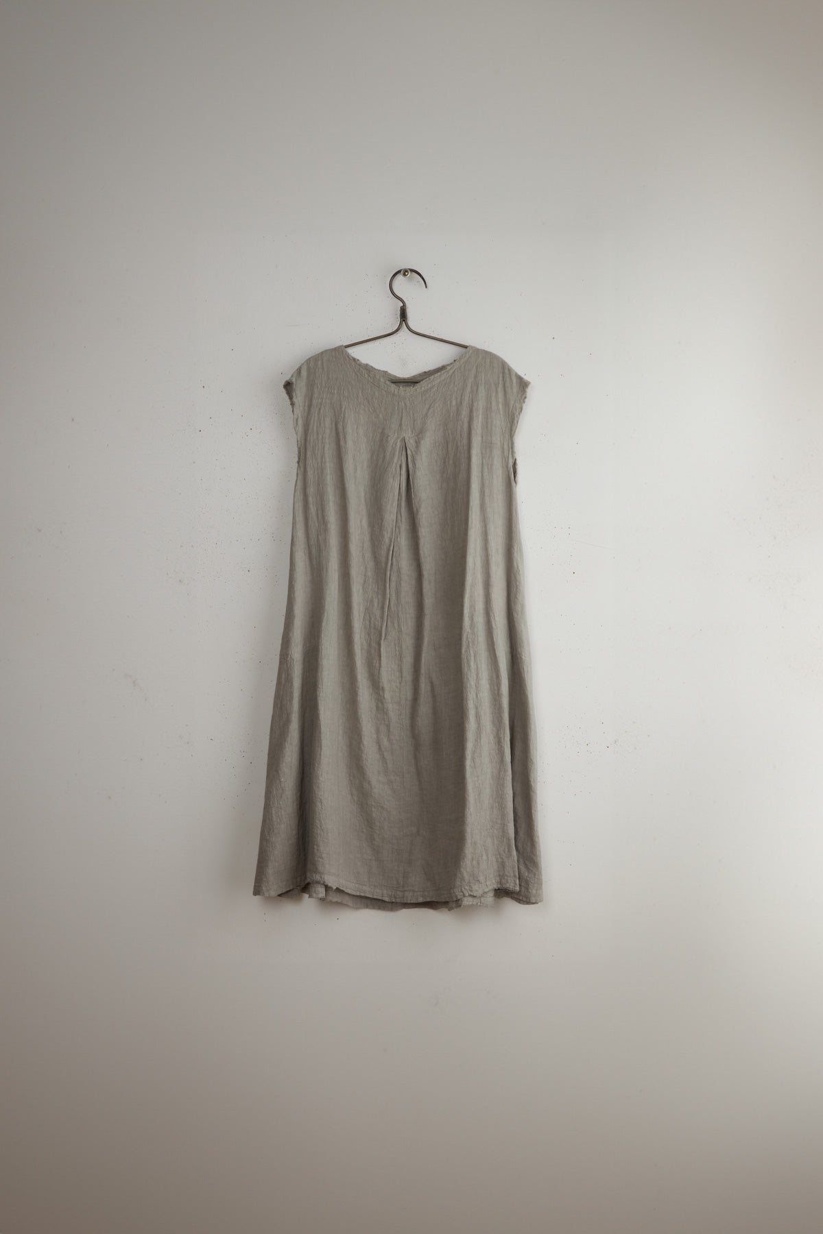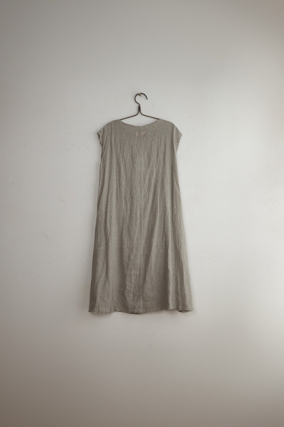 Robe Debardeur Noon by Manuelle Guibal. A lightweight pullover dress made of 100% soft linen. Calf length with French sleeves, boat neck and side slits. Side pockets, raw edges and a triangle front pleat.