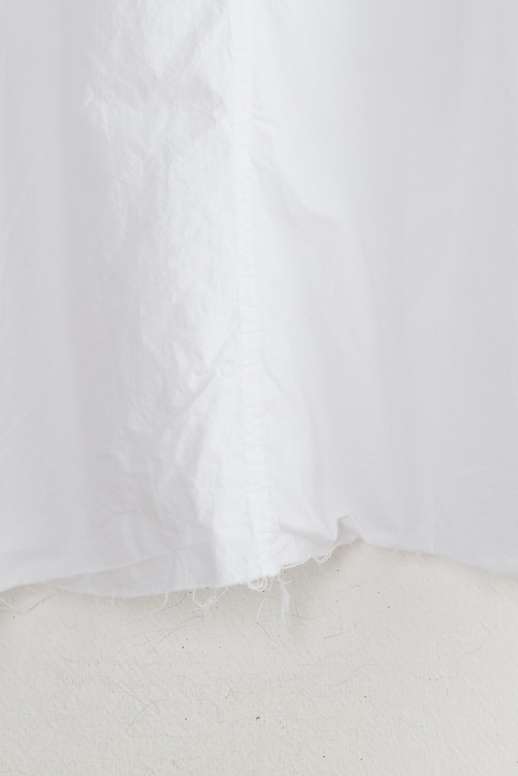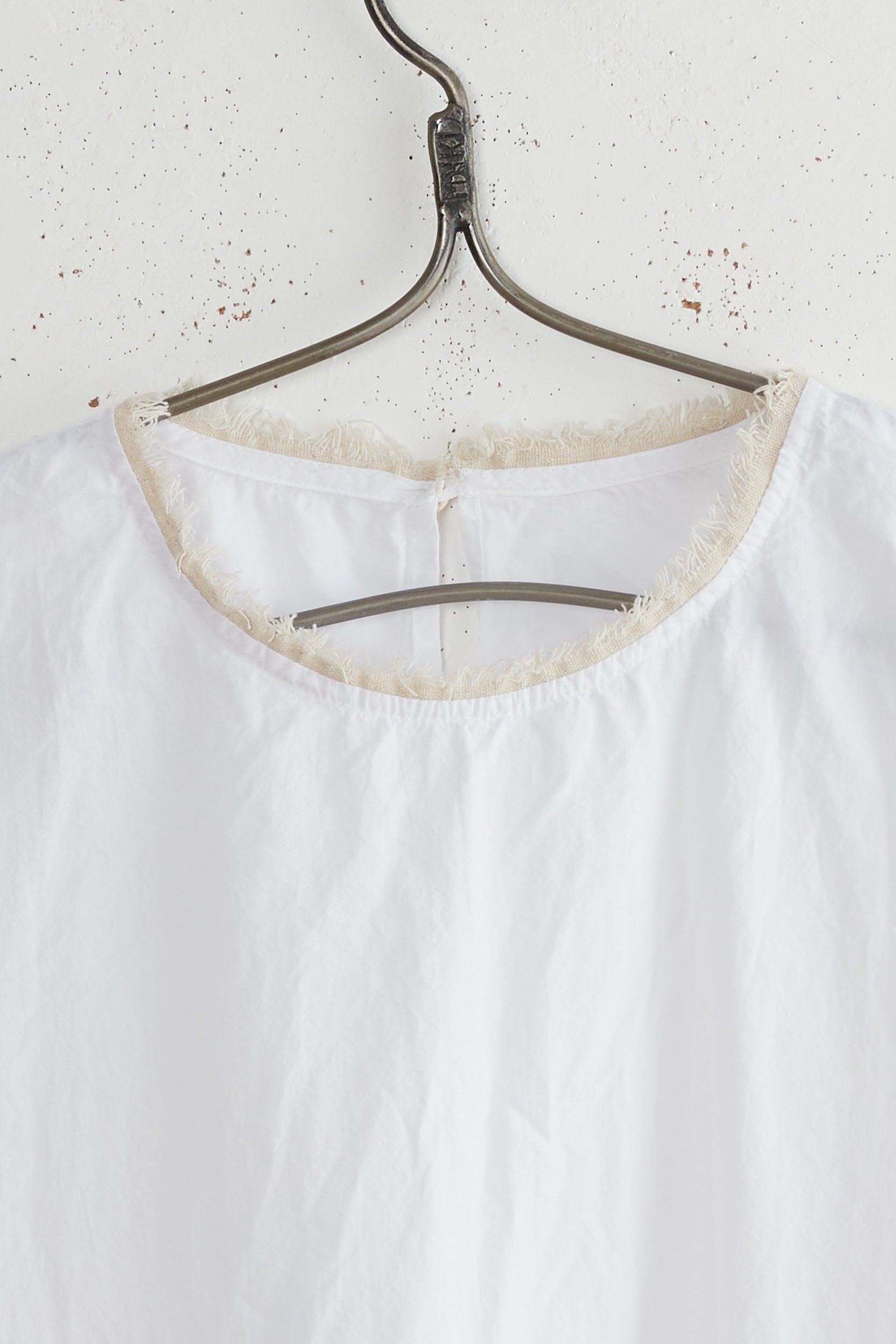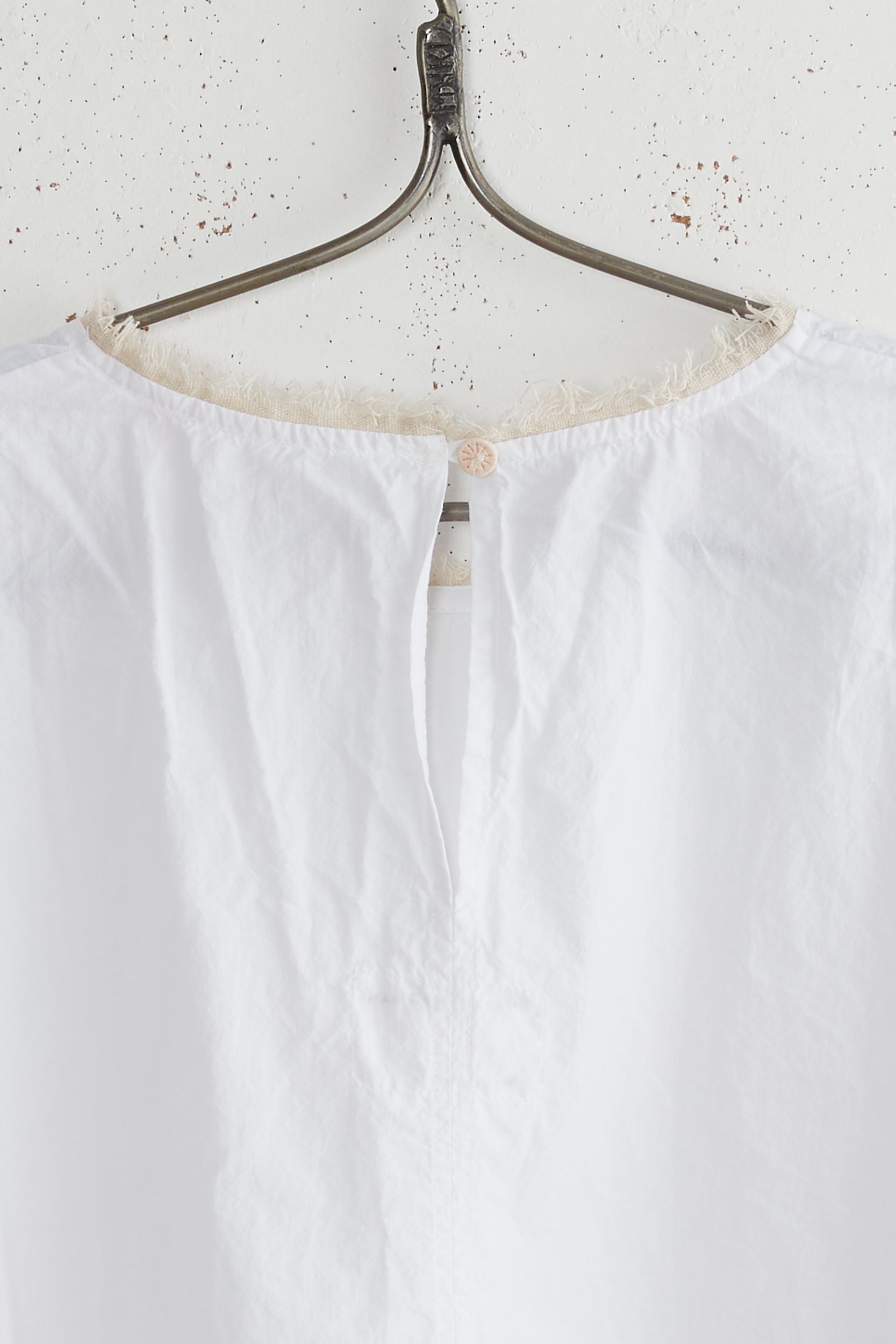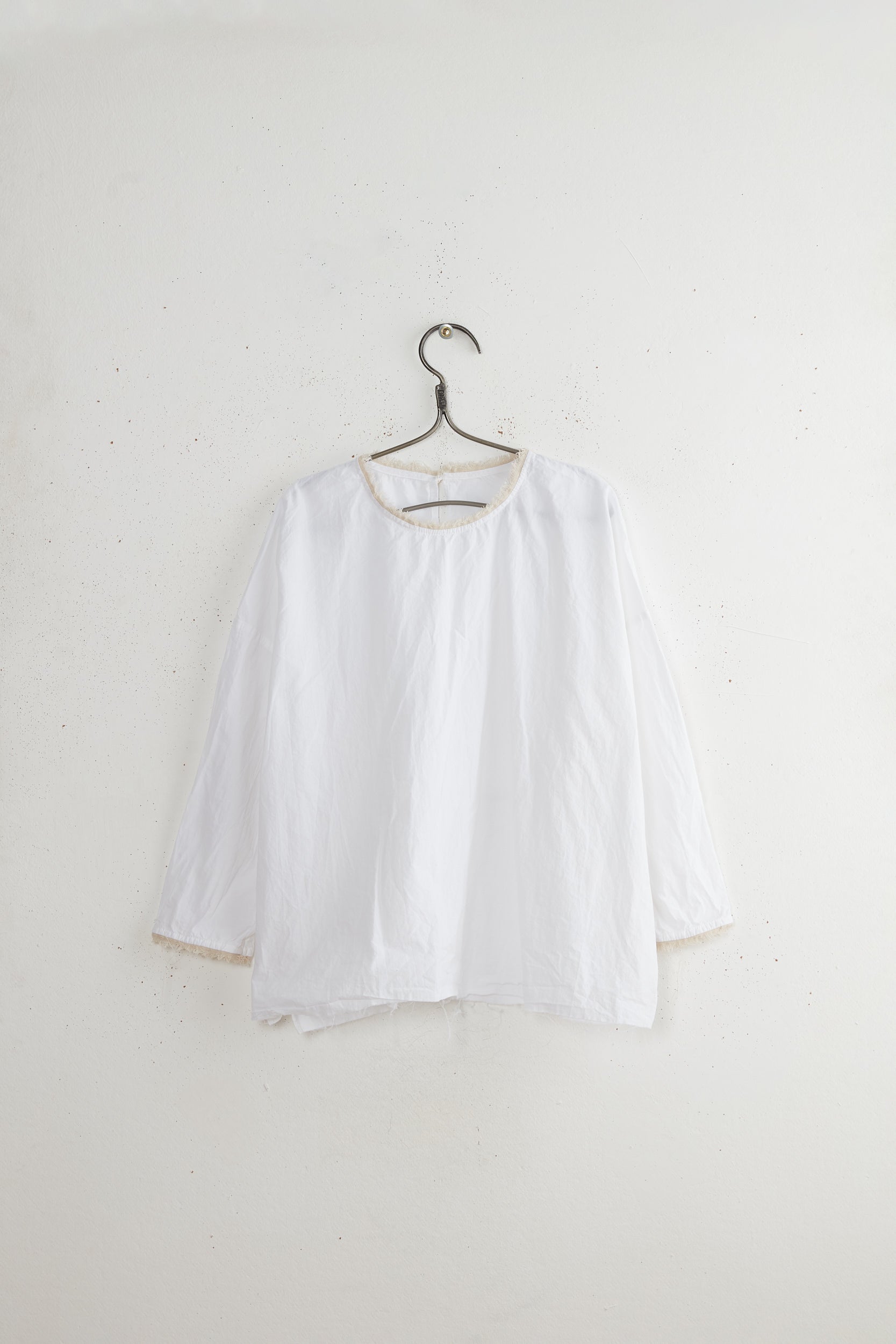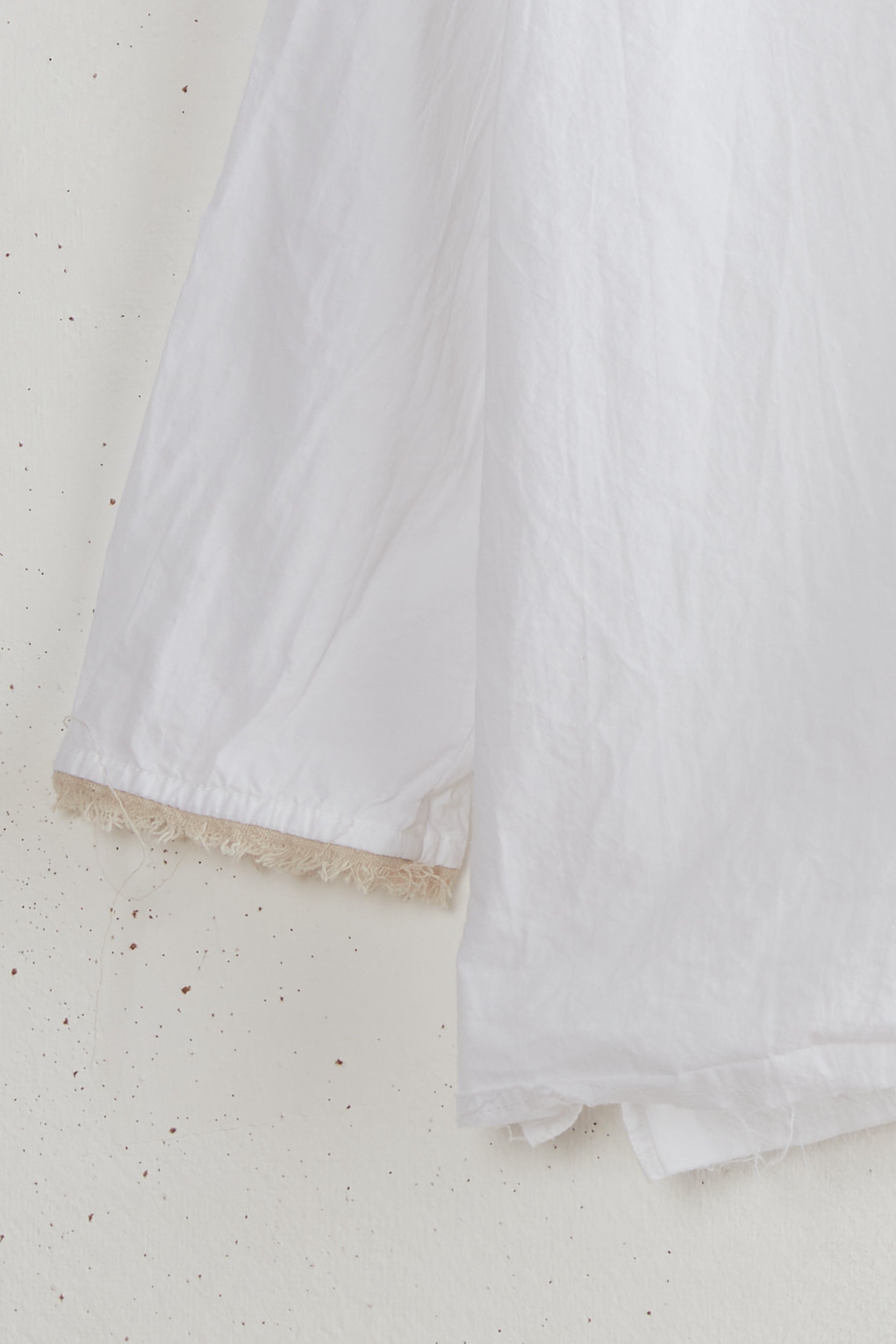 Roni long shirt by Maya Zukerman. A light-weight, classic silhouette made for year-round wear. made of 100% Japanese paper cotton, a straight oversized fit with dropped shoulder, crew neck and wrist long sleeves. Fringed linen ribbon detail on neckline and sleeves. A raw hem fitting shorter on the front, side slits and a back slit with a hand dyed Dorset button closure.