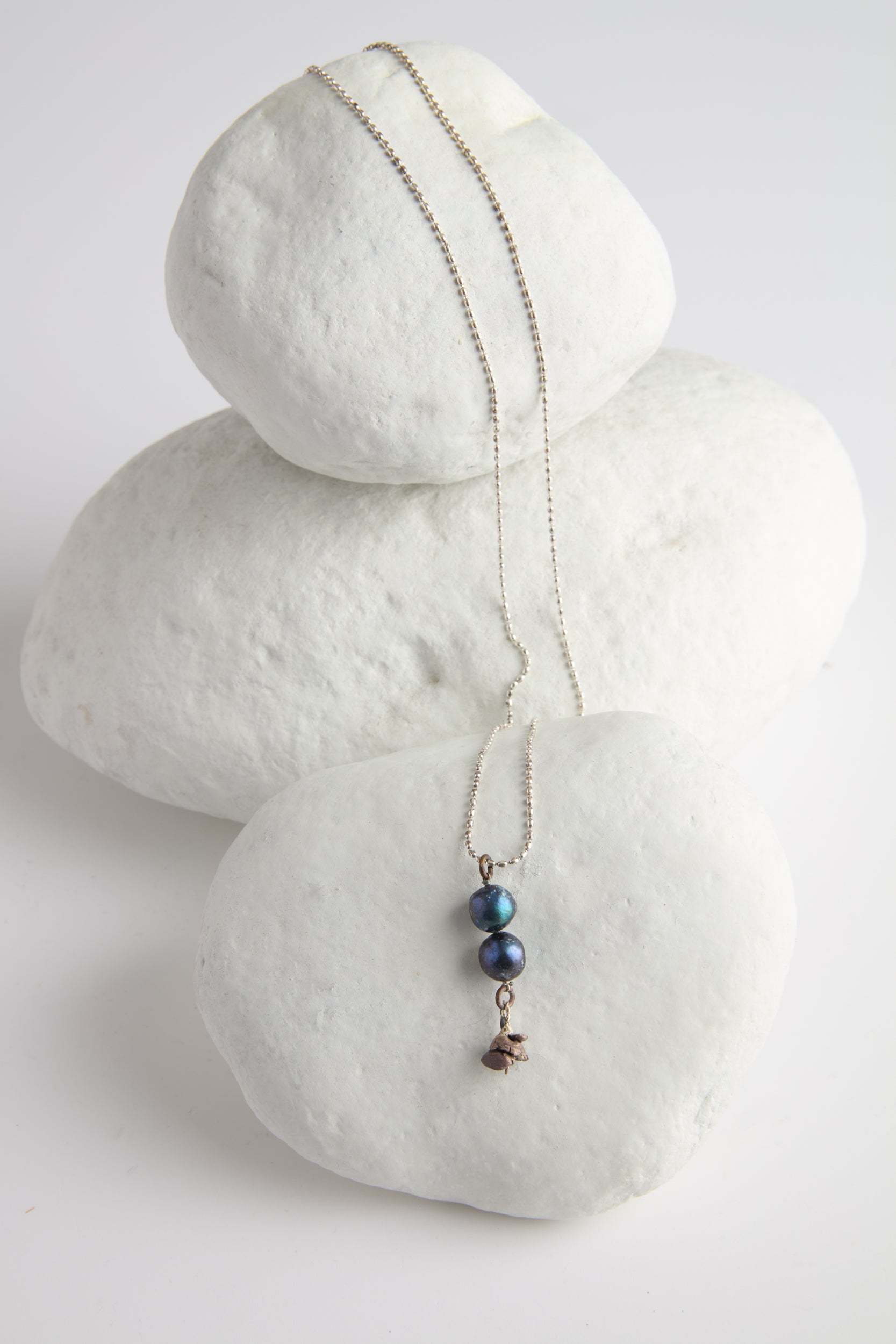 Rose pearl necklace by Atelier Inscrire. A handmade sterling silver necklace with a rare keshi pearl, born in nature without an artificial nucleus, and a sterling silver rose shaped pendant. Chain Length: approx. 68cm; Pearl Pendant: approx. 1.1cm; Rose Pendant Length: approx. 1.5cm, Width: approx. 1.1cm.