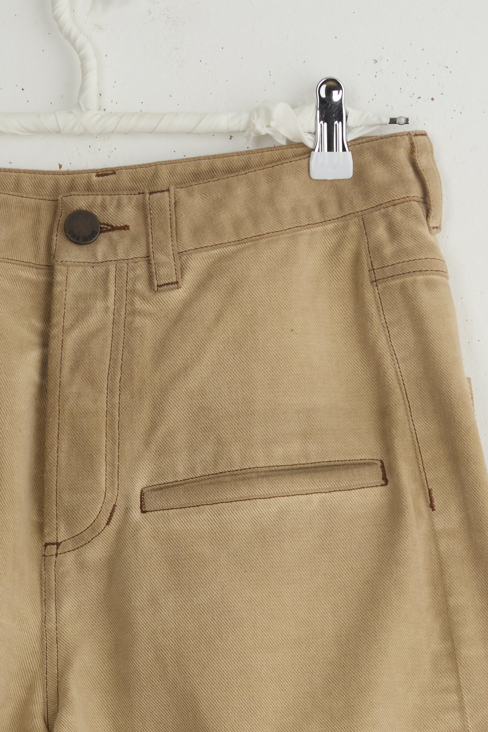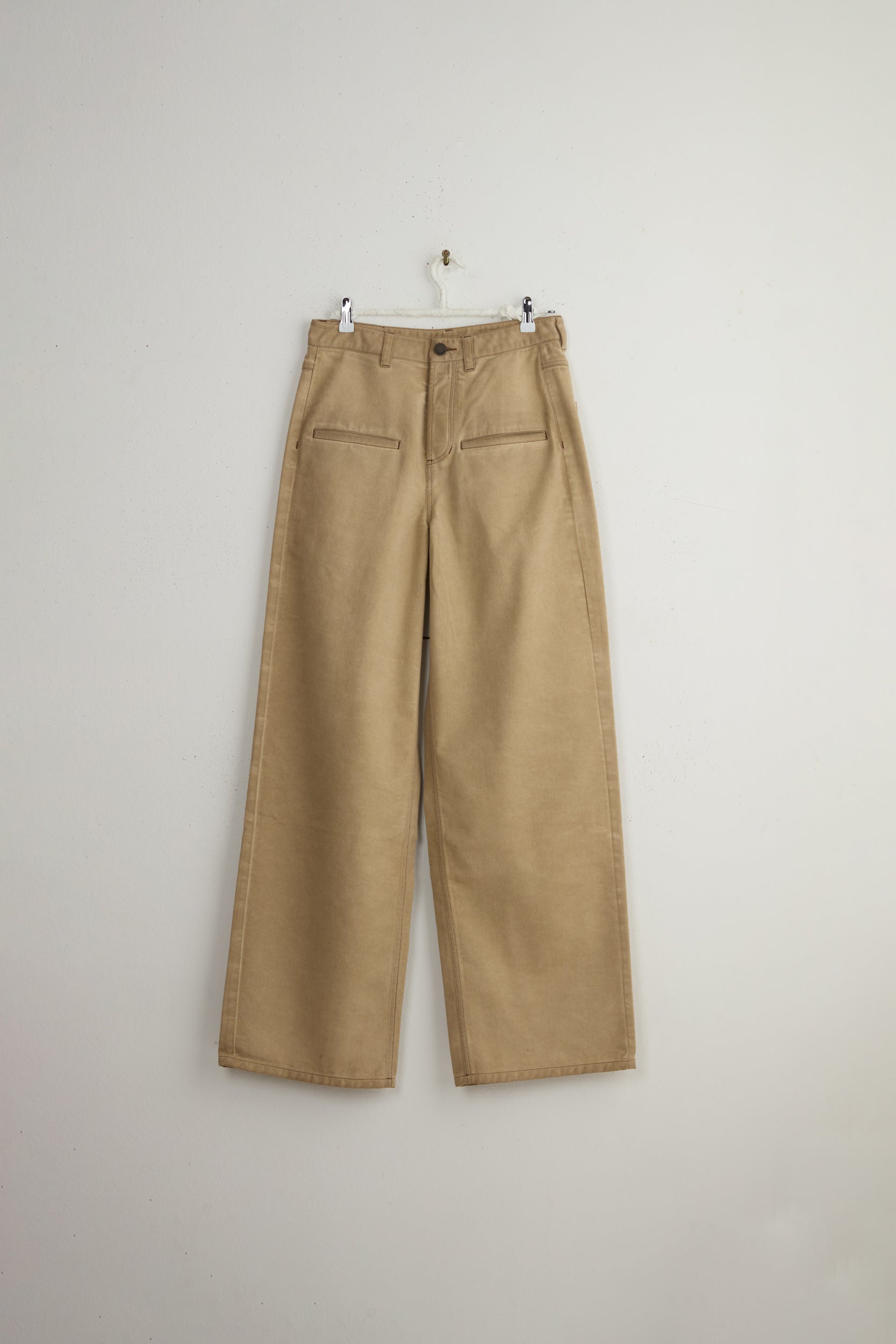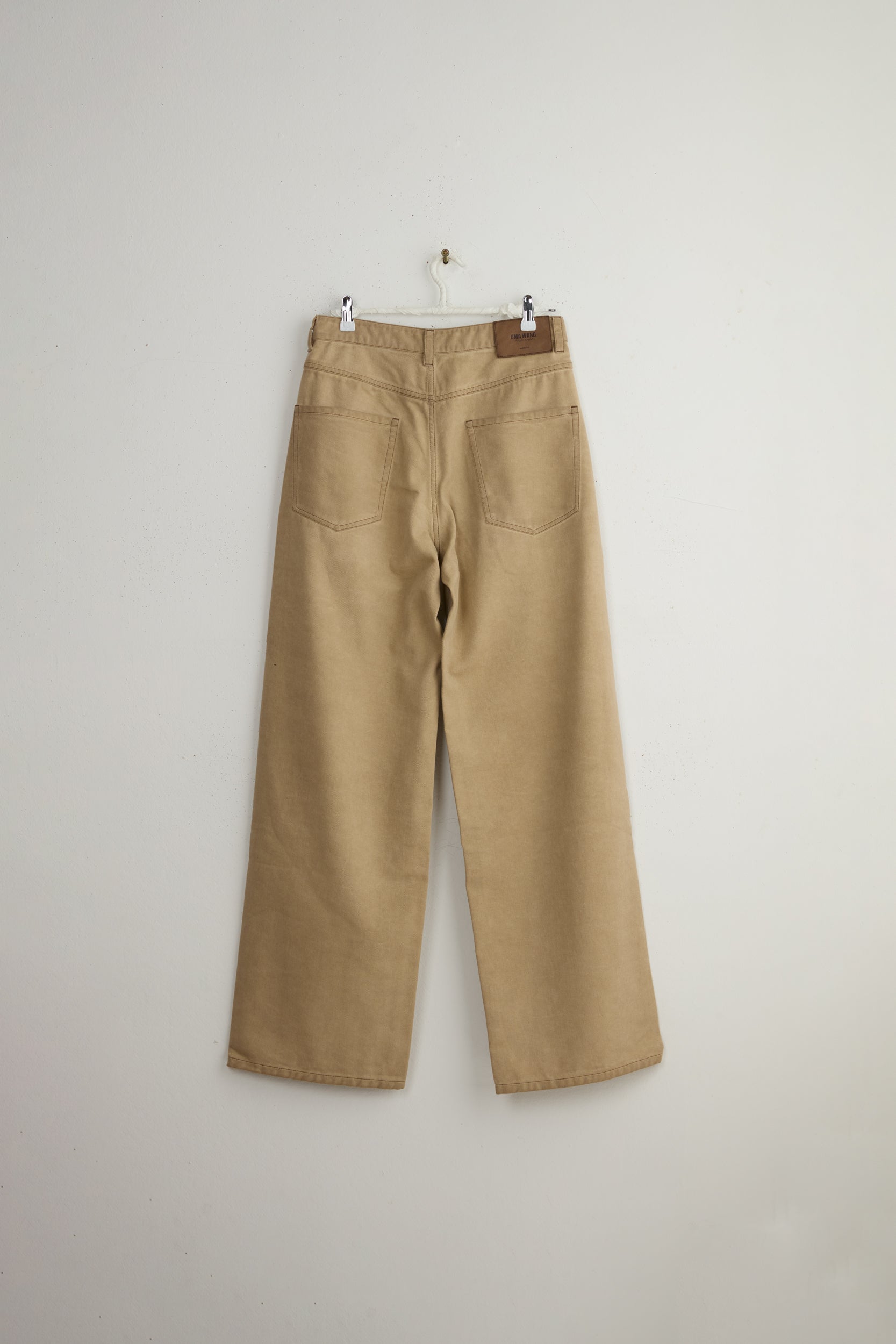 Ball pants from the house of Chinese designer Uma Wang. Super long, high waisted denim pants made from mid-weight cotton. Straight legged with two front welt pockets, two back patch pockets, buttoned fly closure and belt loops. Intentionally long so can be tailored or folded to your measurements.