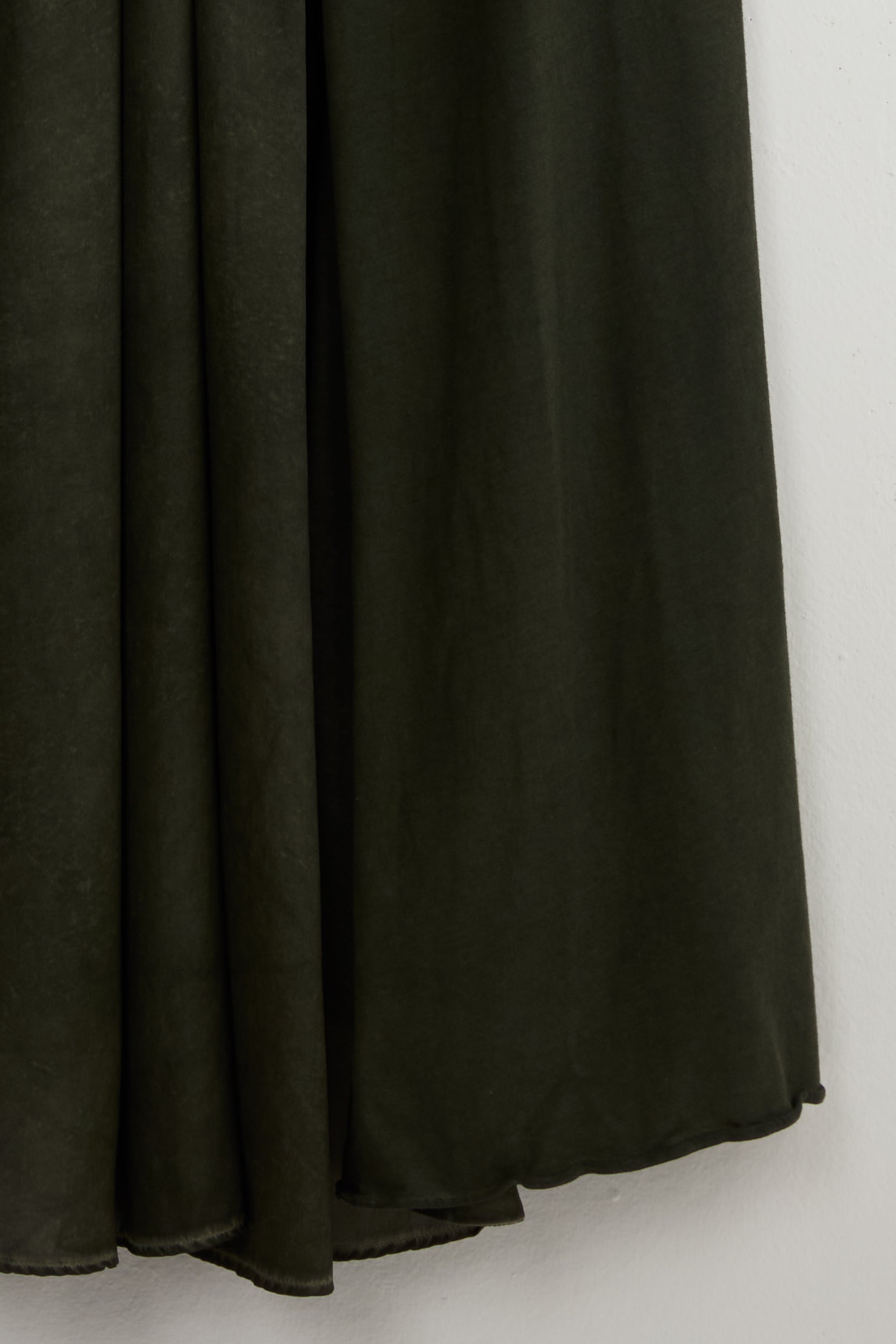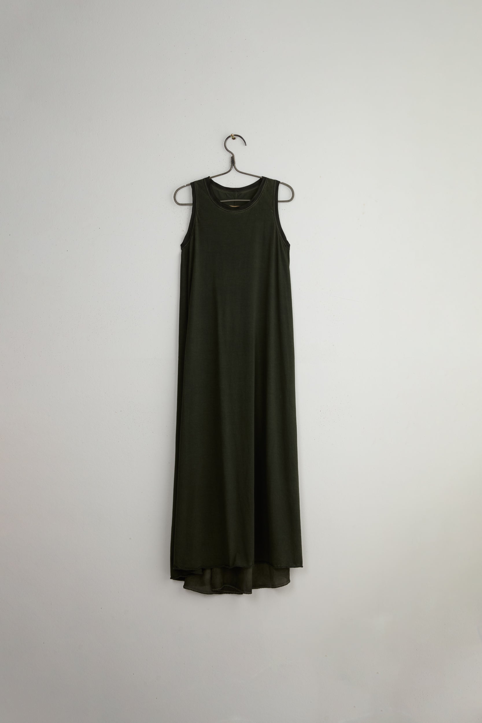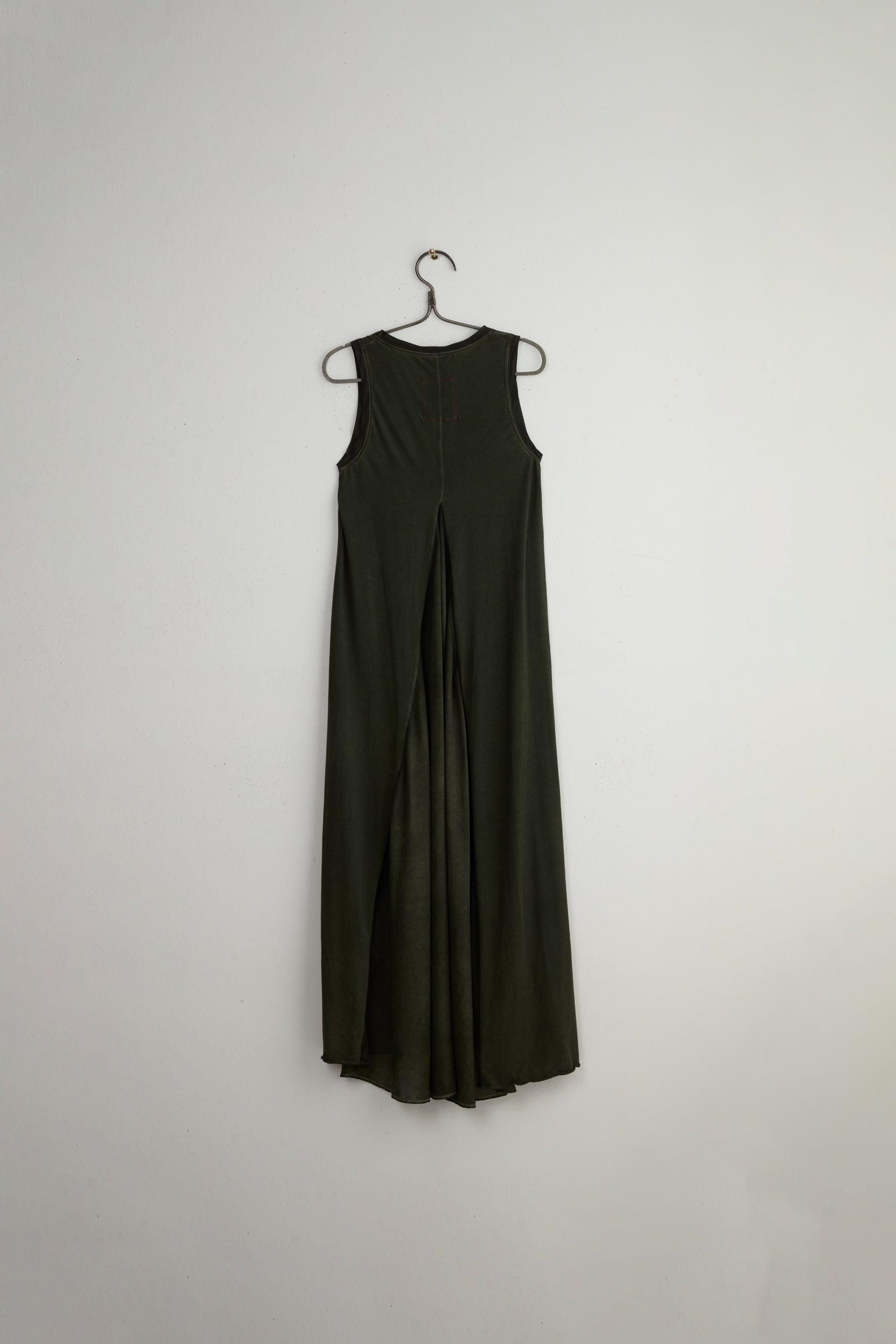 Data dress from the house of Chinese designer Uma Wang. A light full length dress made from soft cotton with a flowy silk panel along the back. Seeveles with a relaxed, slightly flared silhouette, a crew neck, raw hem and uneven coloring.
