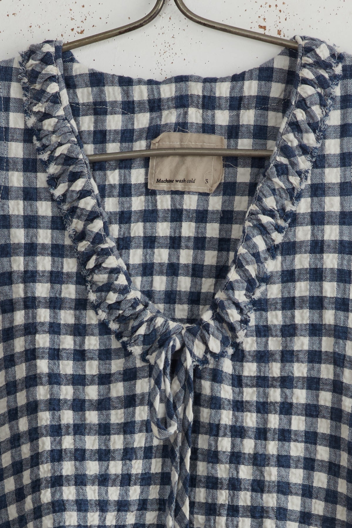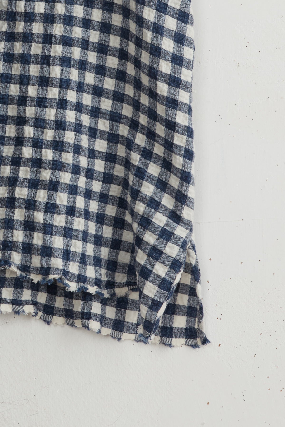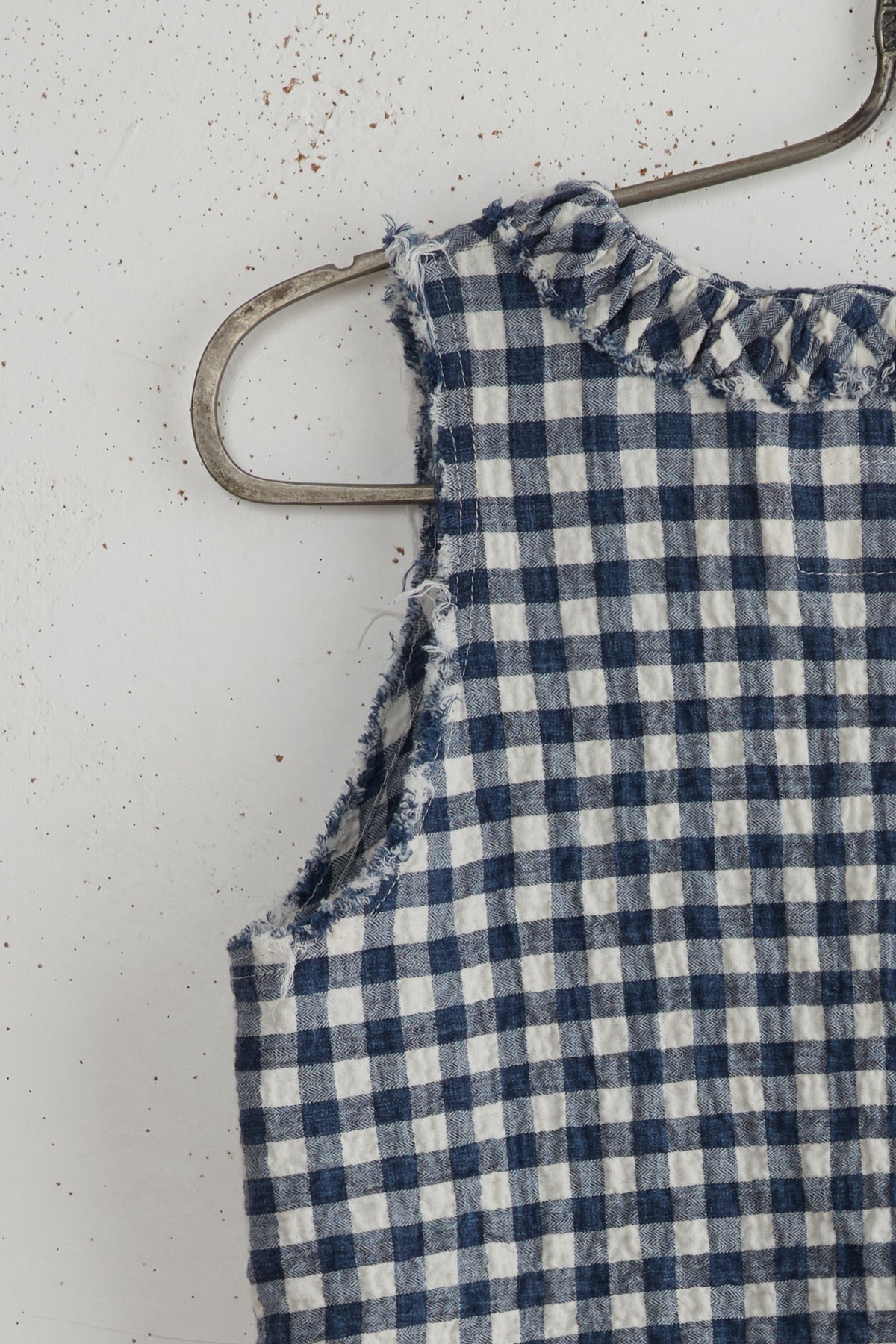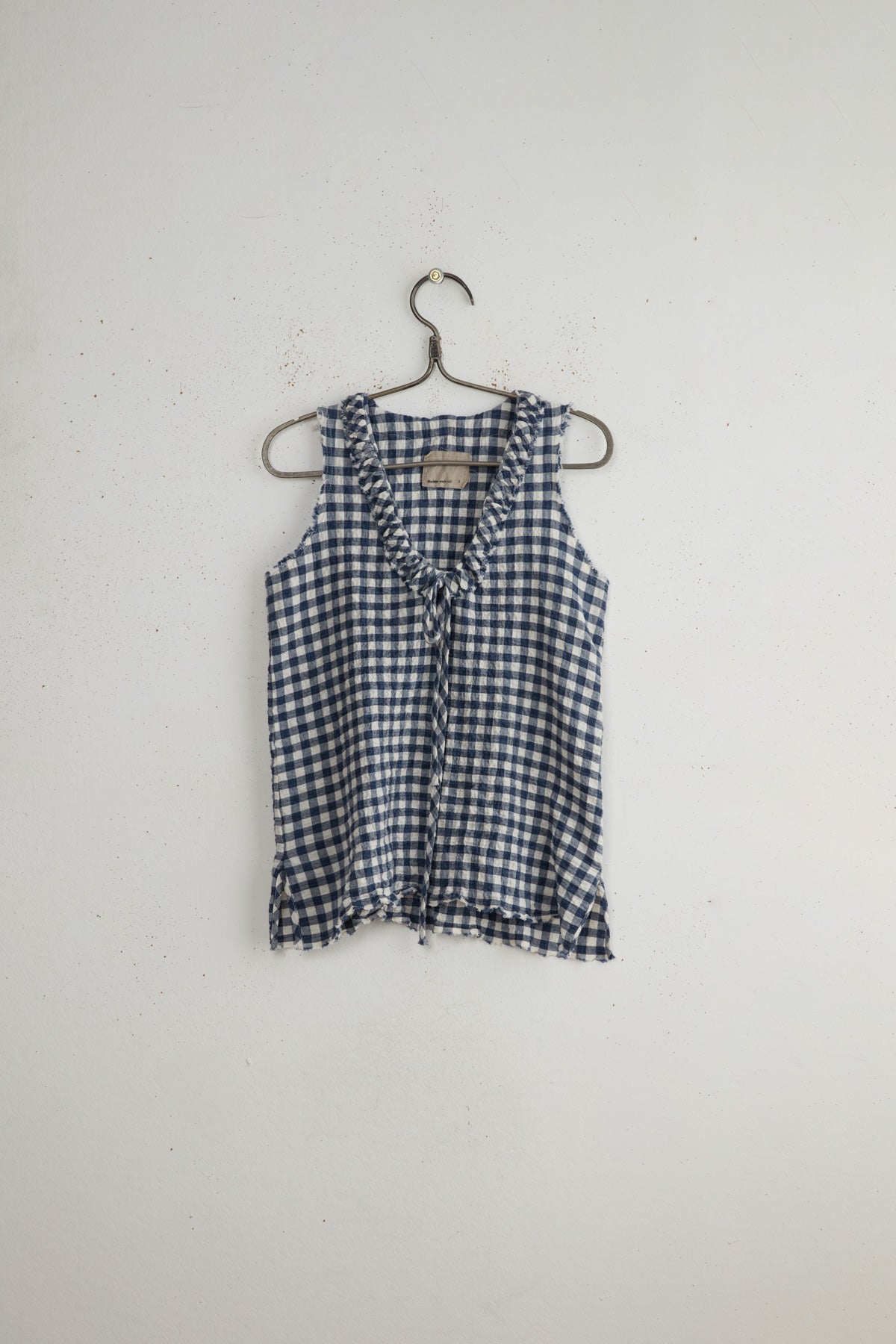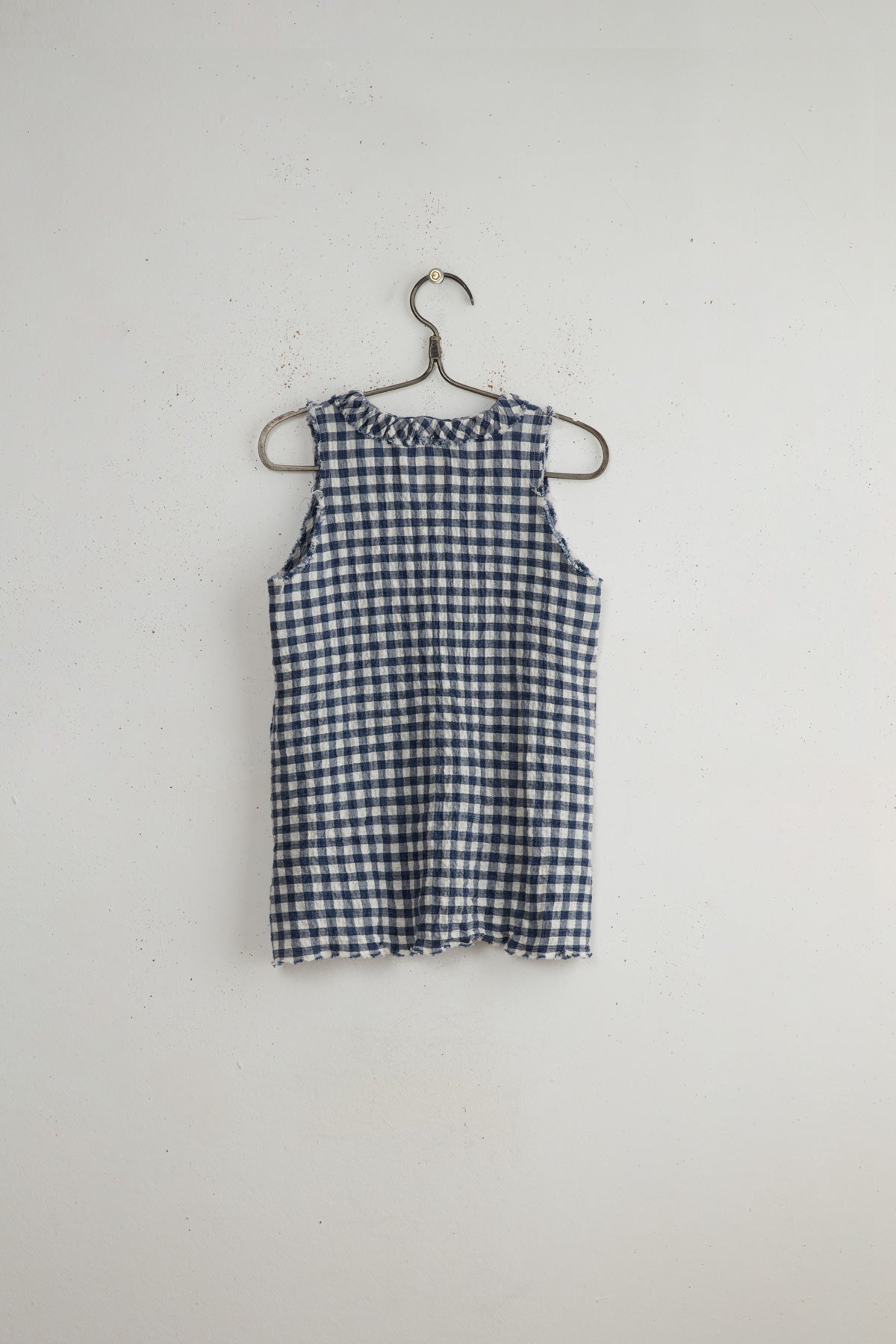 Silavi shrinky check tank top by Maya Zukerman is a super soft sleeveless shirt with a relaxed fit and a deep v-neck. Made of a stretchy crinkled cotton with a checked pattern, the neck is laced with drawstring from the same material, making it both adjustable and chic. Details include raw hems and arm holes and small side slits.