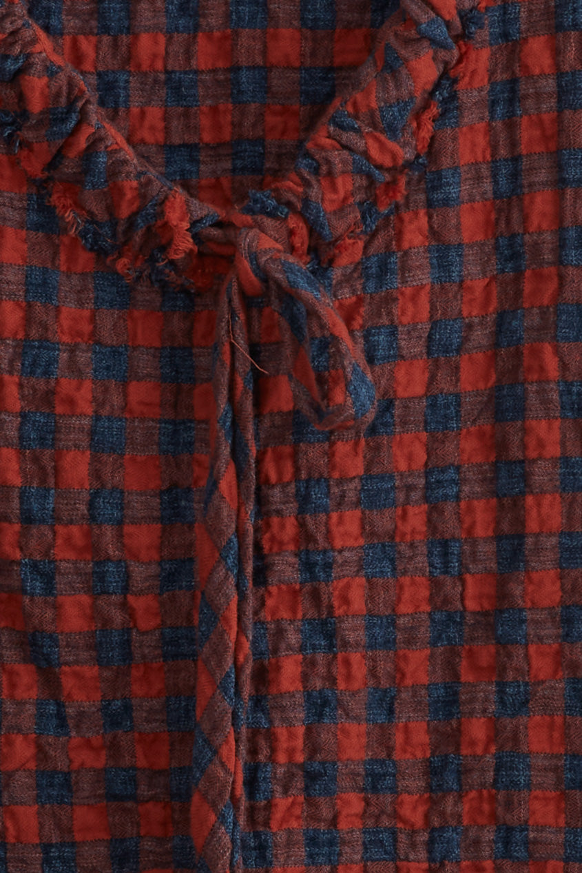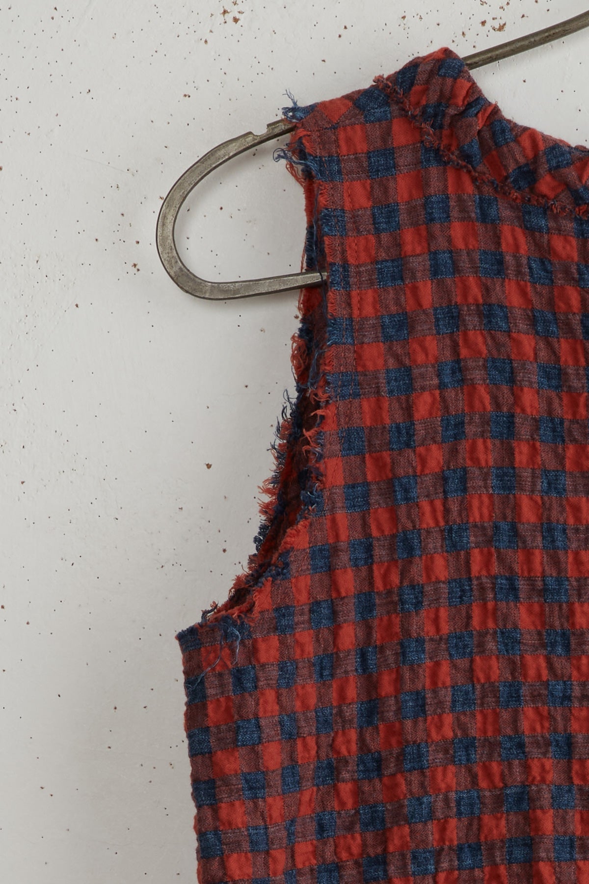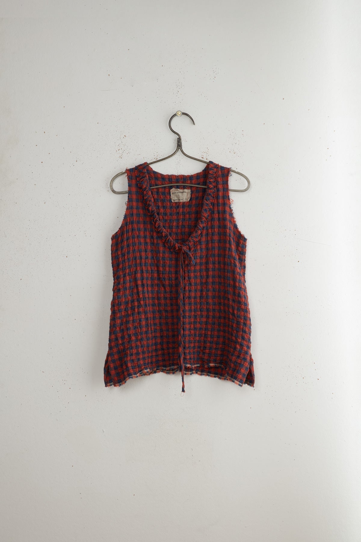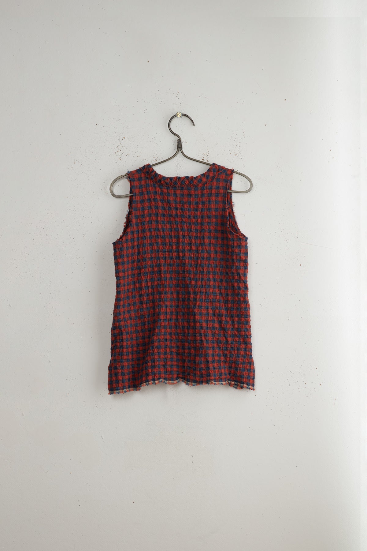 Silavi shrinky check tank top by Maya Zukerman is a super soft sleeveless shirt with a relaxed fit and a deep v-neck. Made of a stretchy crinkled cotton with a checked pattern, the neck is laced with drawstring from the same material, making it both adjustable and chic. Details include raw hems and arm holes and small side slits.