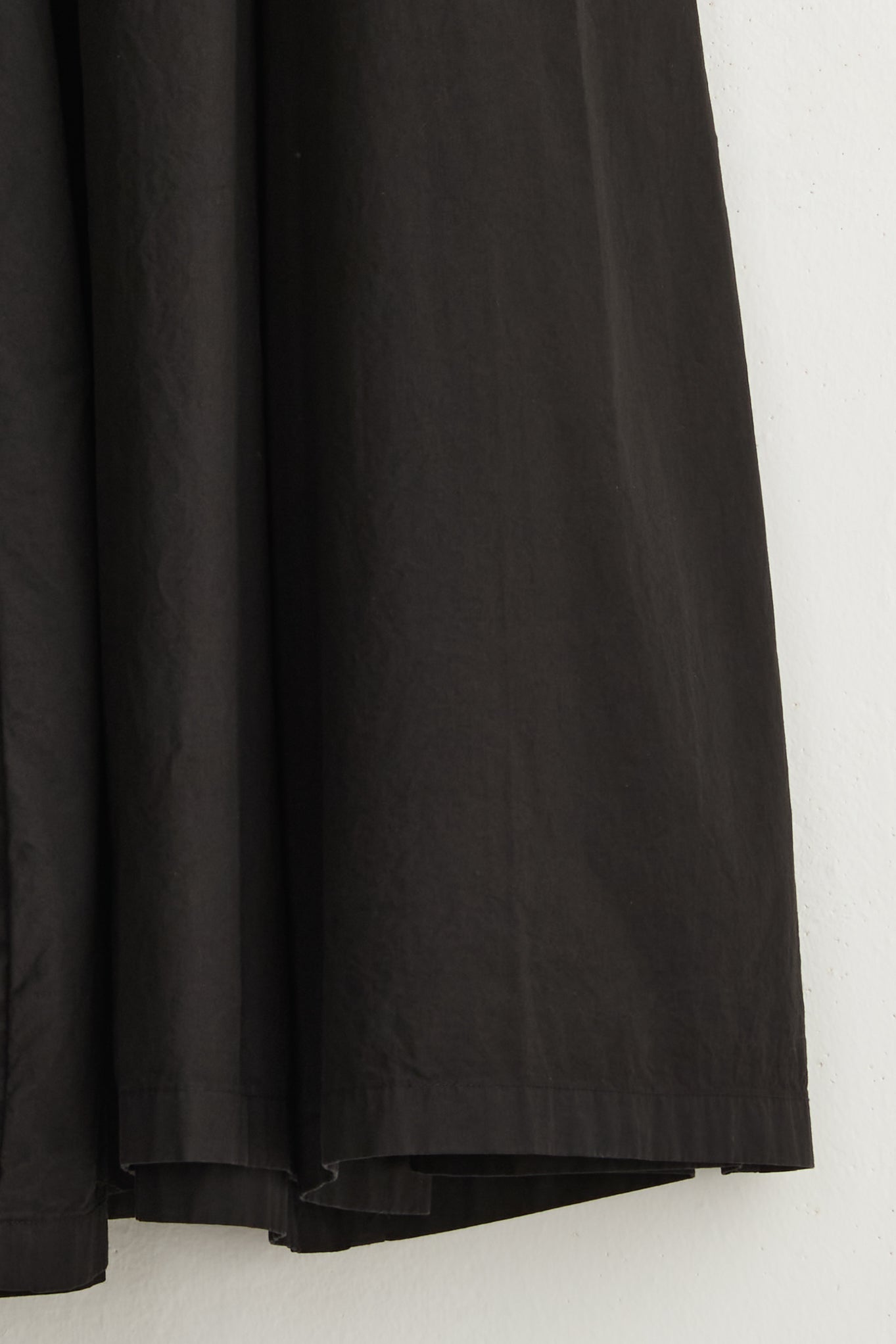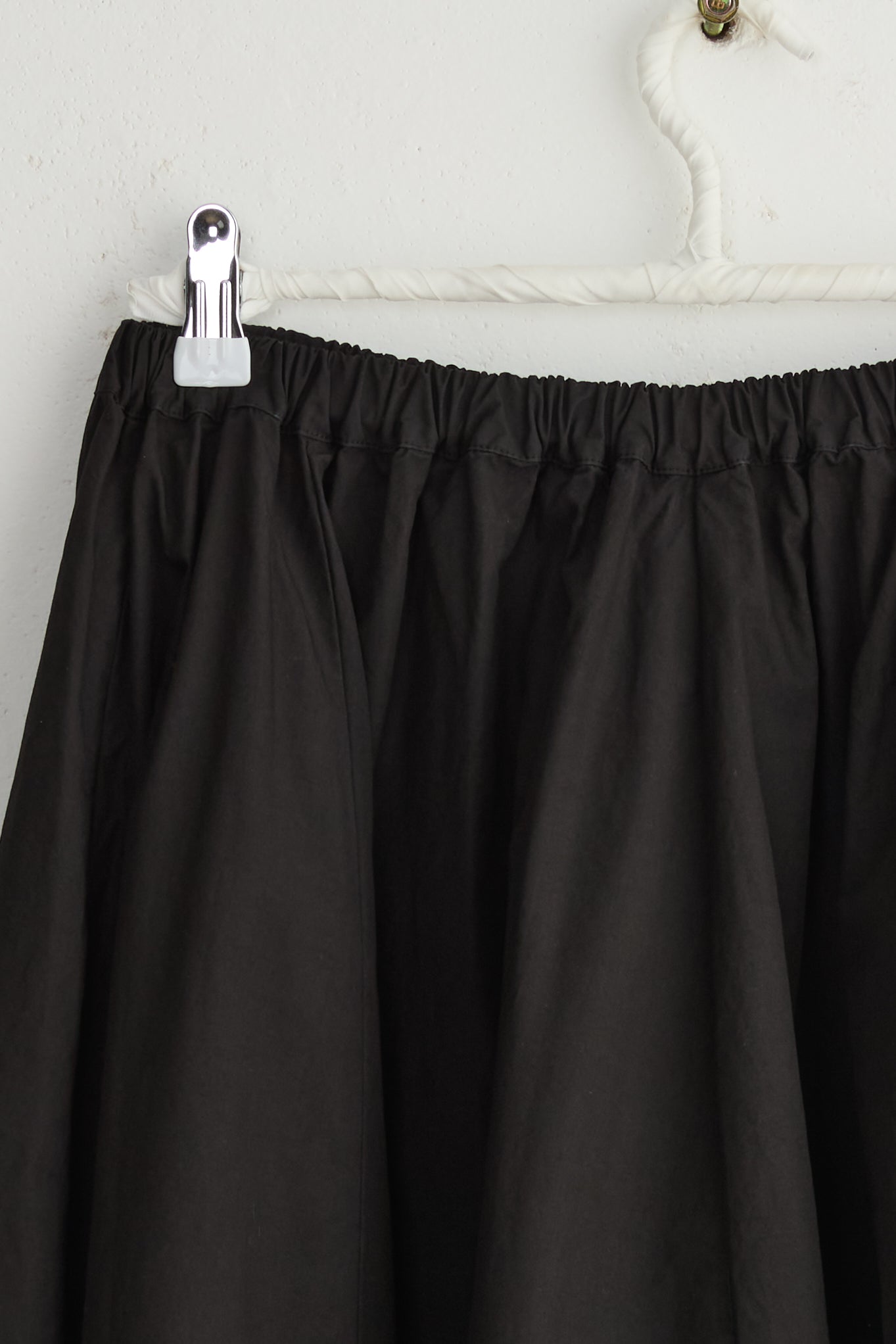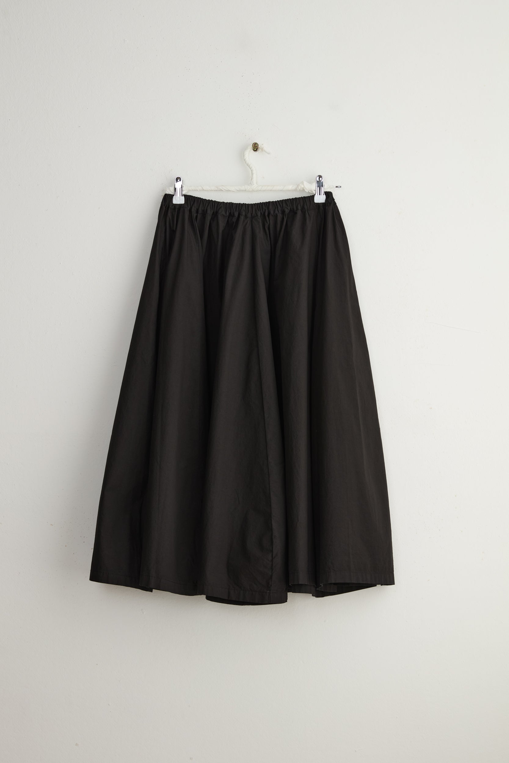 Lala skirt by by Manuelle Guibal. A calf-length classic flared skirt made of a crisp cotton poplin. featuring an elastic waistband and gathers at the waist. Finished with two side pockets and a full skirt.