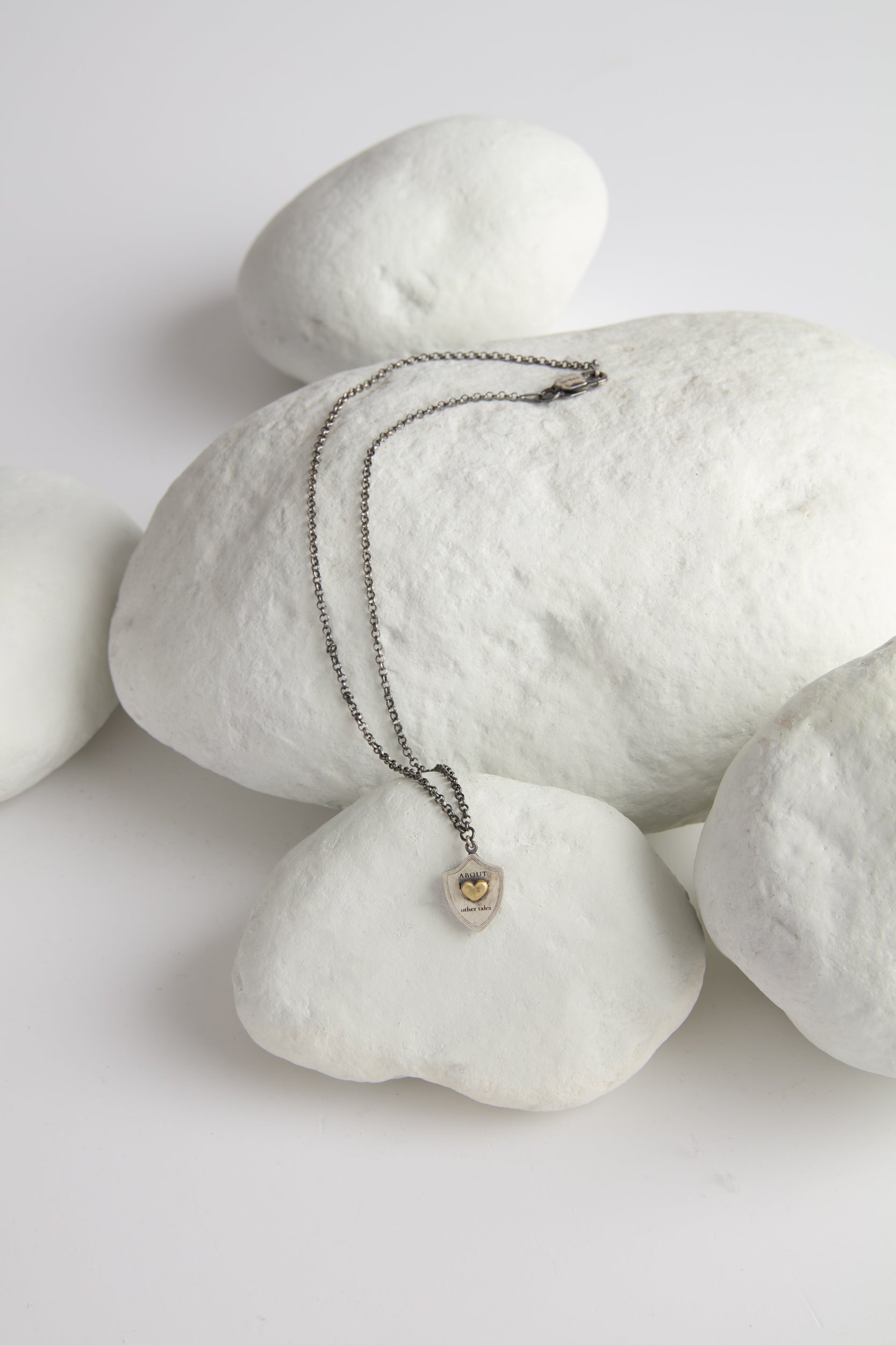 Golden heart shield necklace by TÓ GARAL. A sterling silver and gold pendant necklace. A shield shaped pendant with a small golden heart relief and an engraved inscription.