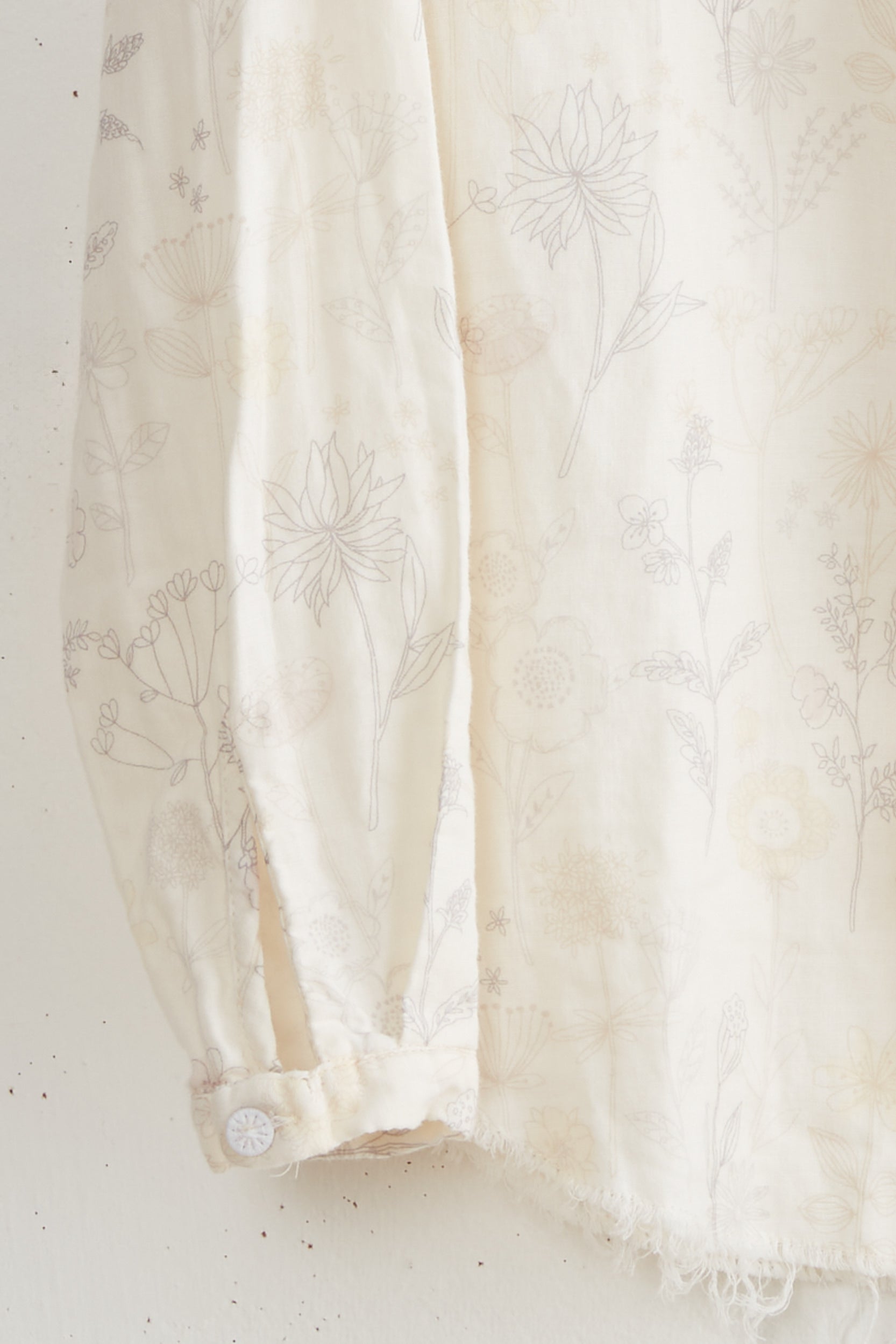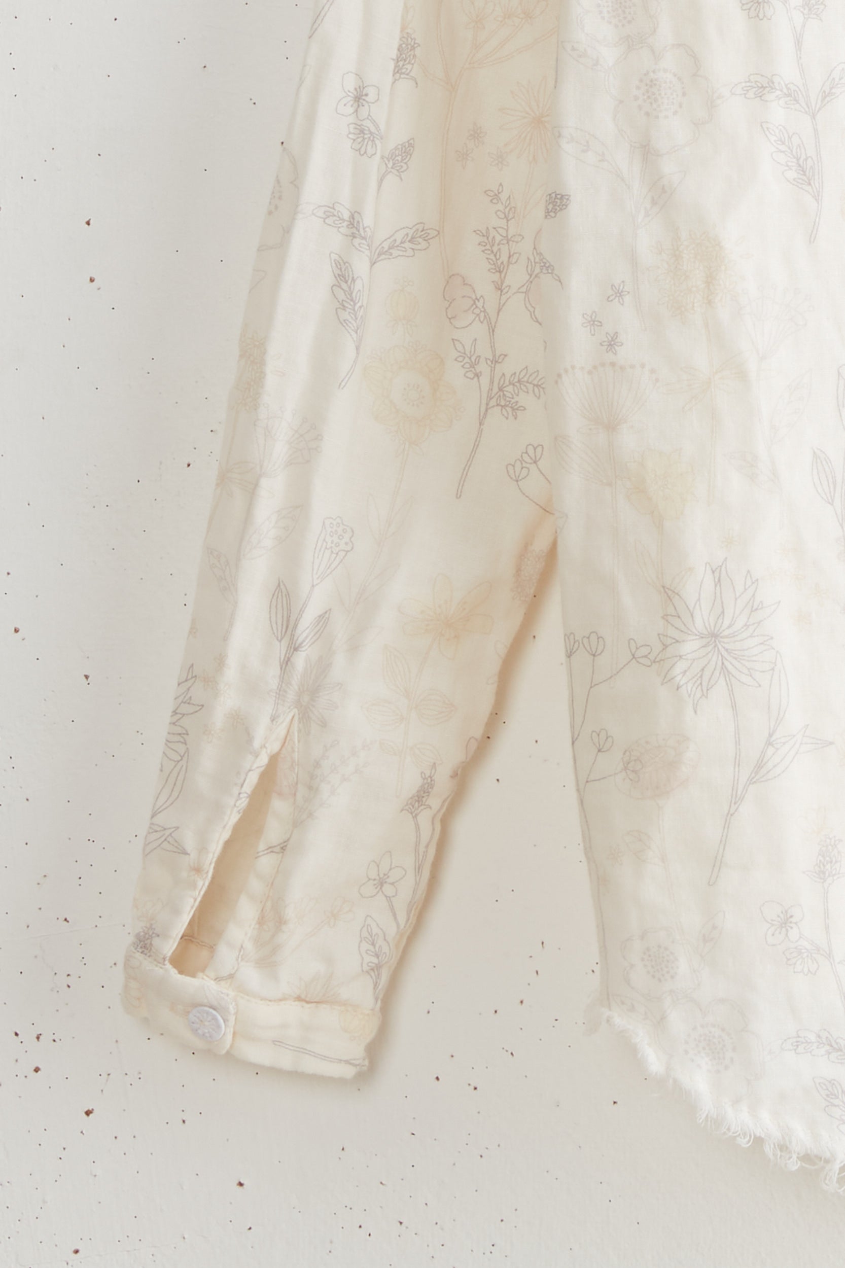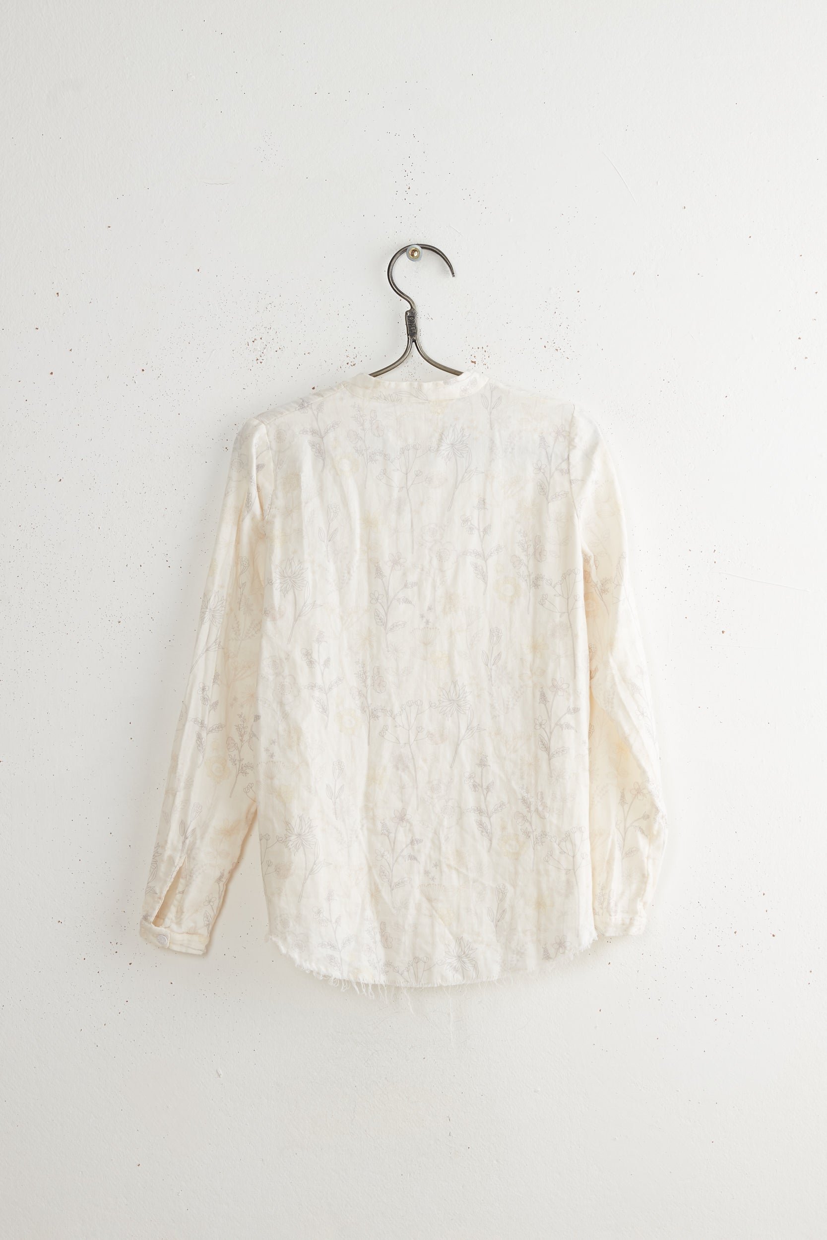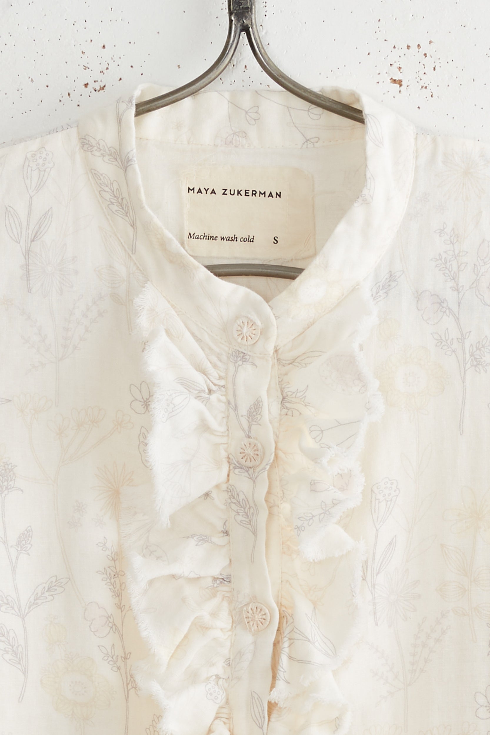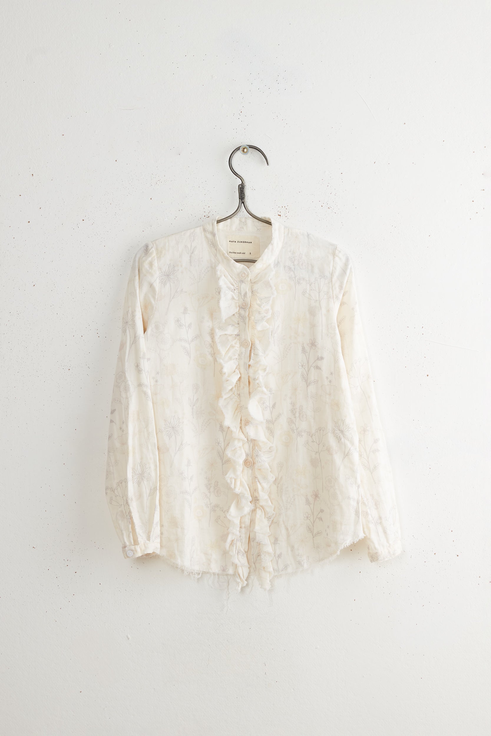Tin ruffle shirt by Maya Zukerman is a double cloth blouse with a mandarin collar and ruffled Dorset button closure. This blouse has a regular fit with Raw edged round hems and cuffed sleeves.