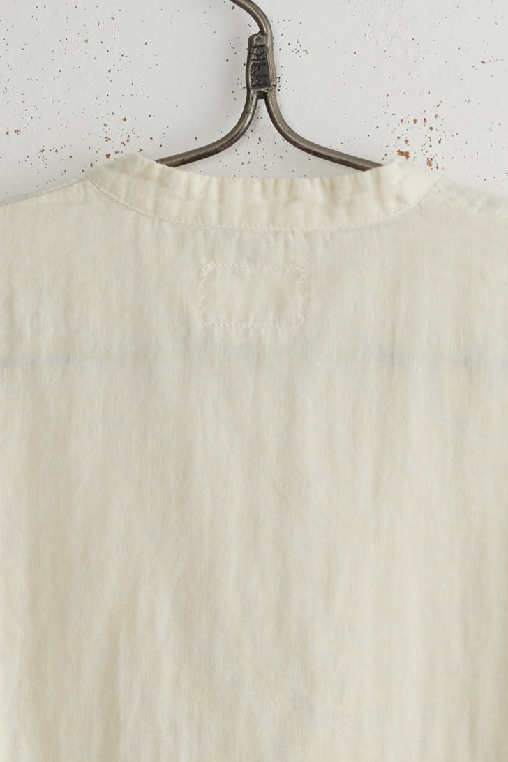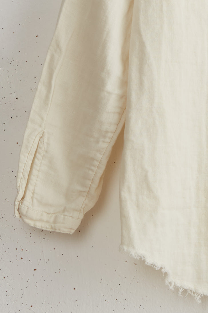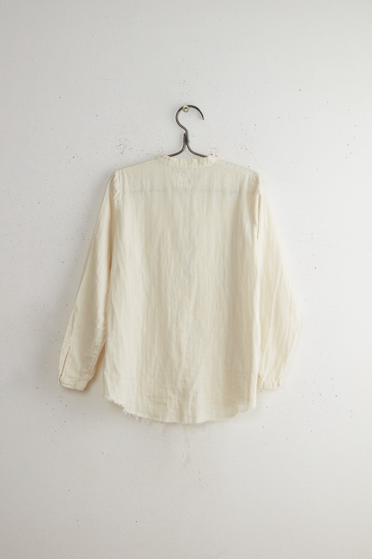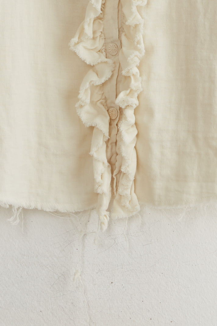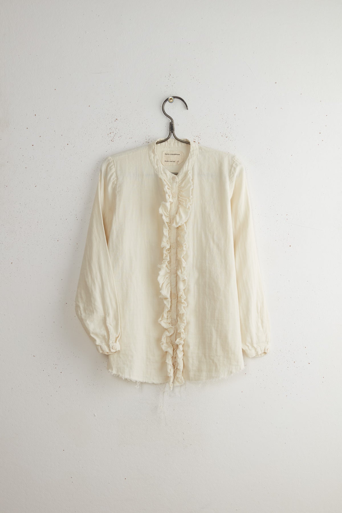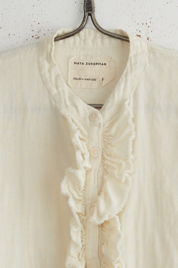 Tin ruffle shirt by Maya Zukerman is a double cloth blouse with a mandarin collar and ruffled Dorset button closure. This blouse has a regular fit with Raw edged round hems and cuffed sleeves.