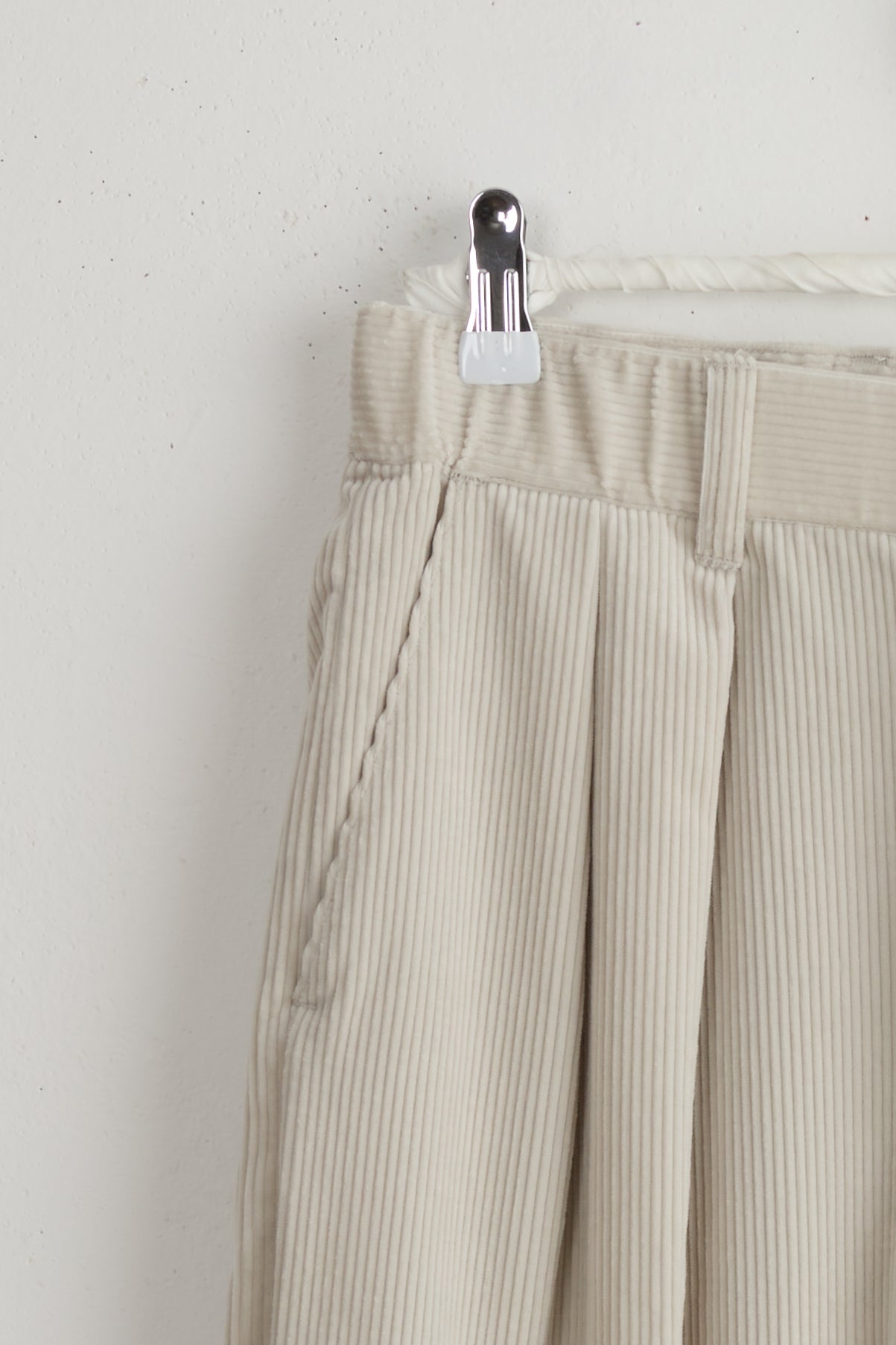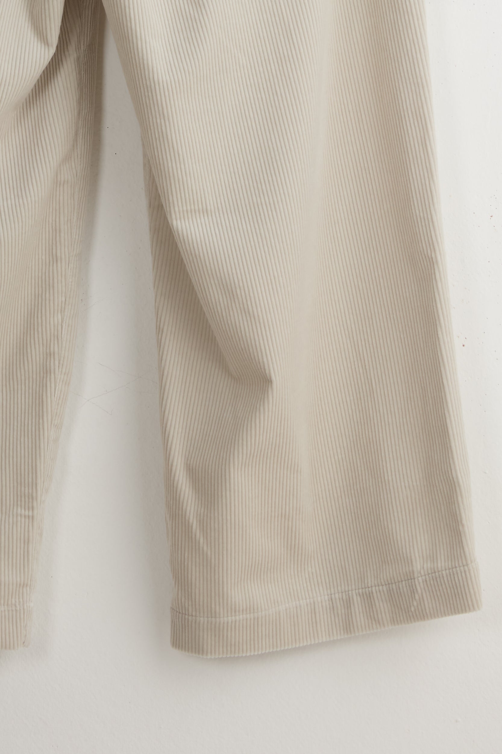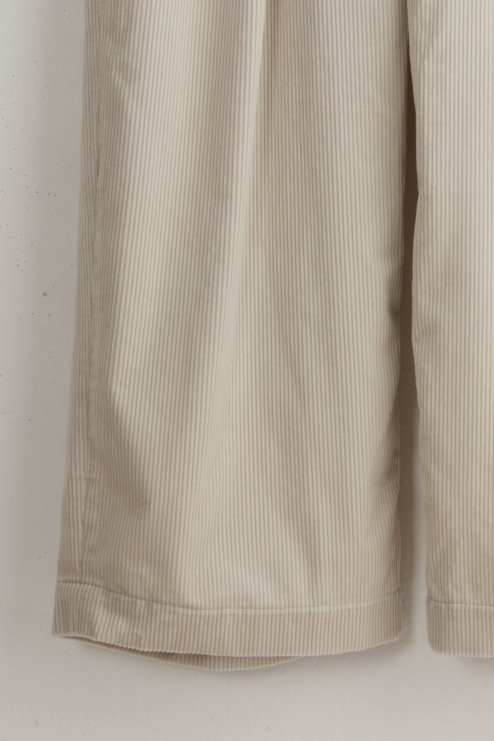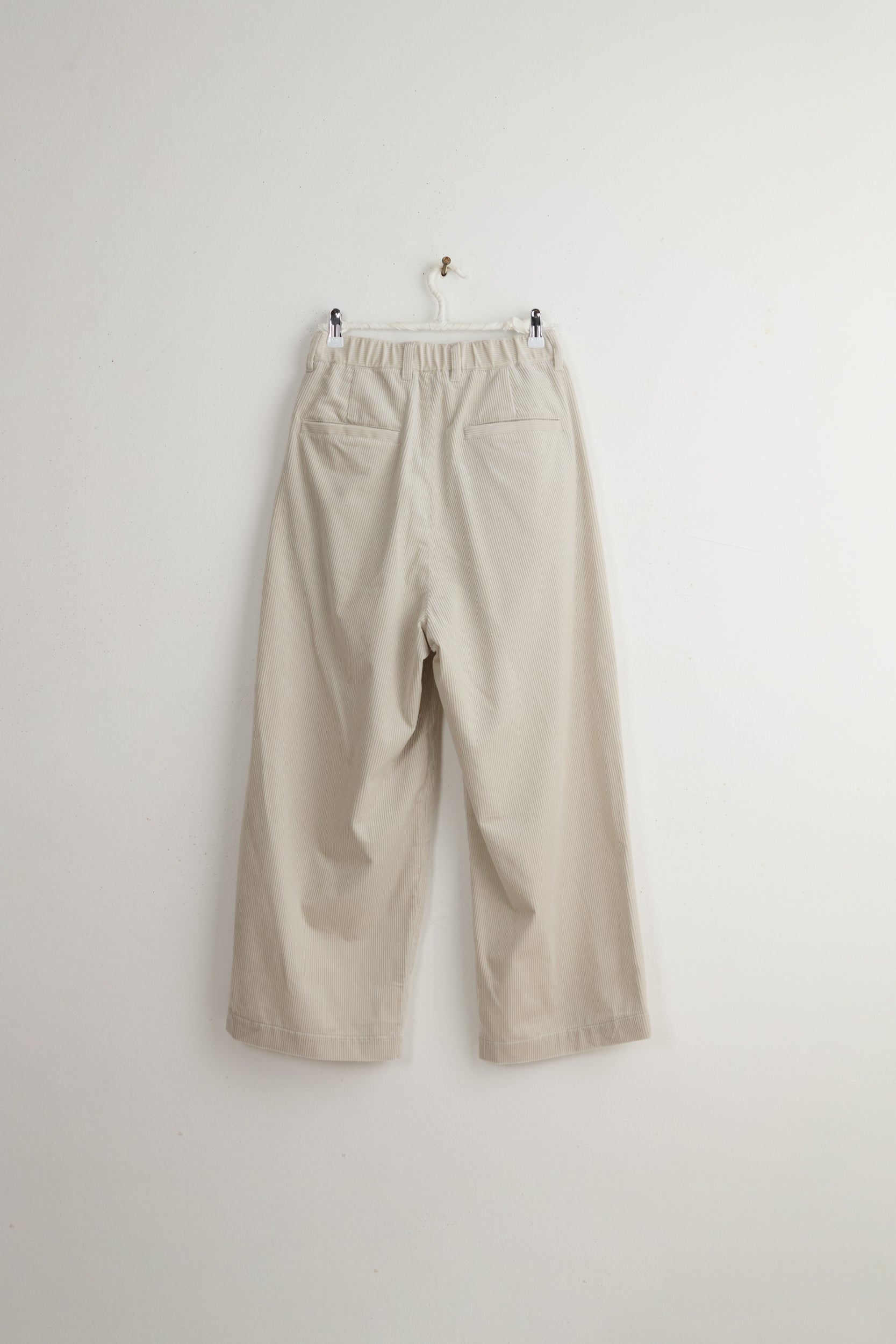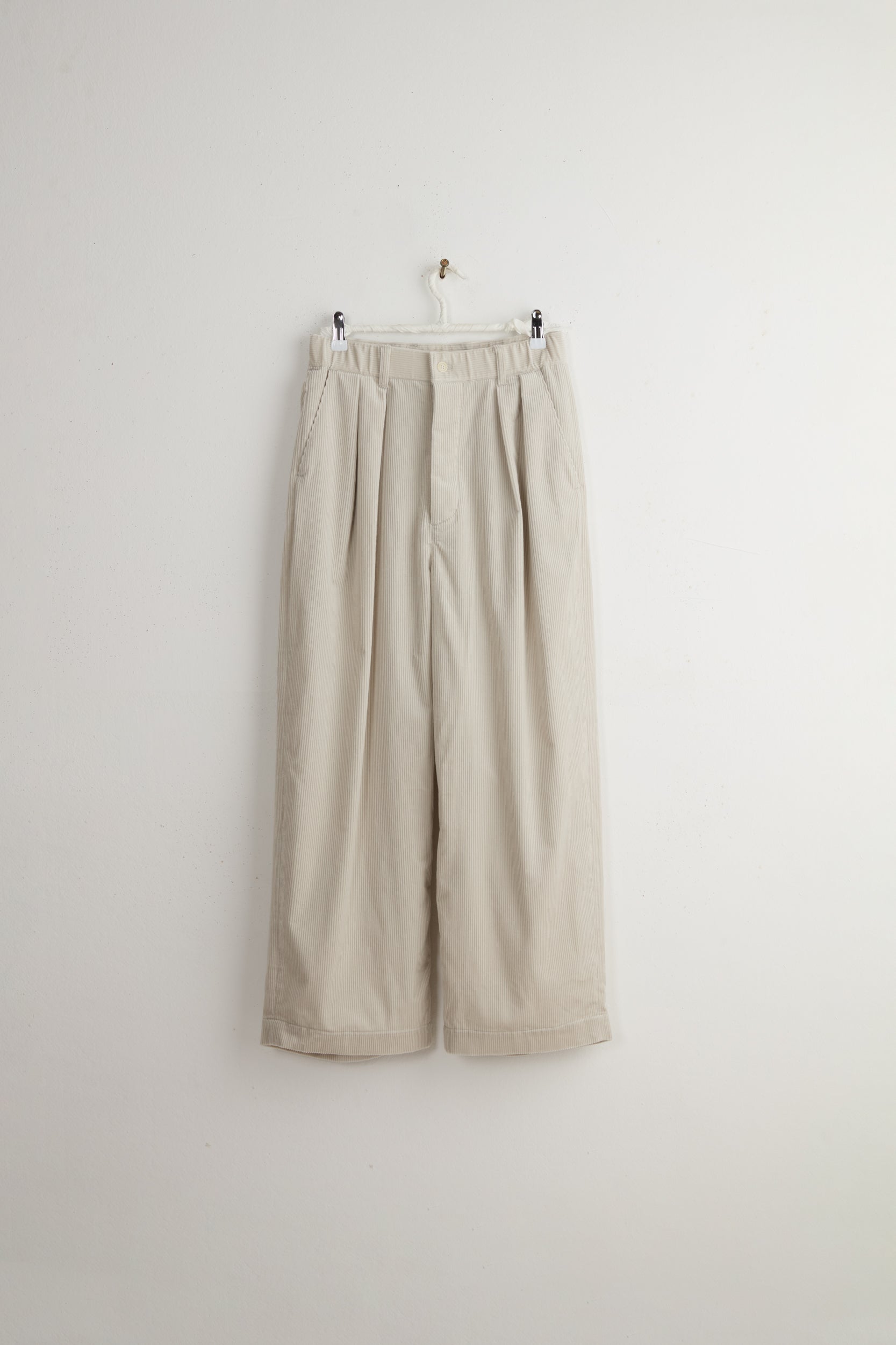 2 Pleat Baggy Pants by TOUJOURS. Pleated wide leg pants made of a soft, droopy corduroy wide wale cotton cloth. slightly cropped inseam with two front pleats, angled side pockets, welt back pockets and a mock fly button fastening with waist elasticized at the back. Can be worn as a set with the matching Sack jacket.