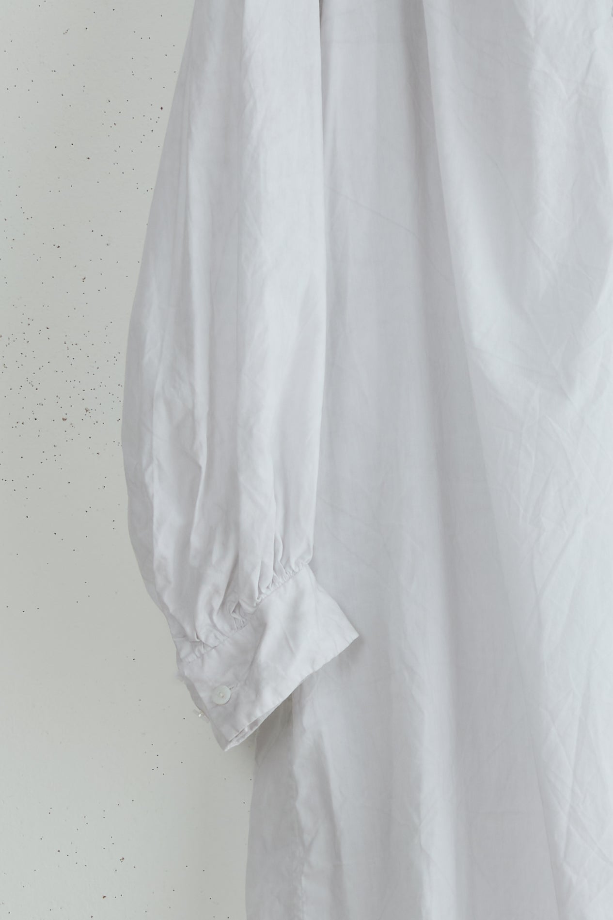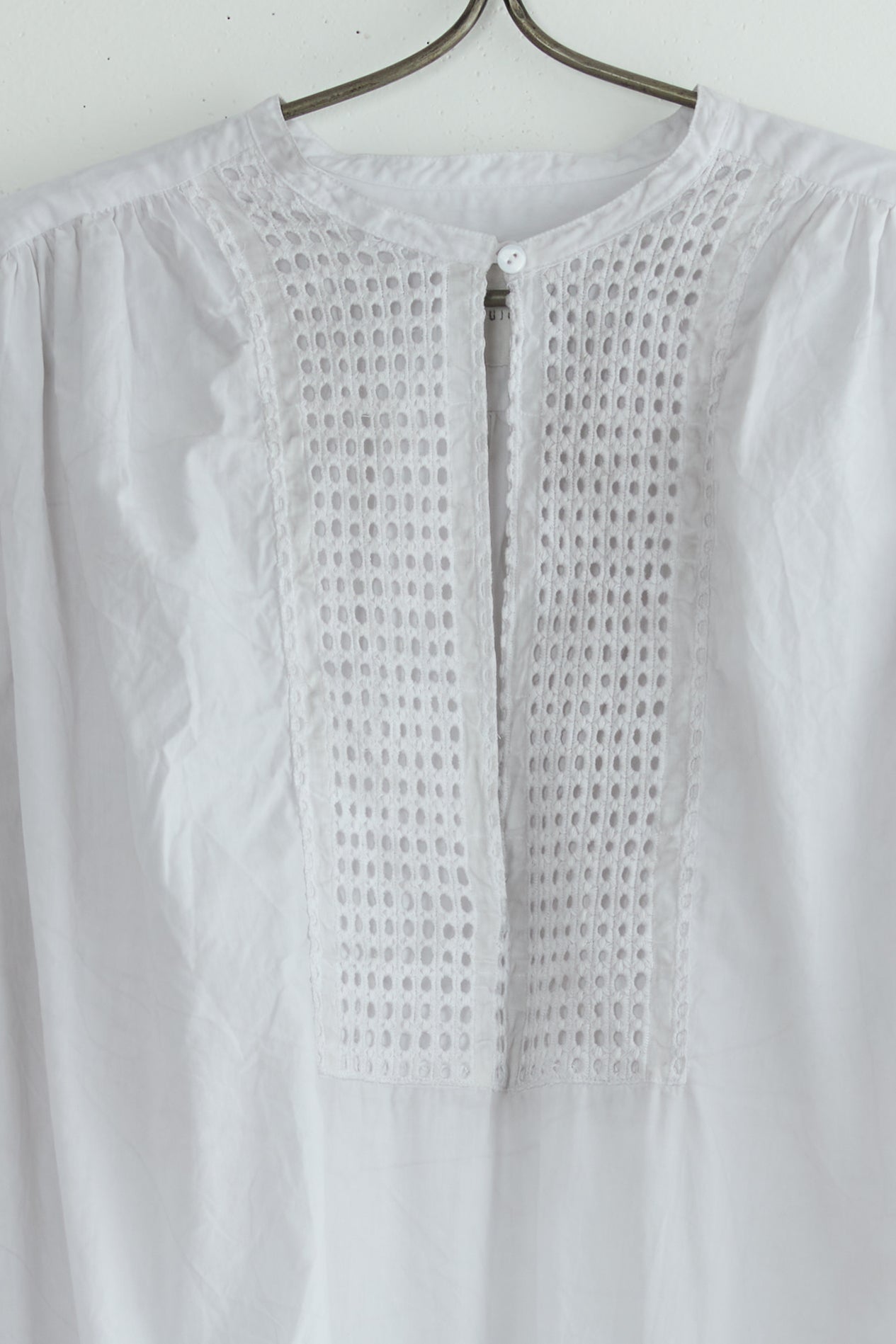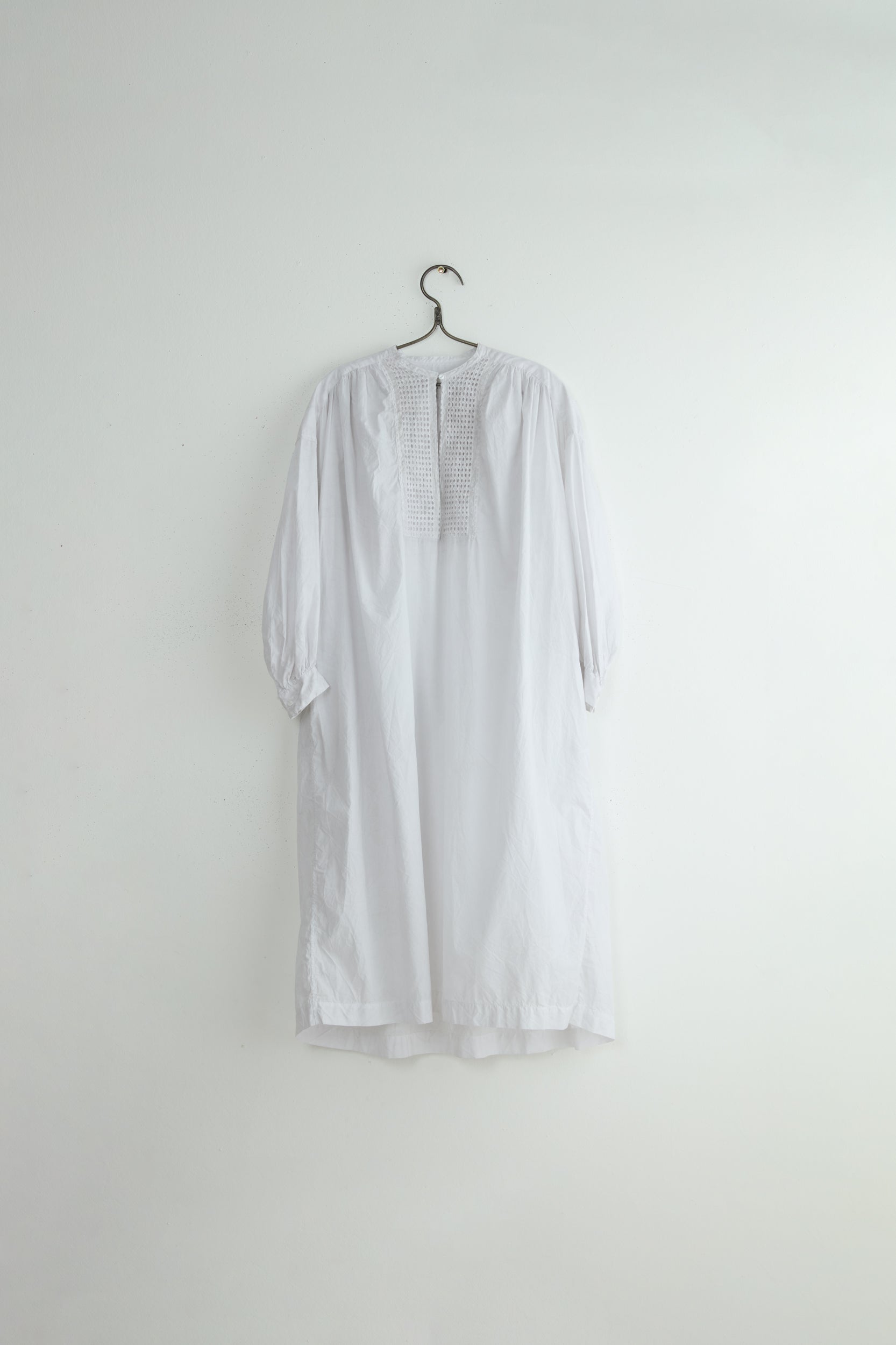 Natural dye lace dress by TOUJOURS. A lightweight tunic dress made from naturally dyed wrinkle paper cotton cloth. Relaxed fit with gathered long sleeves, a round neckline with a button keyhole closure and a wide eyelet lace panel at front, dropped shoulders, side seam pockets, buttoned cuffs and gathered back yoke.